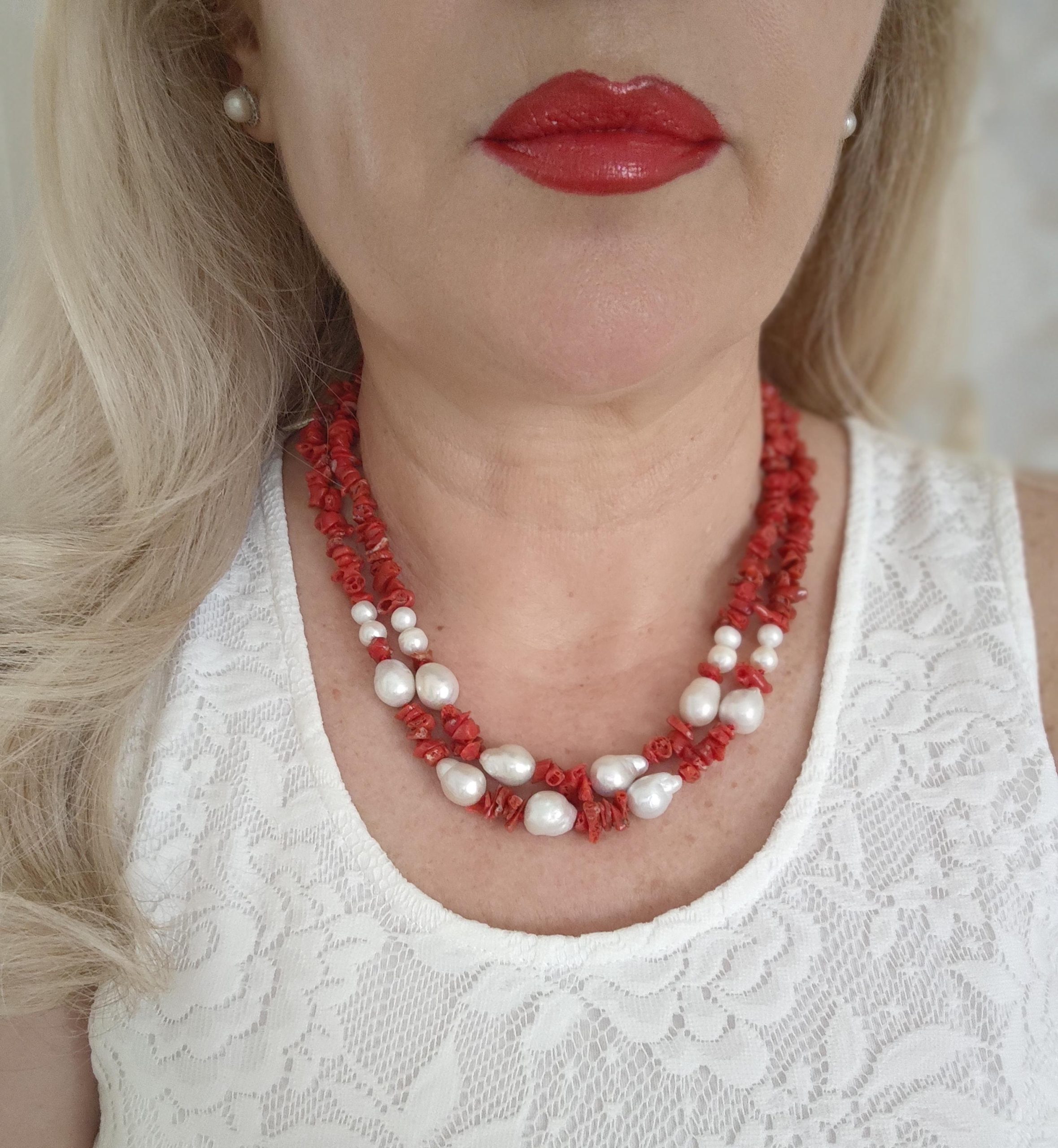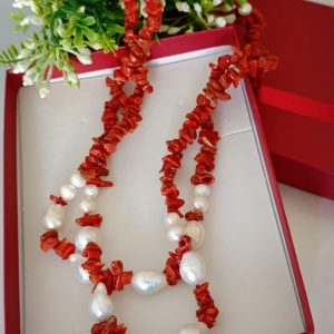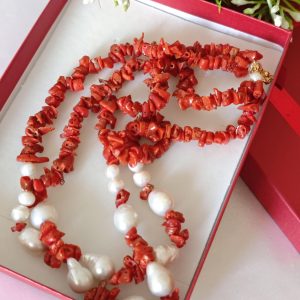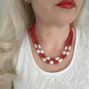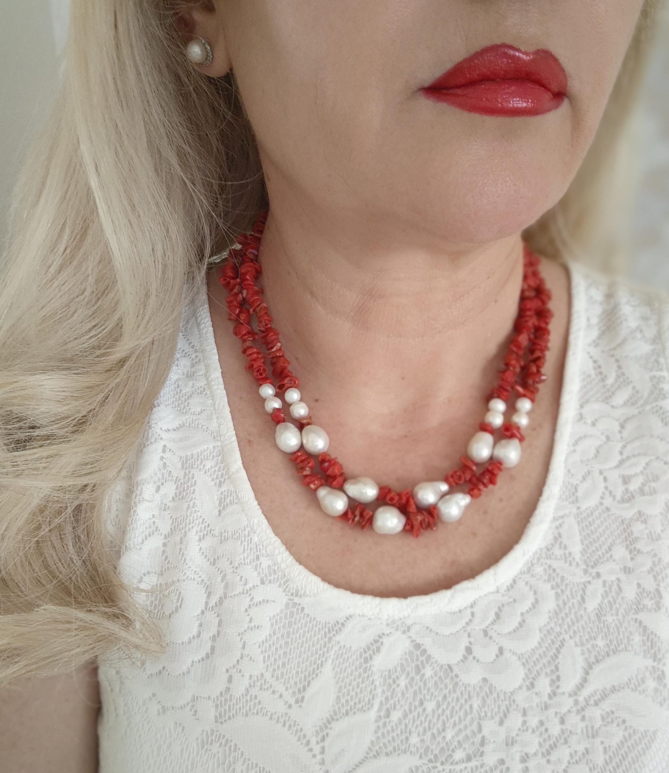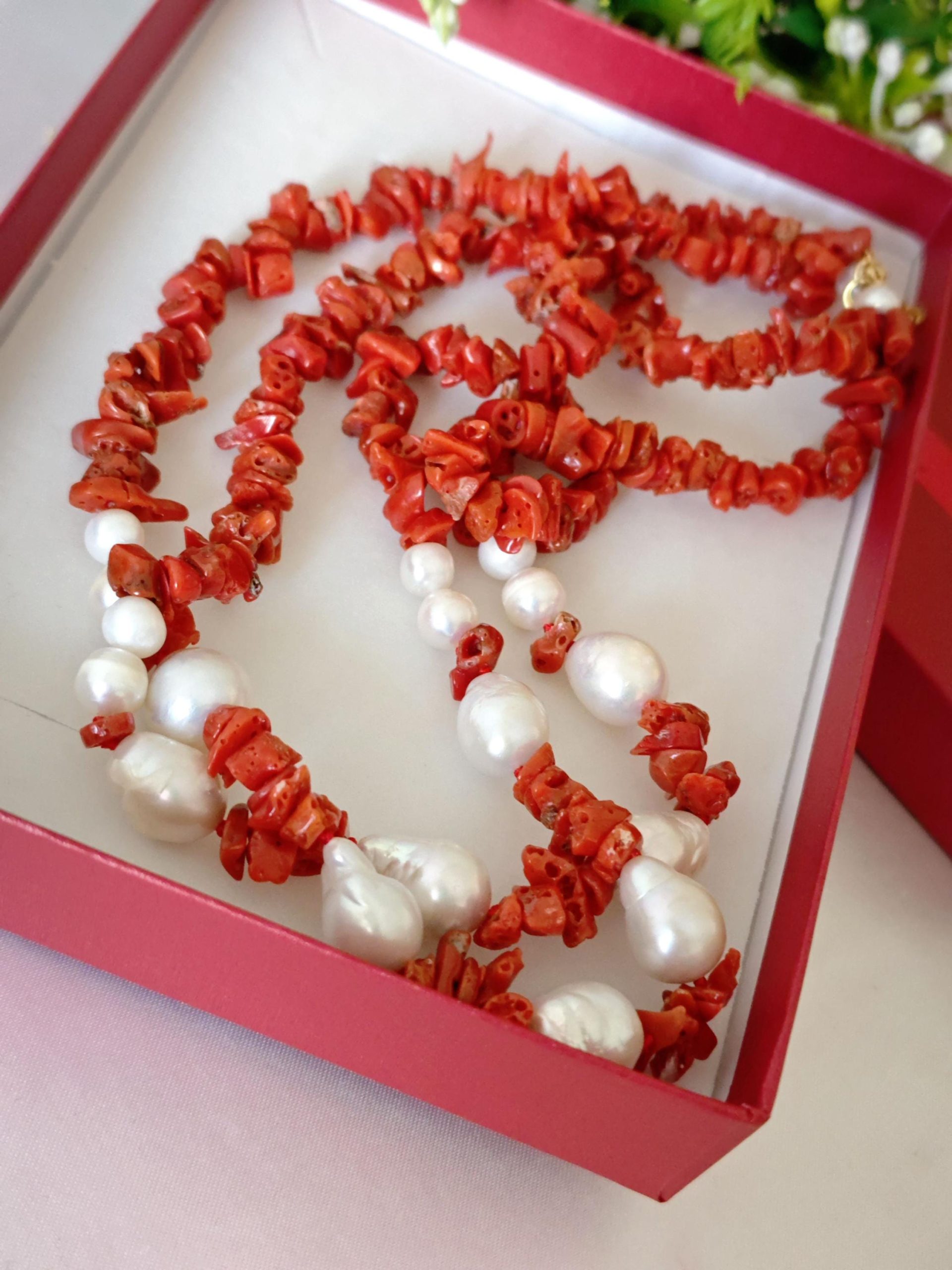 Collana girocollo a 2 fili in corallo rosso mediterraneo naturale e perle bianche naturali barocche.