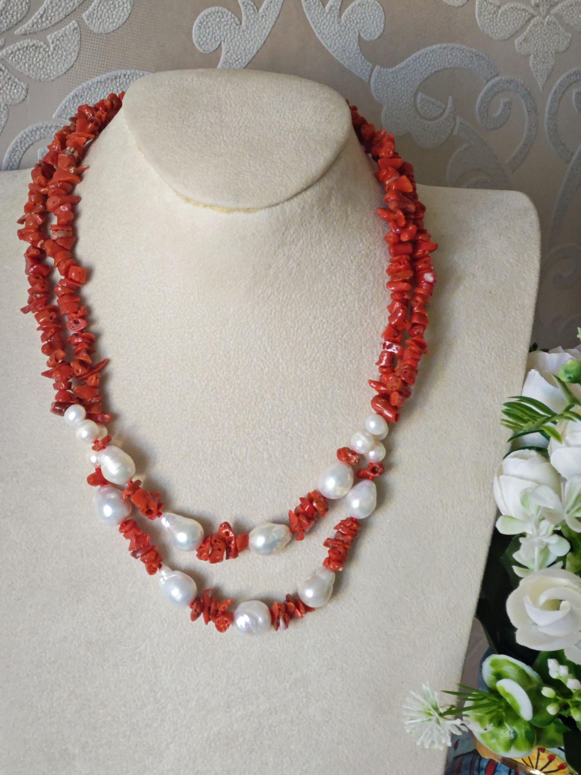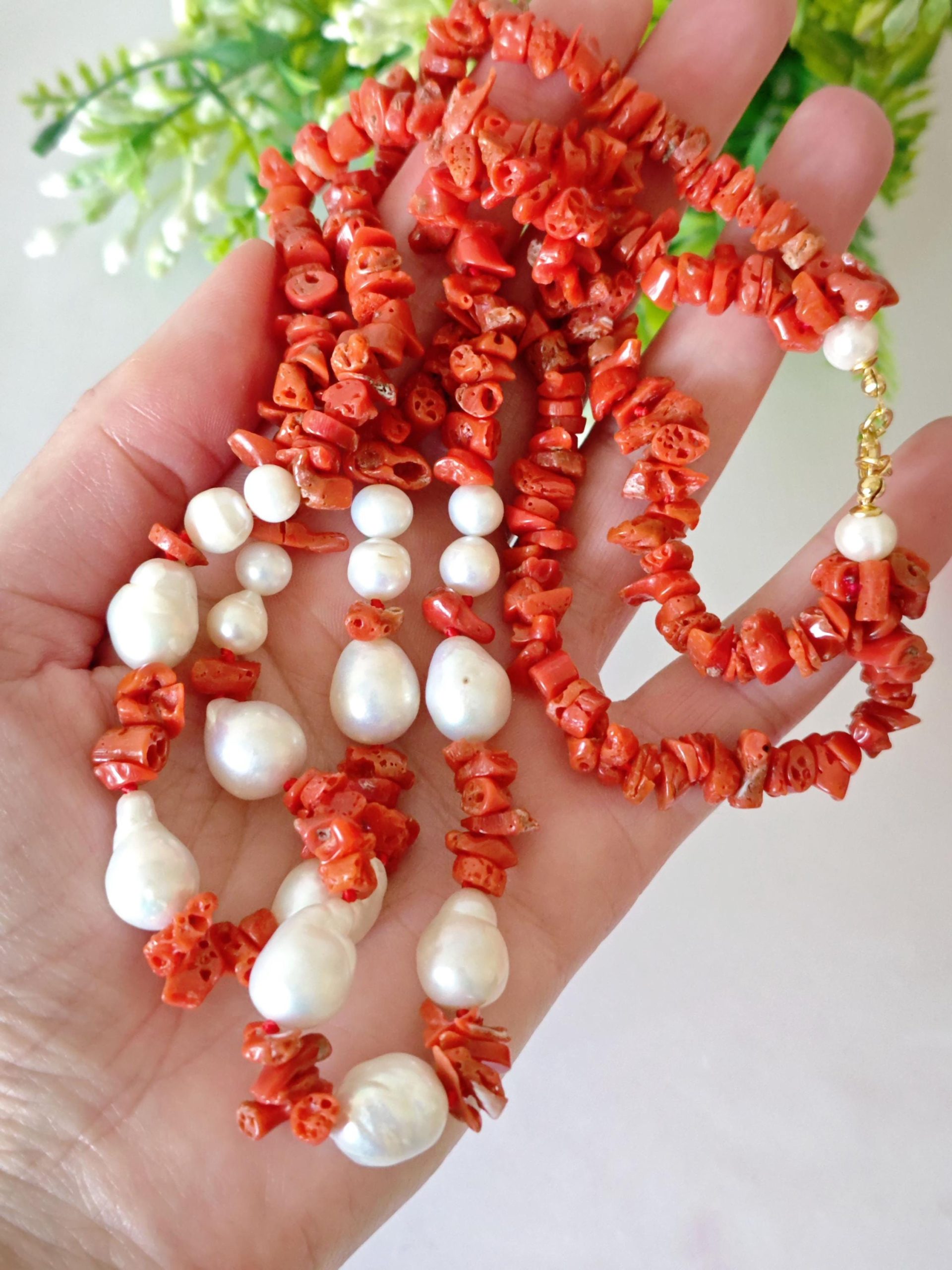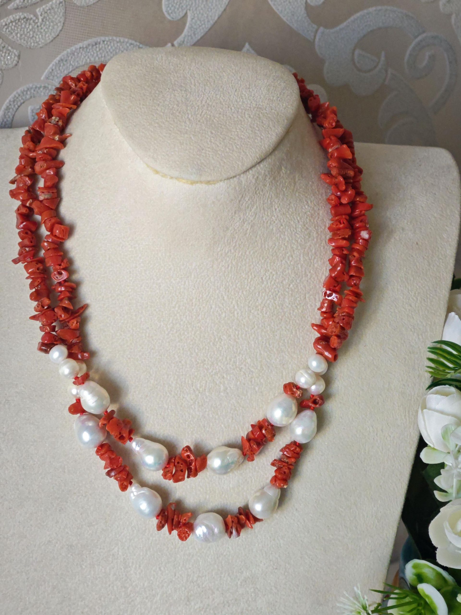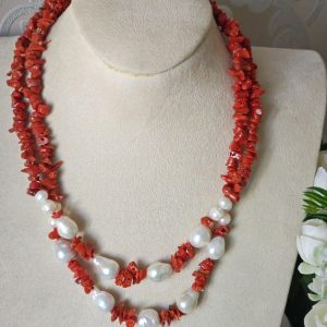 Collana girocollo a 2 fili in corallo rosso mediterraneo naturale e perle bianche naturali barocche.