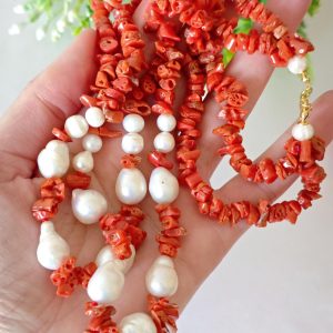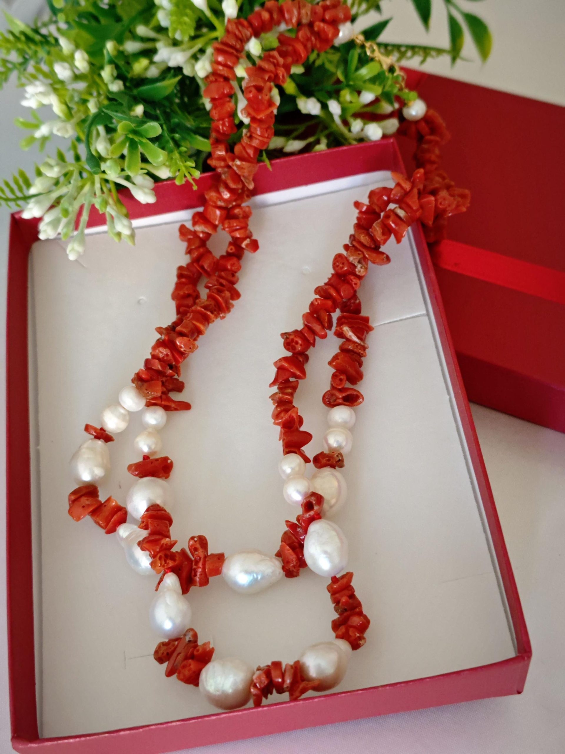Collana corallo rosso mediterraneo naturale a 2 fili con perle bianche barocche e argento 925 placcato oro, gioielli italiani