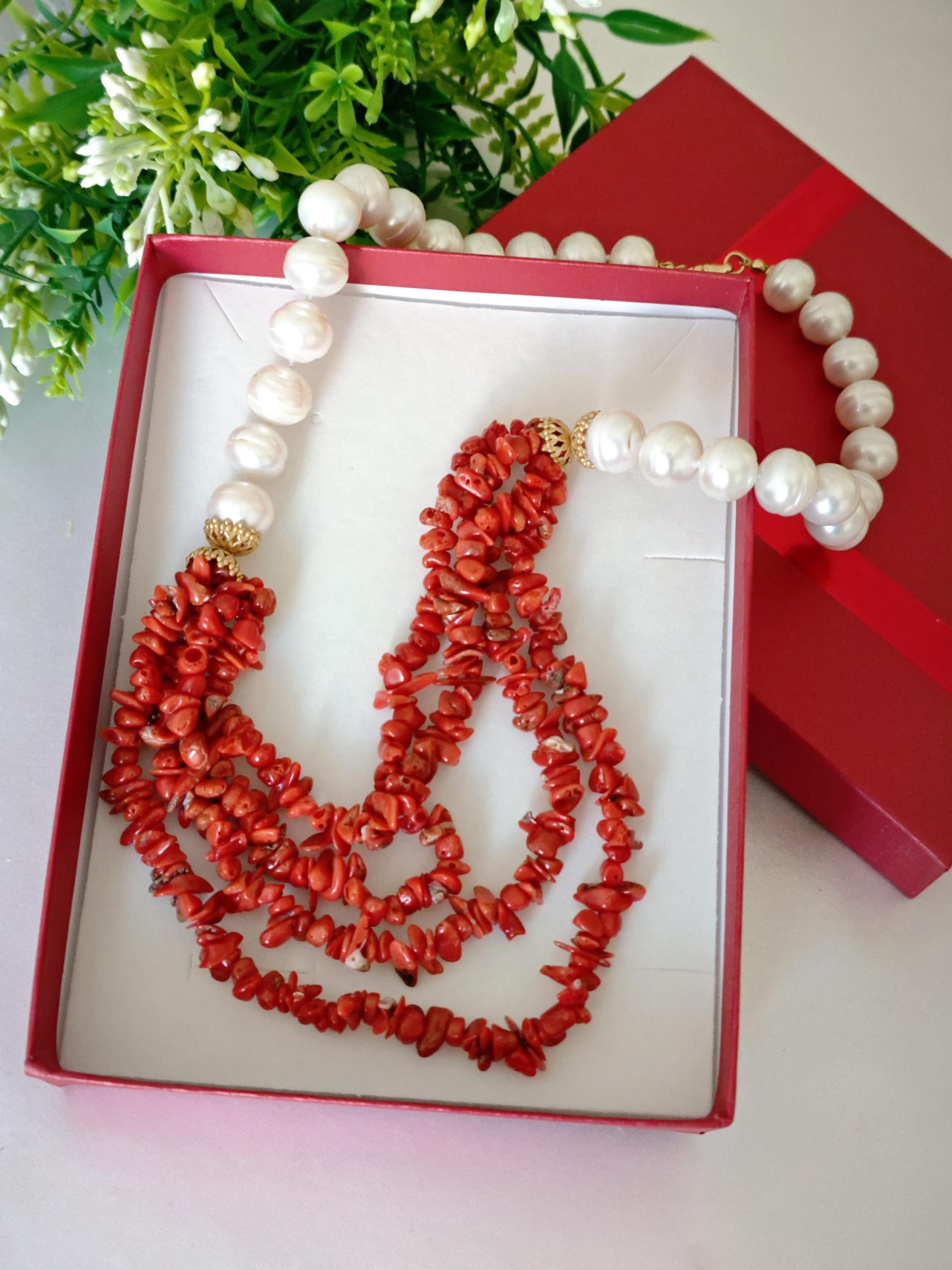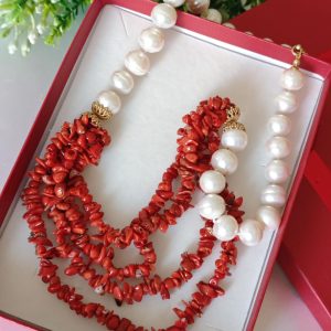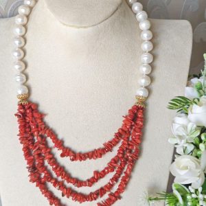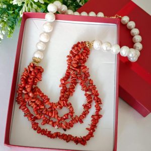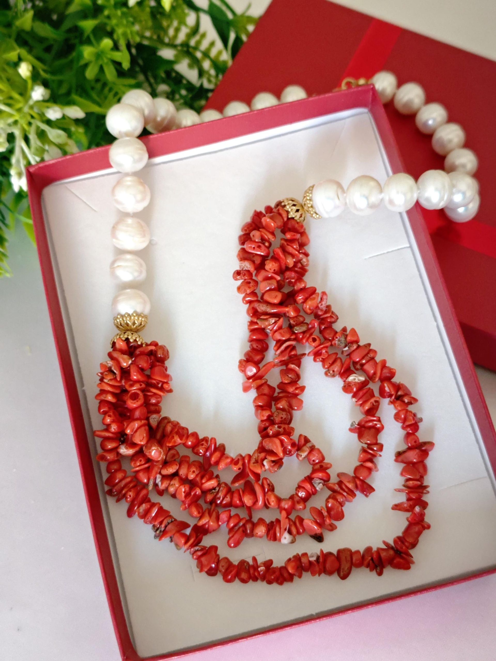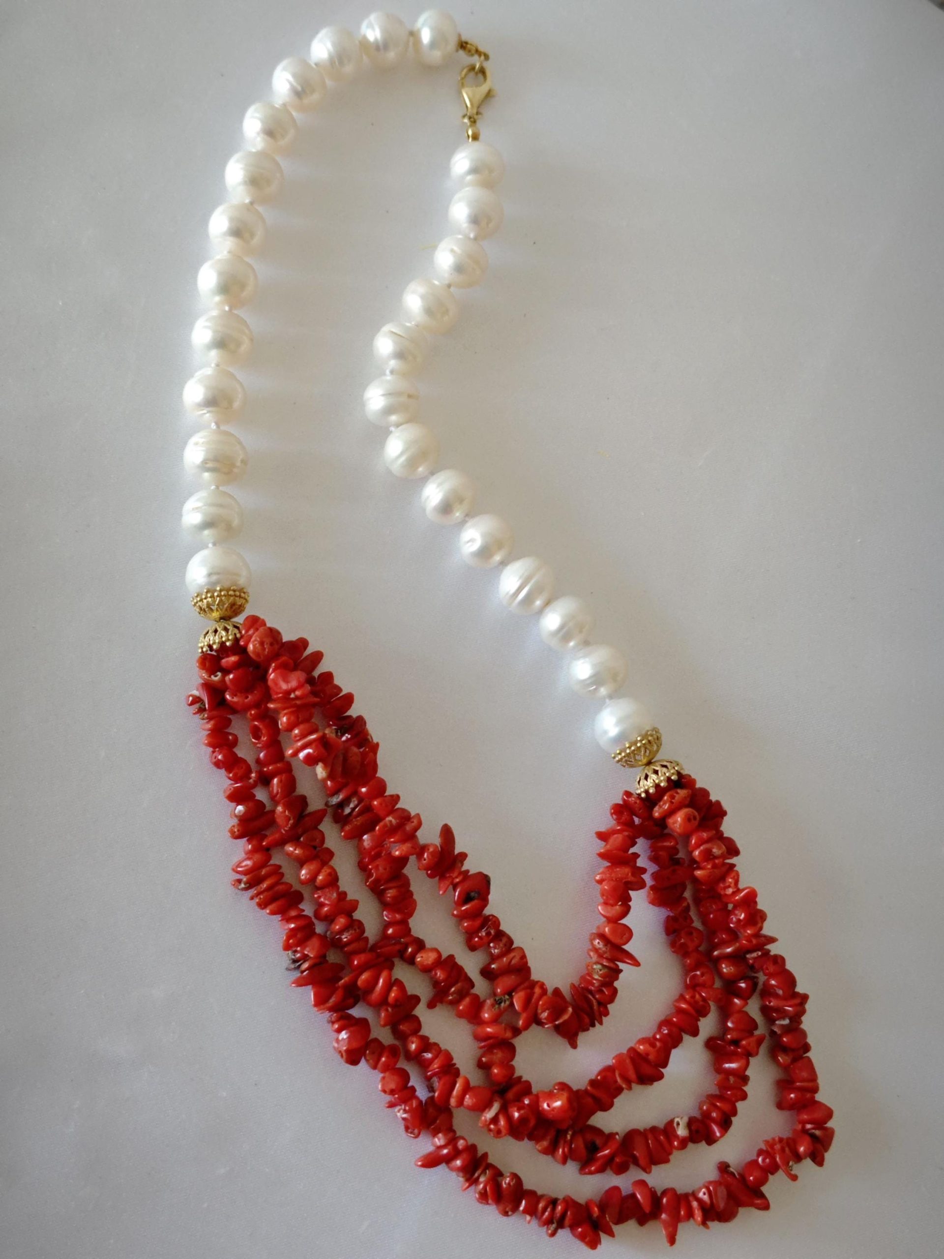 Collana girocollo a 3 fili in corallo rosso mediterraneo naturale e perle bianche naturali barocche 12 mm.