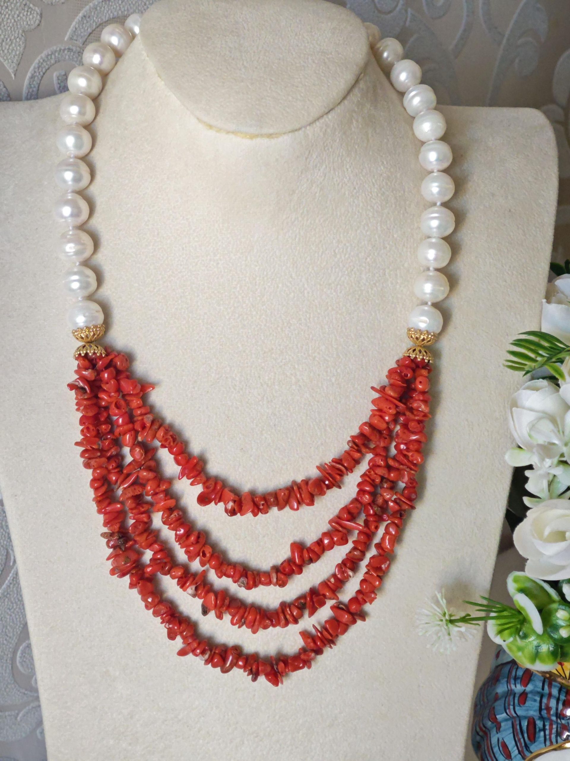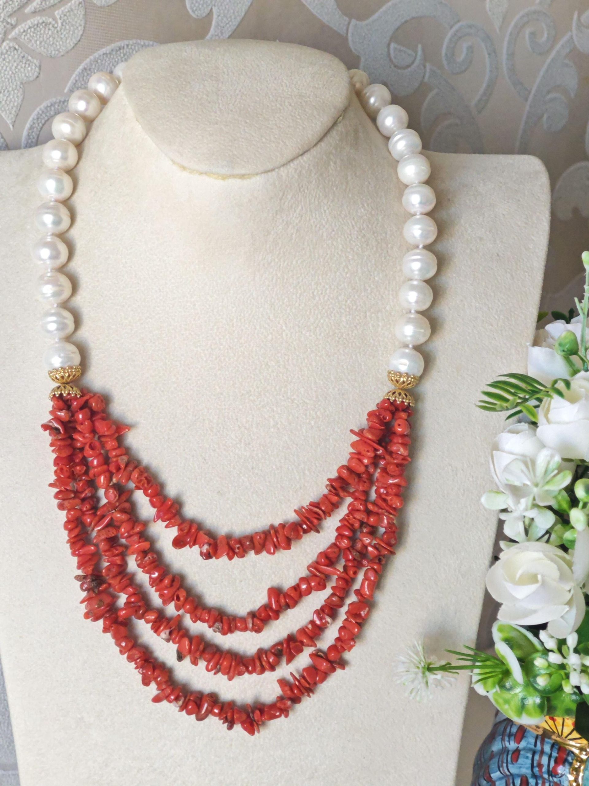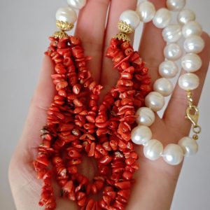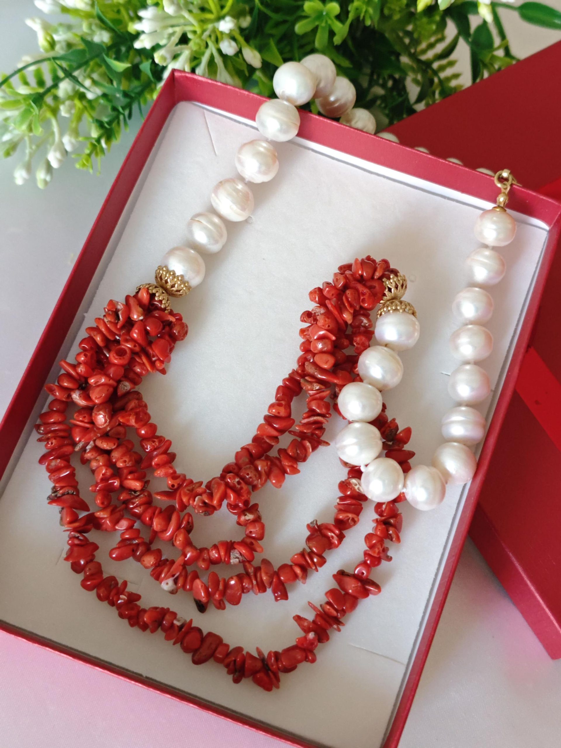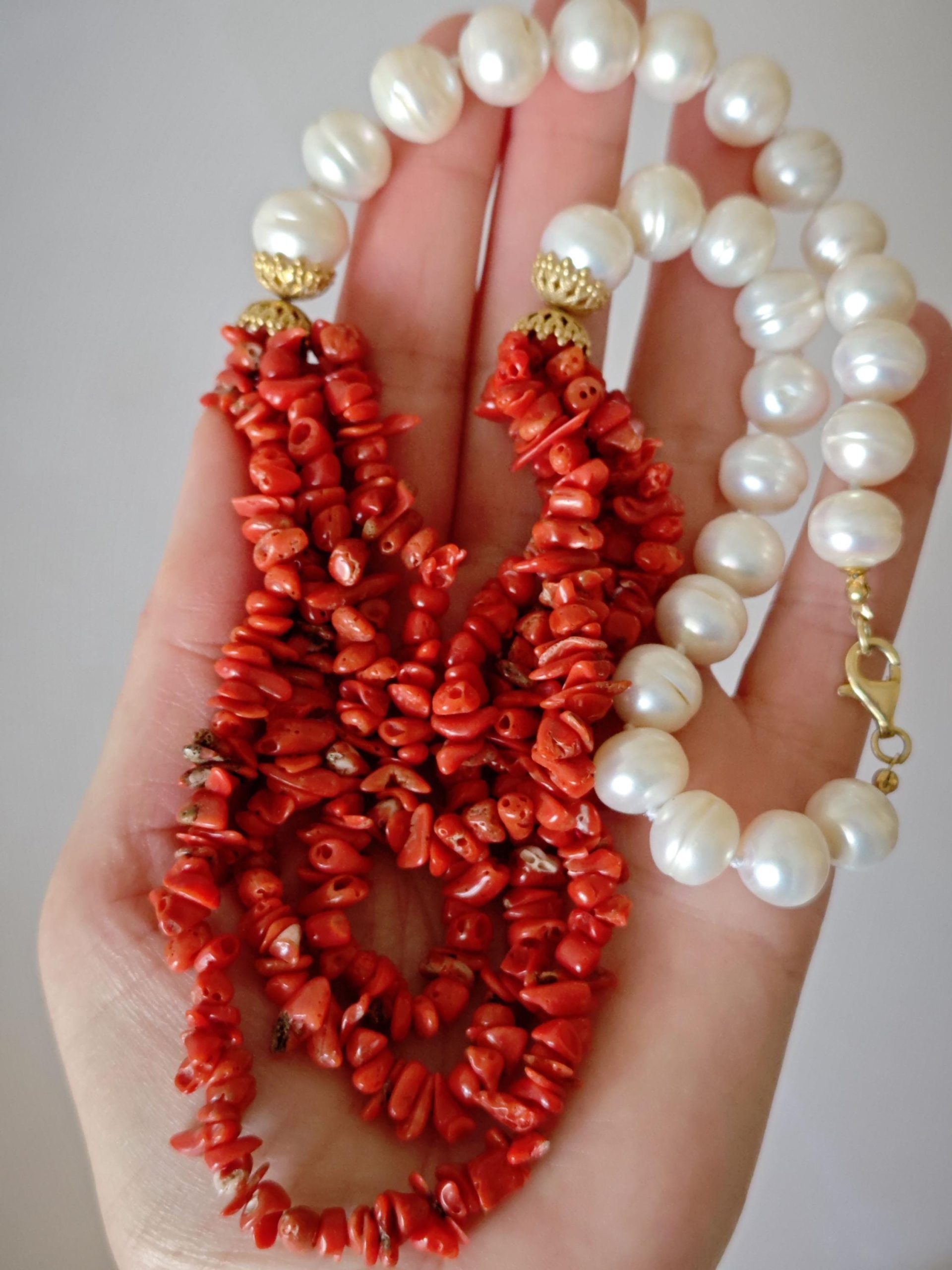 Collana girocollo a 3 fili in corallo rosso mediterraneo naturale e perle bianche naturali barocche 12 mm.