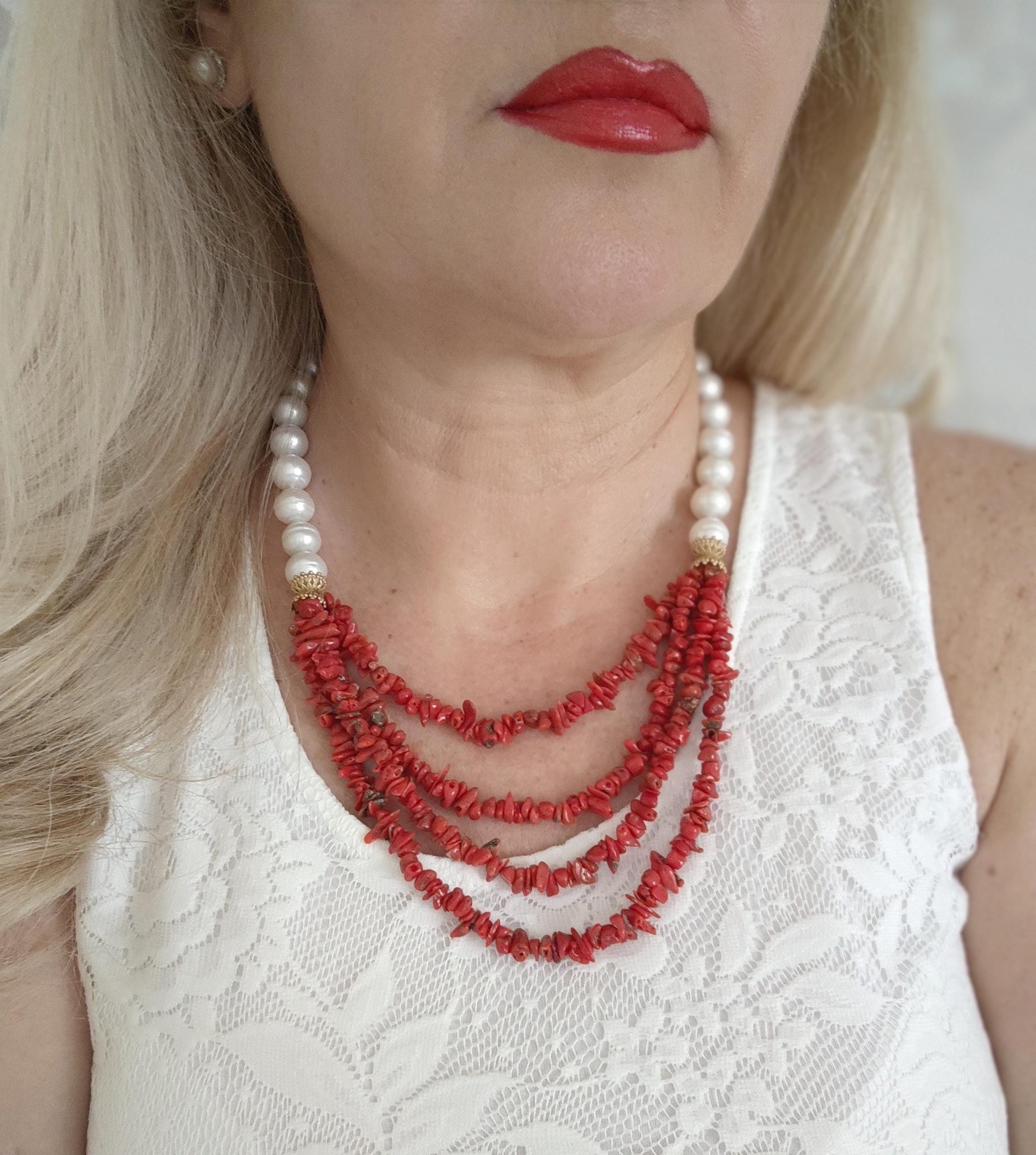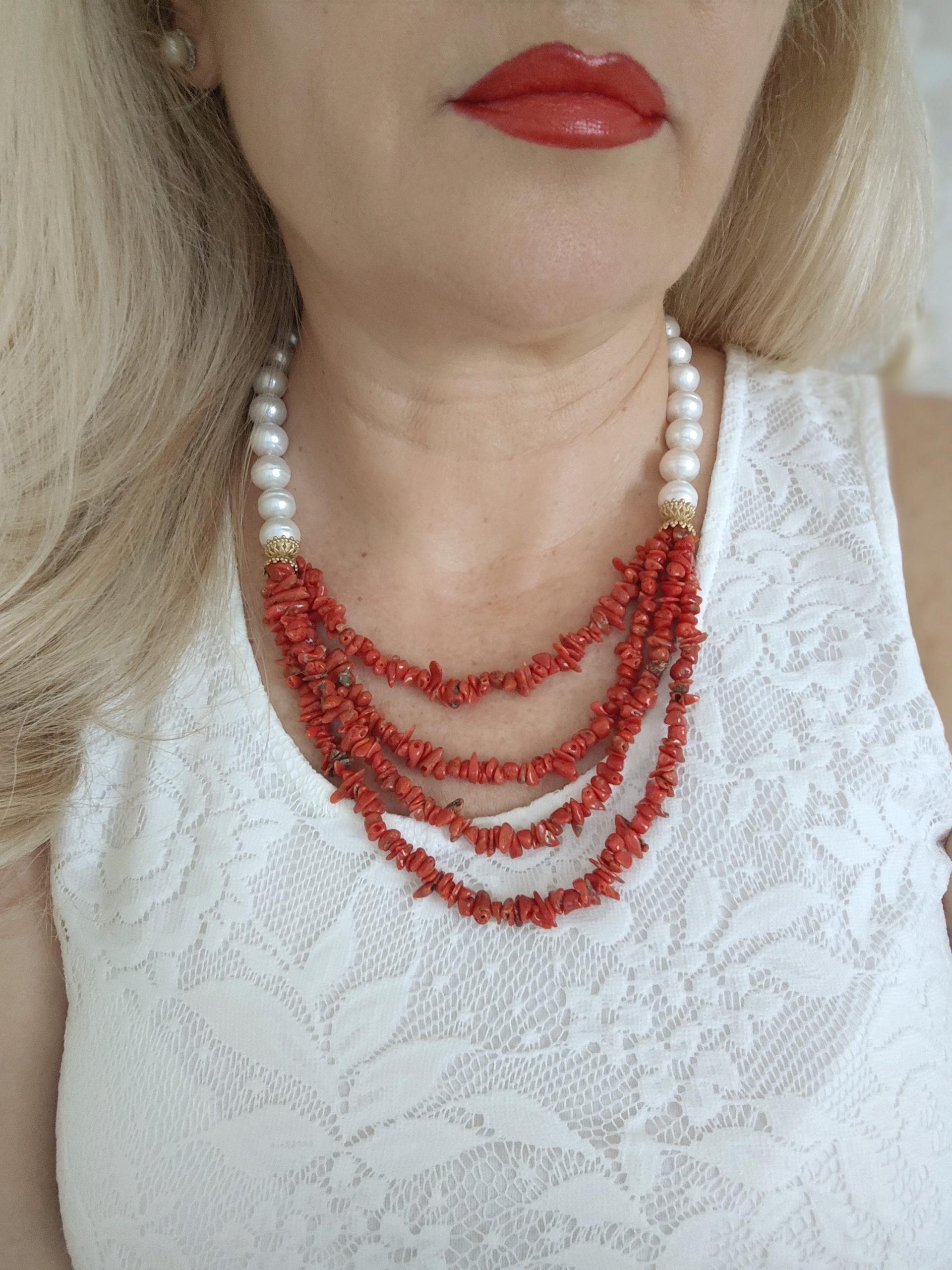 Collana corallo rosso mediterraneo naturale a 3 fili con perle bianche barocche e argento 925 placcato oro, gioielli italiani