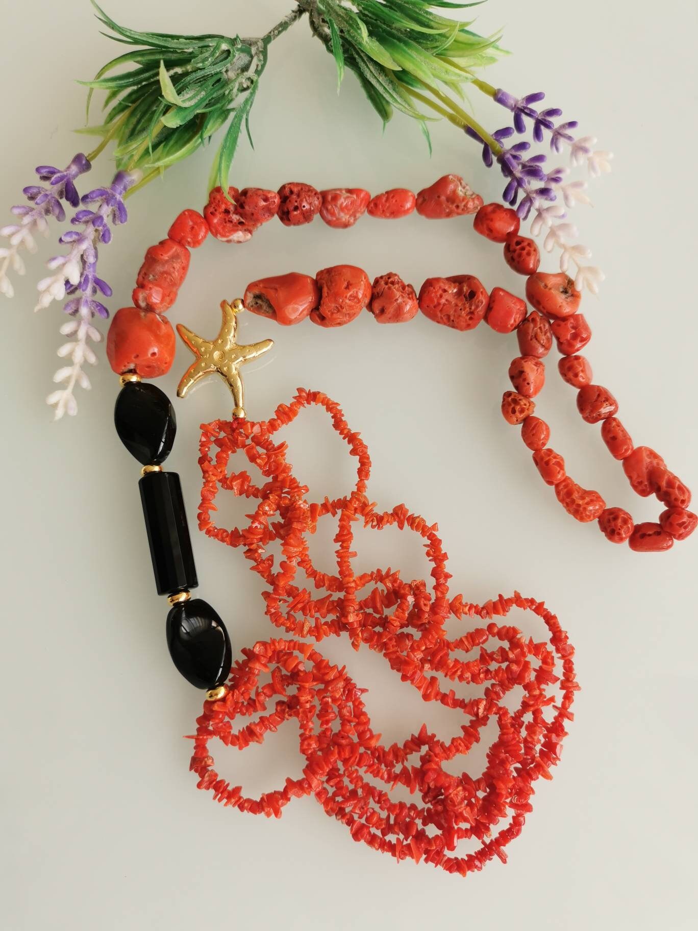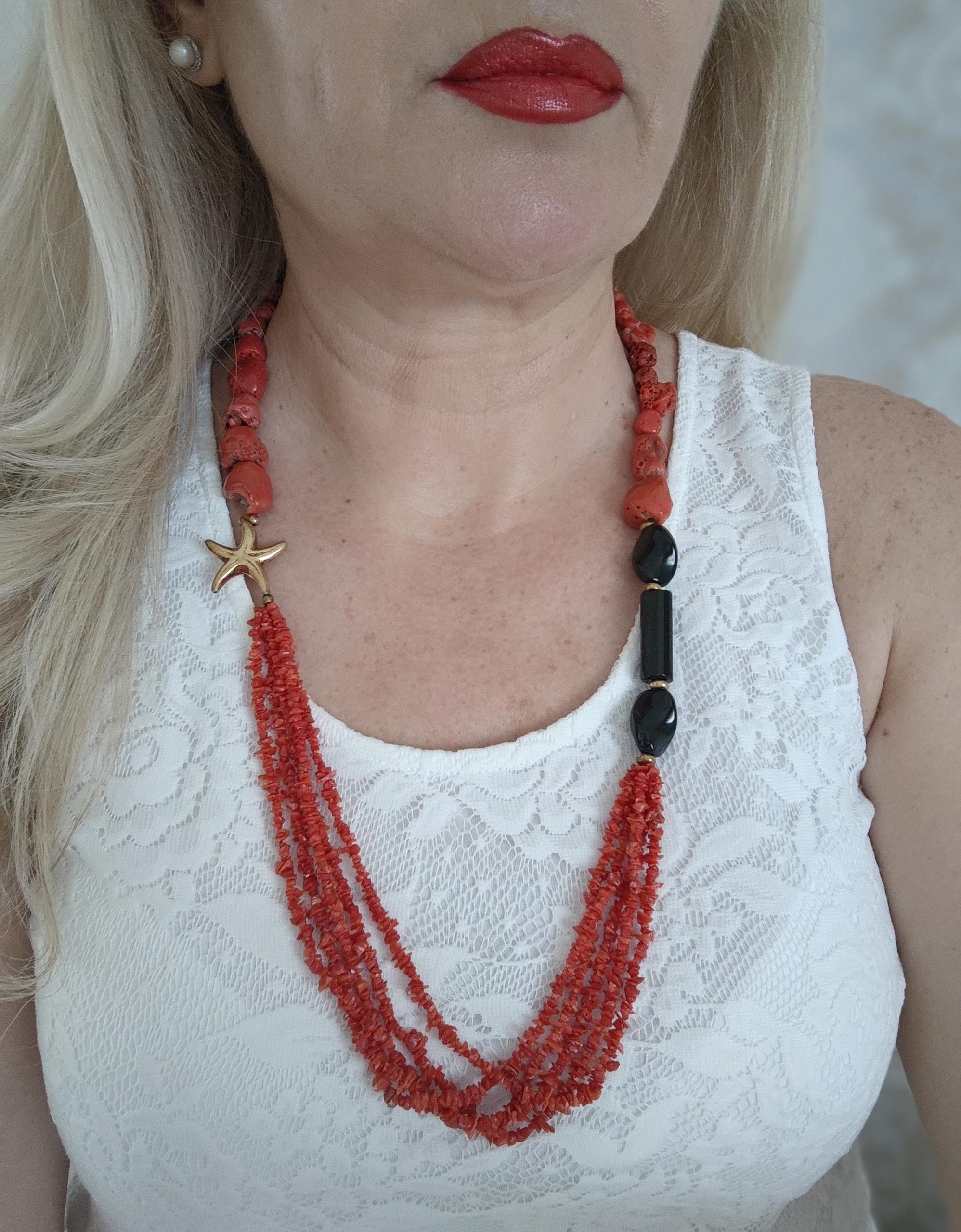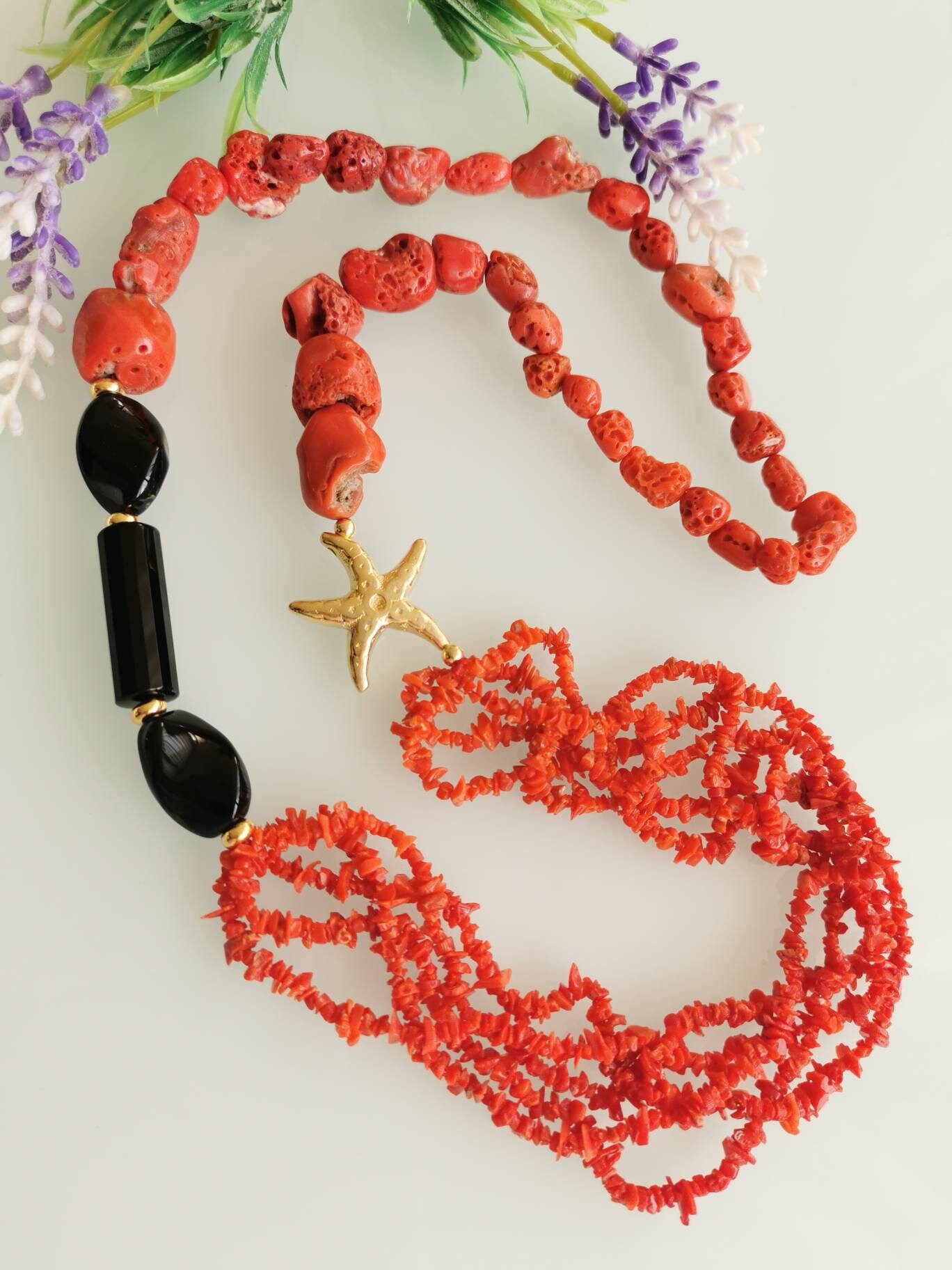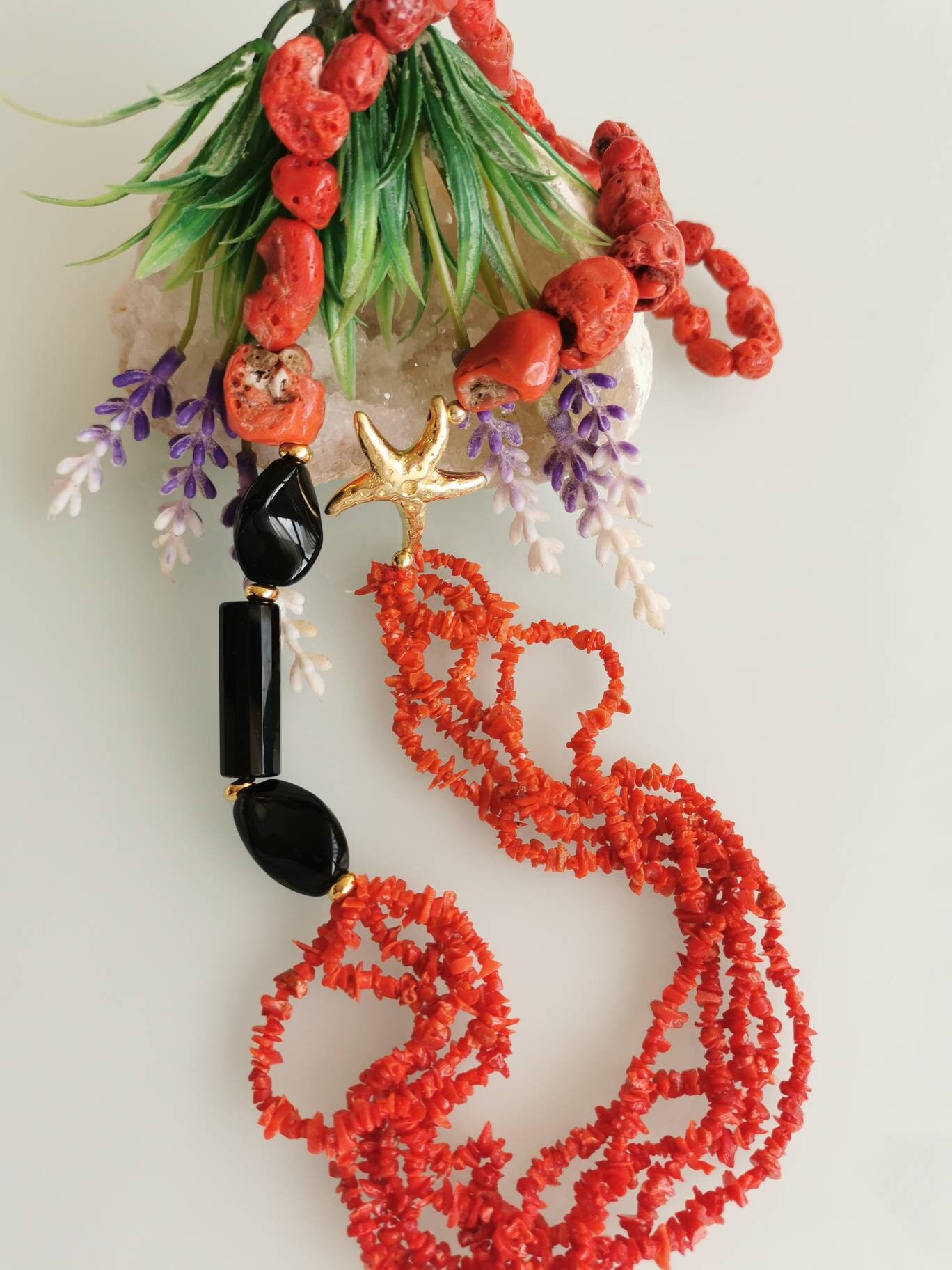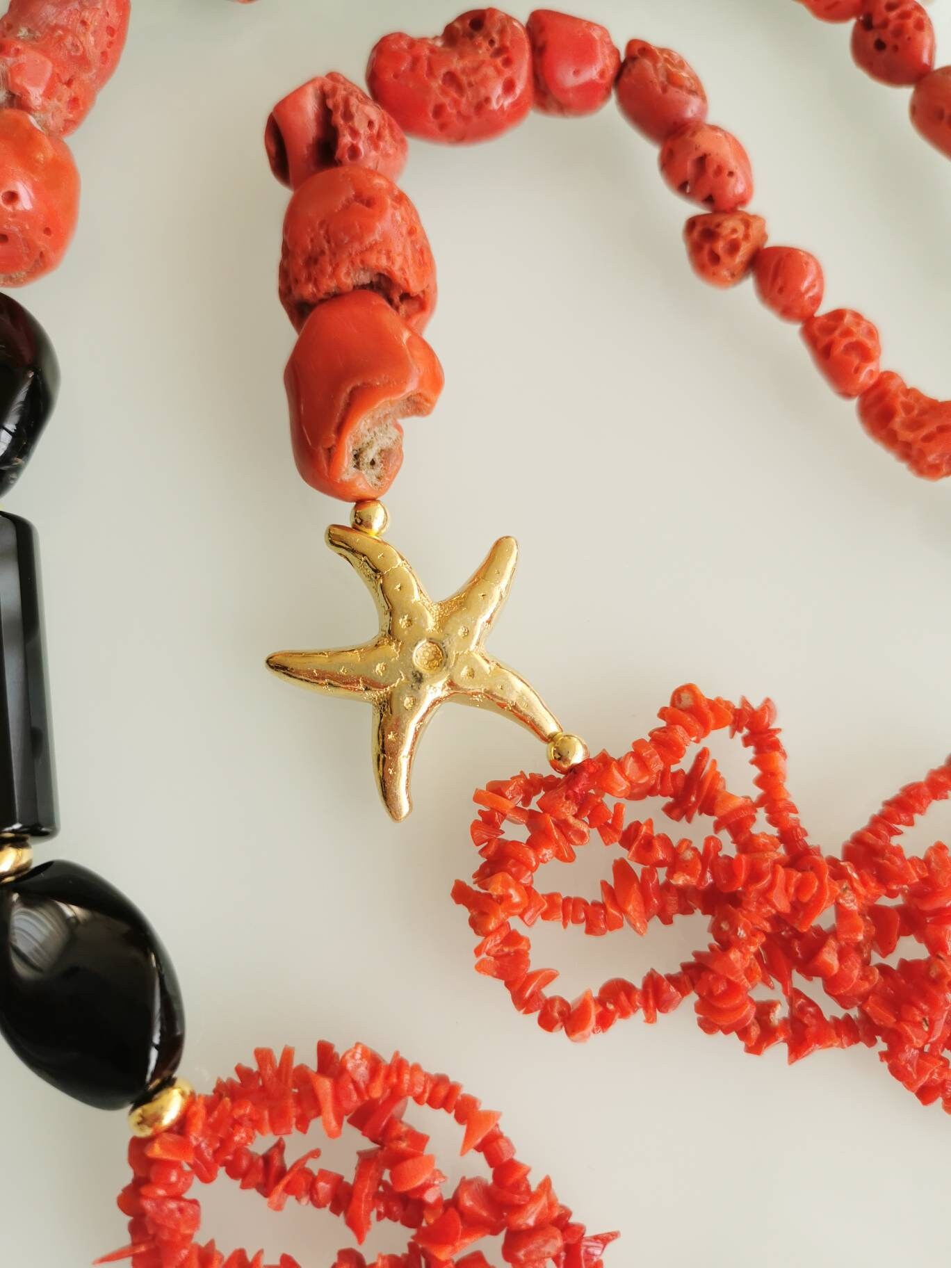 Collana maxi con sassolini e 5 fili di corallo rosso mediterraneo naturale della Sardegna con elemento laterale stella marina in argento 925 placcato oro 2,5 cm diametro e pietre dure onice nero .
