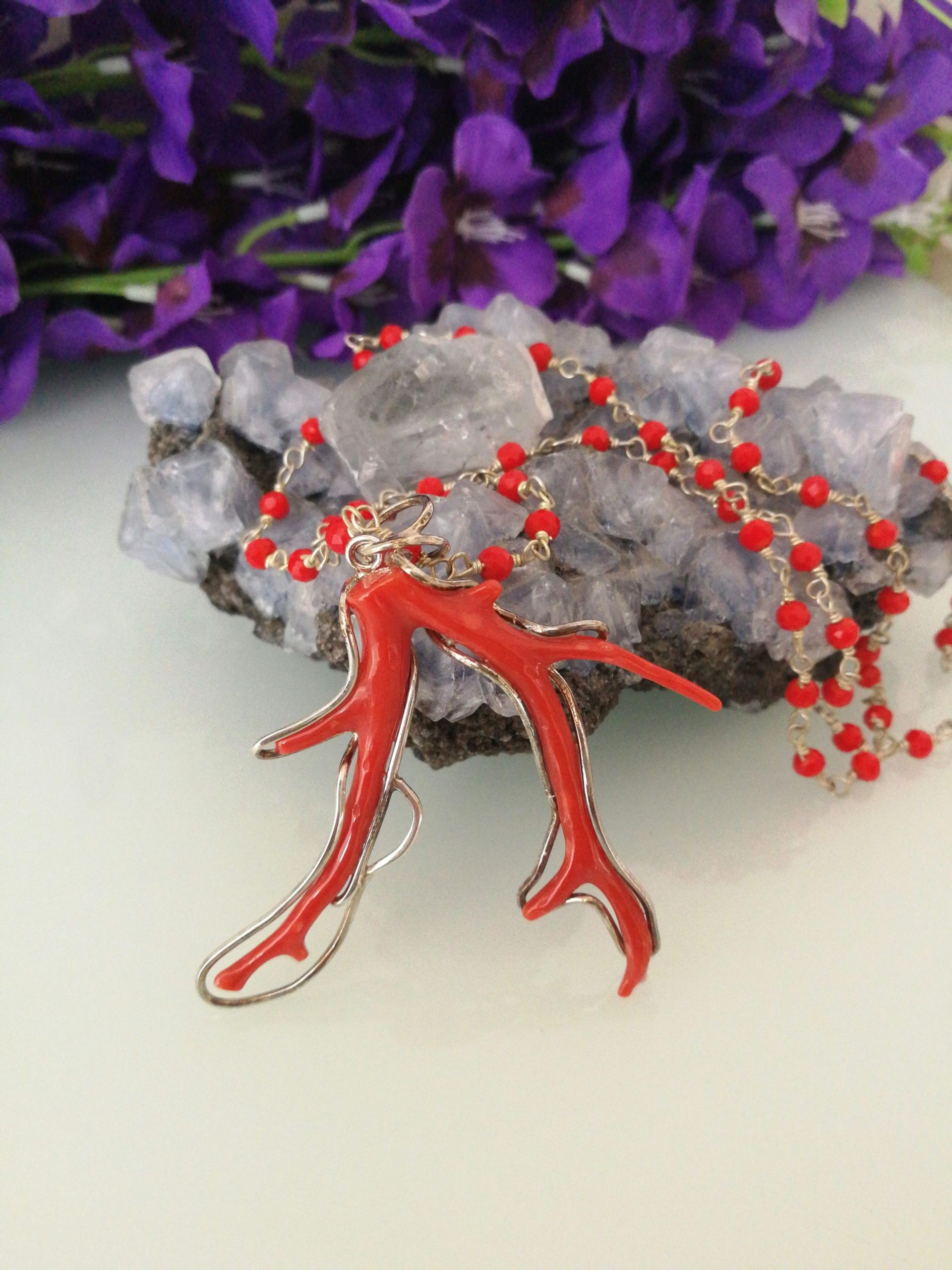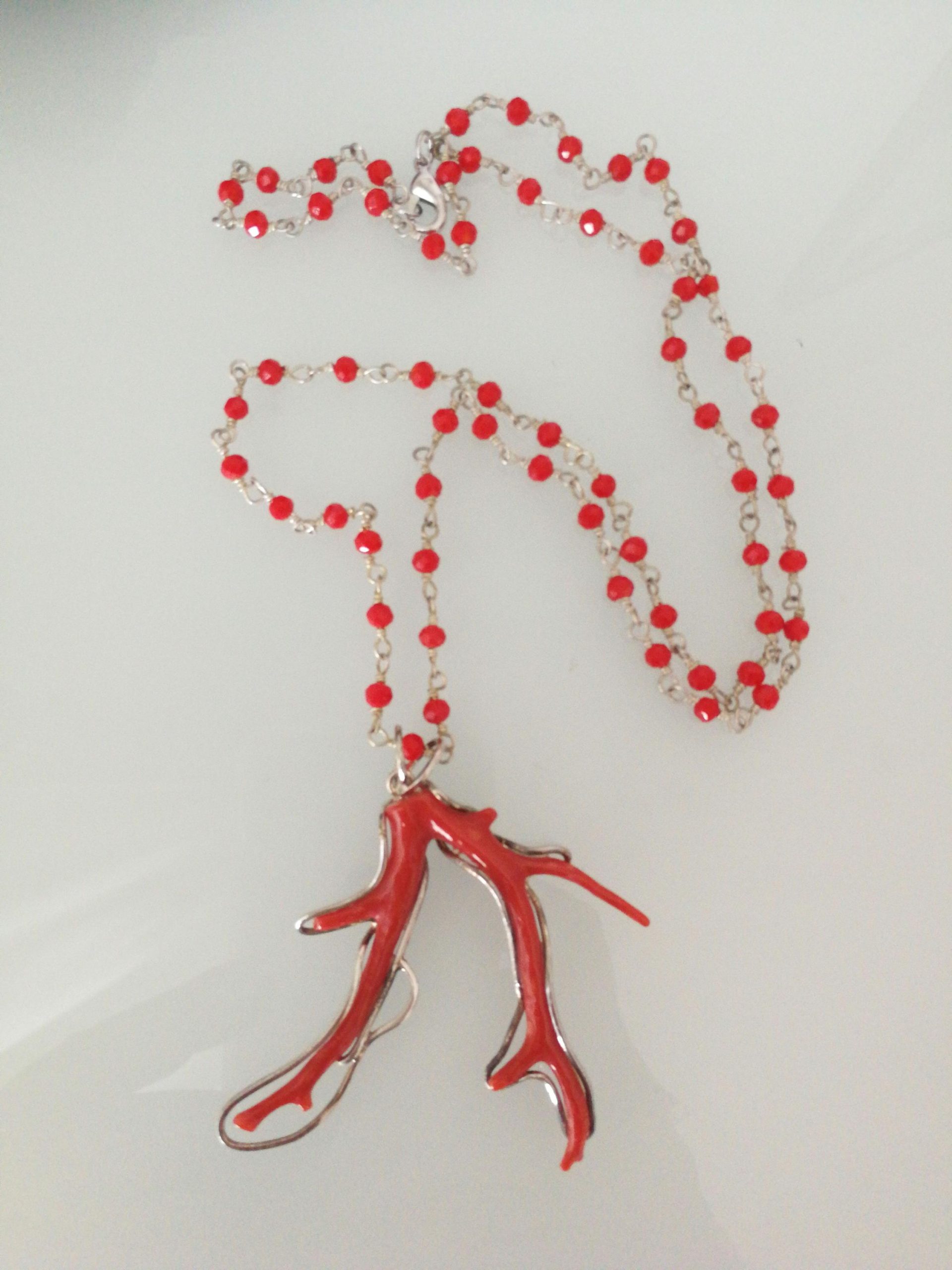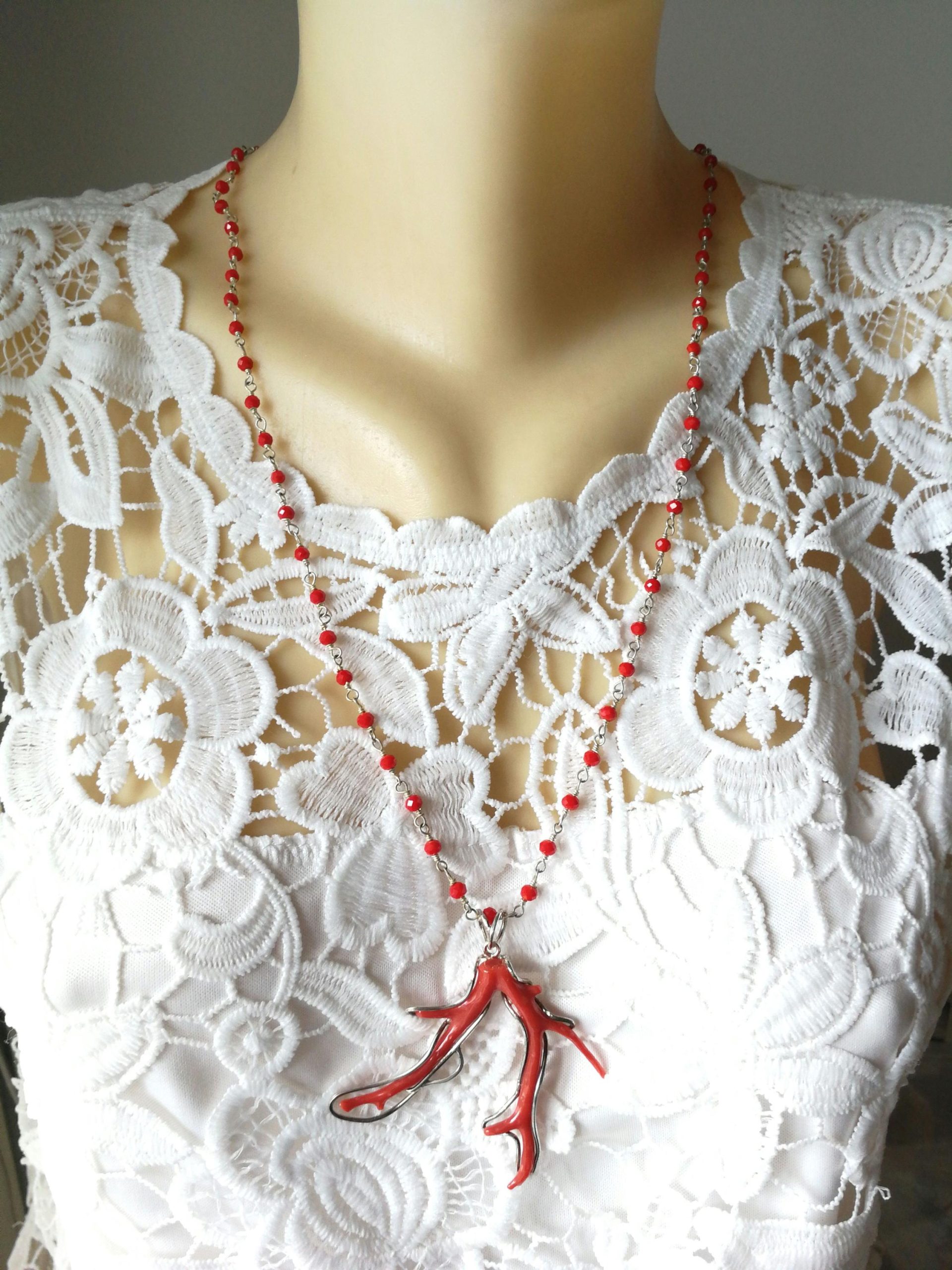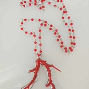 Bellissima collana con ciondolo con ramo di corallo vero naturale del mediterraneo,montatura in argento 925 a lavorazione artigianale, catenina a rosario in grani con cristalli rossi. Misura lunghezza corallo 6 cm. Misura larghezza 6 cm. Originale corallo. Misura lunghezza collana 60 cm