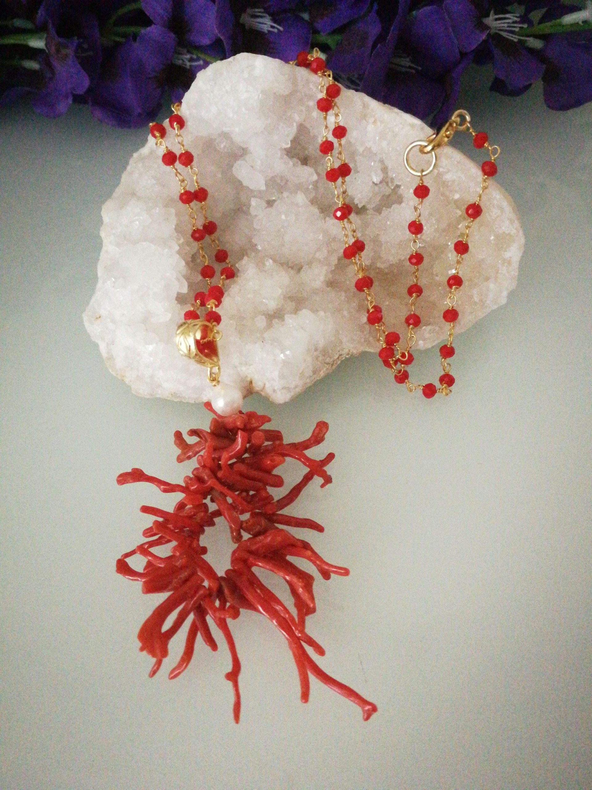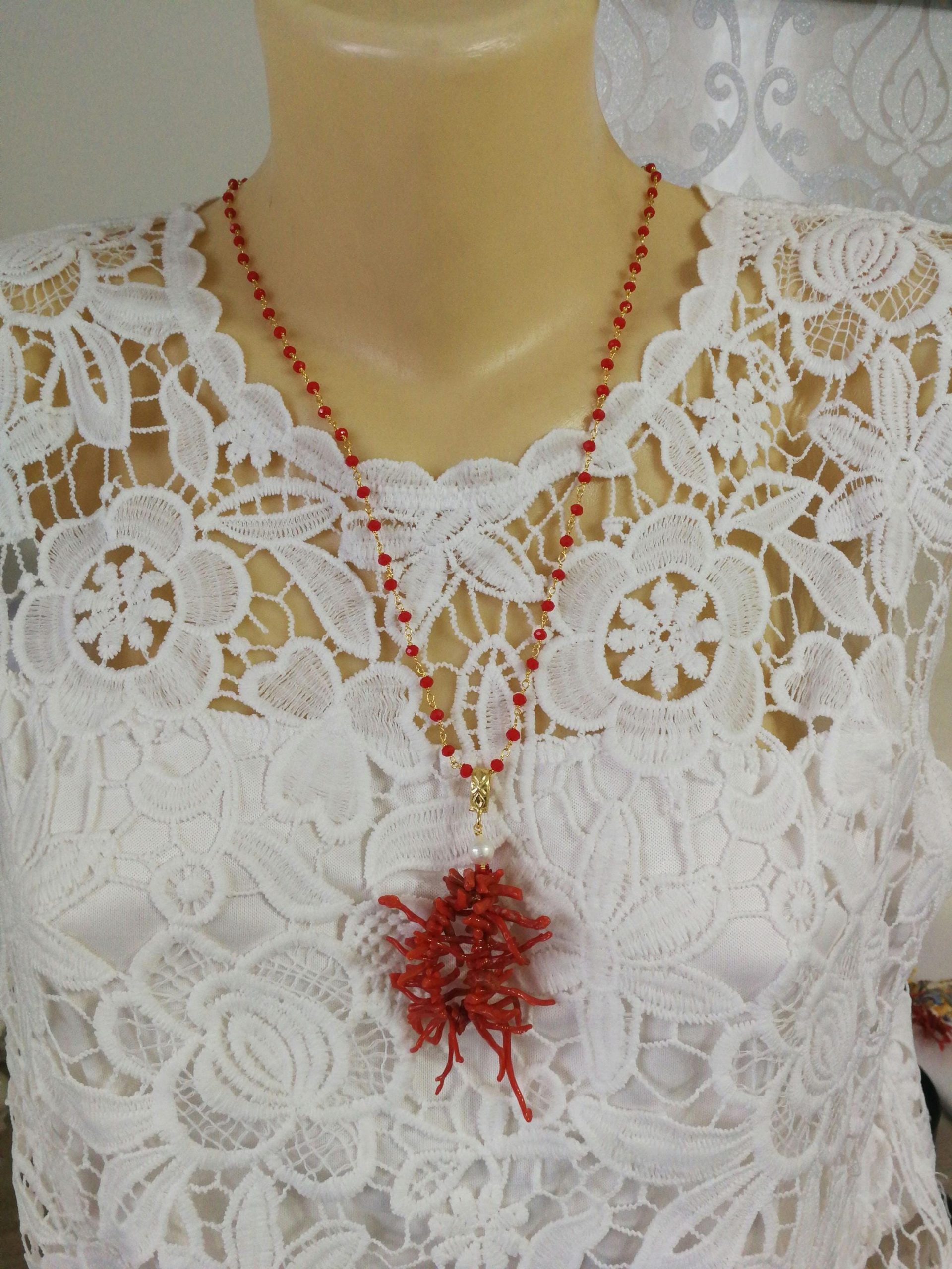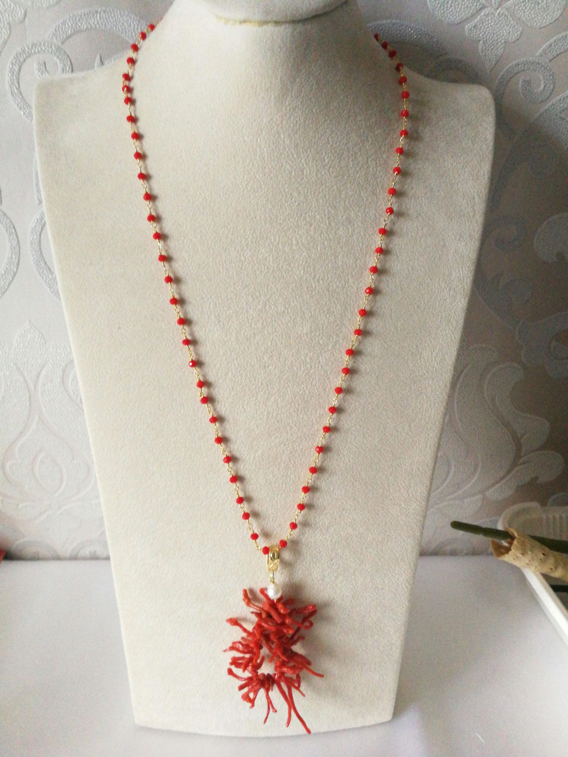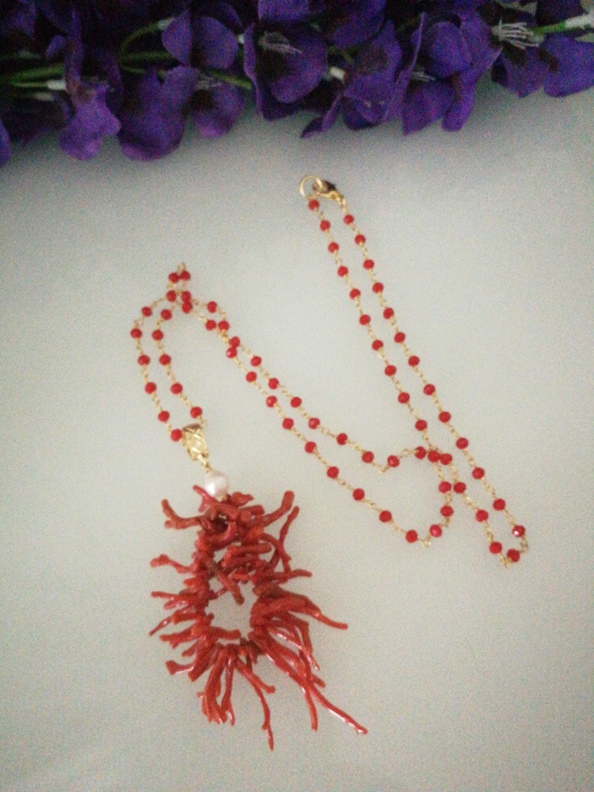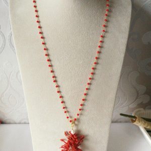 Collana elegante con ciondolo máxi in rametti di corallo rosso naturale del mediterraneo, catenina in cristalli rossi. Lunghezza ciondolo 7 cm. Lunghezza collana 60 cm