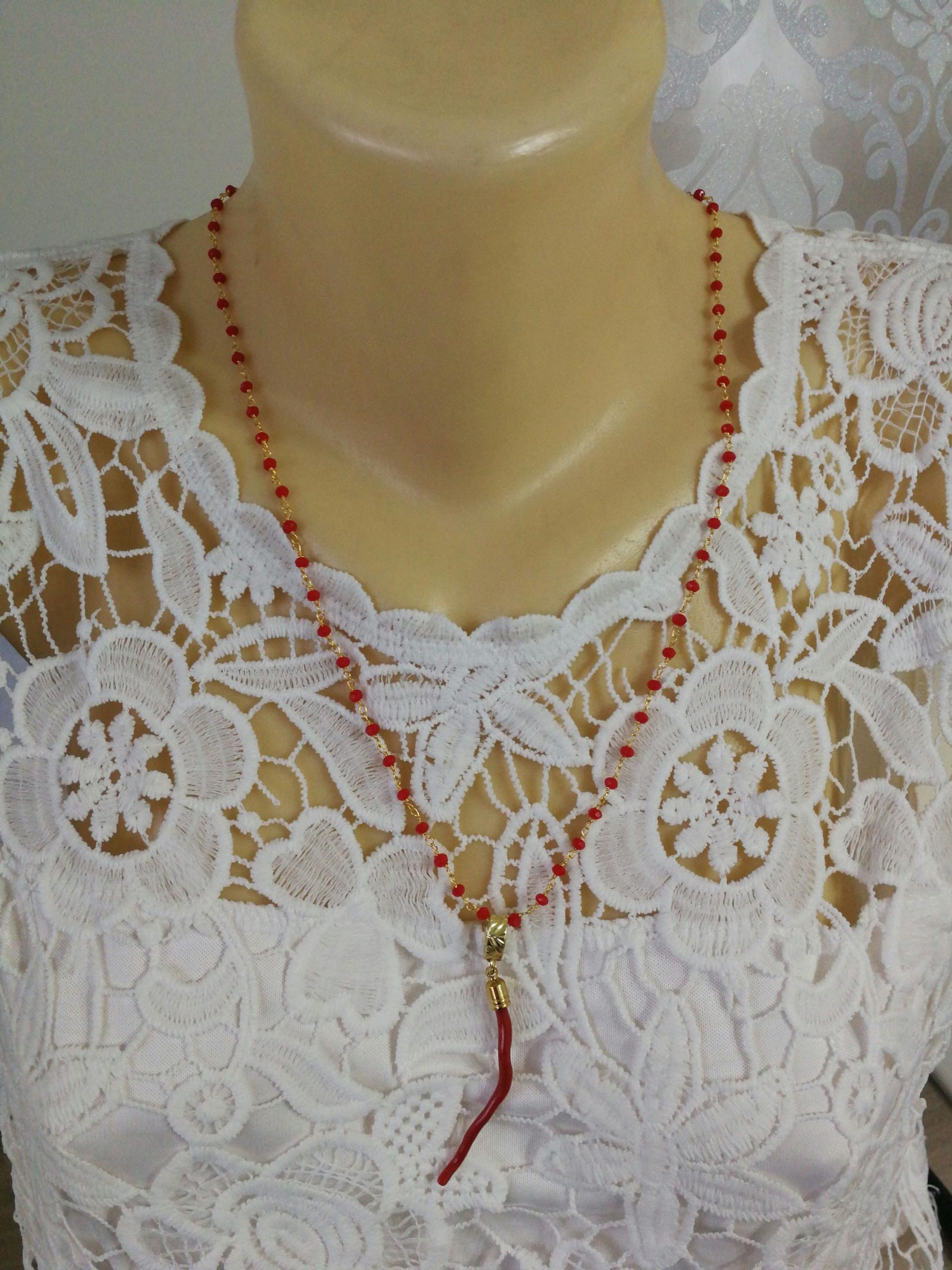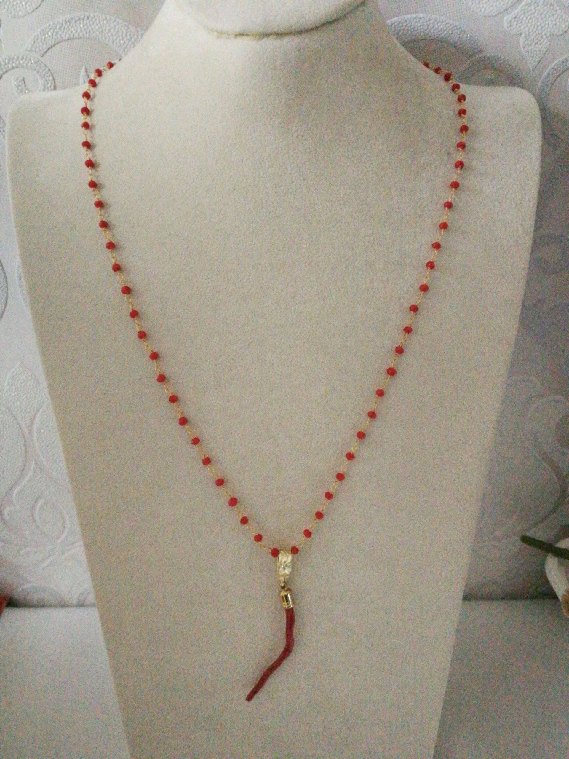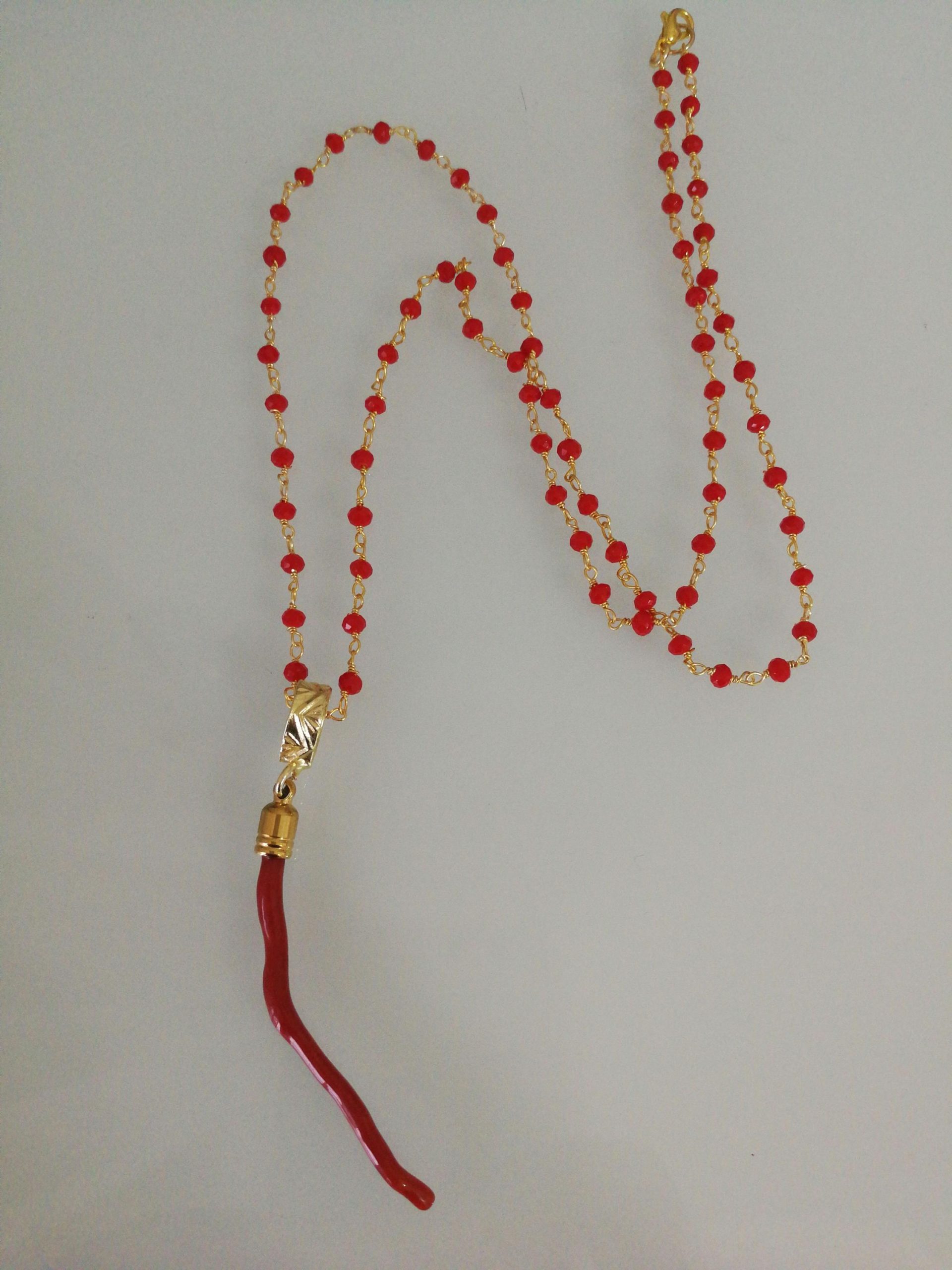 Collana elegante con ciondolo con maxi ramo corallo rosso del mediterraneo vero , catenina in grani in cristalli rossi. Misura ramo di corallo 7 cm. Misura lunghezza collana 60 cm.Corallo vero.