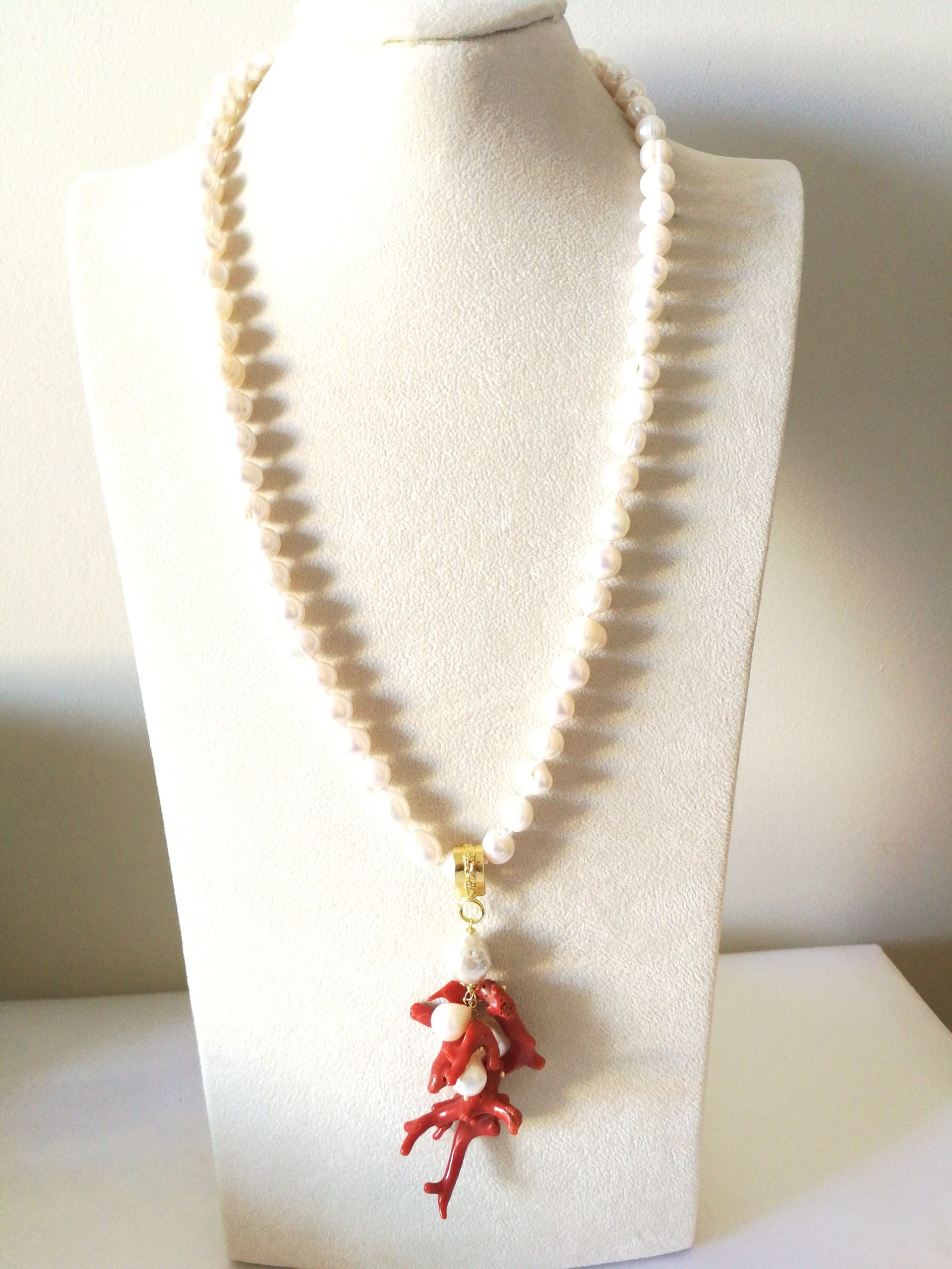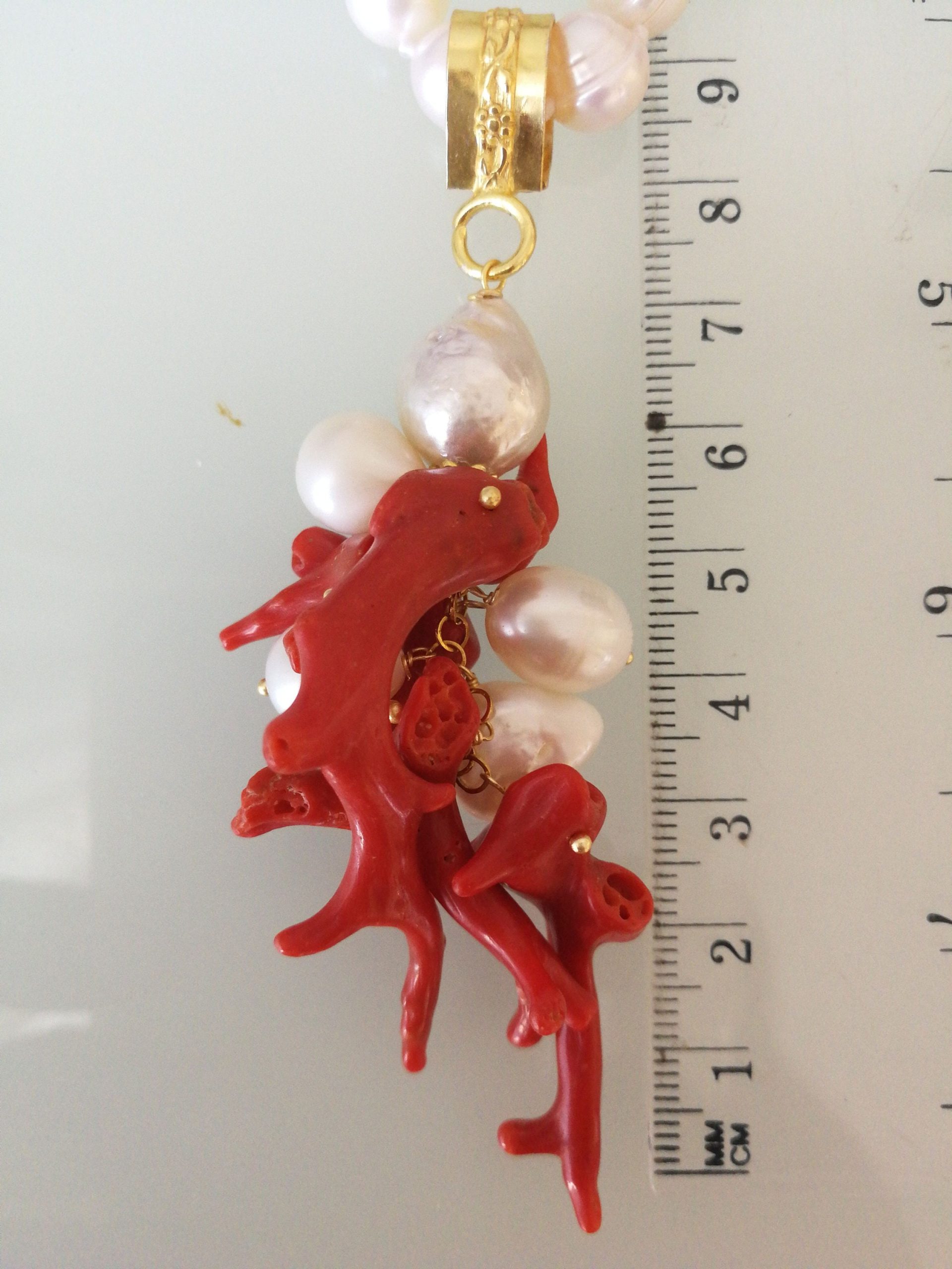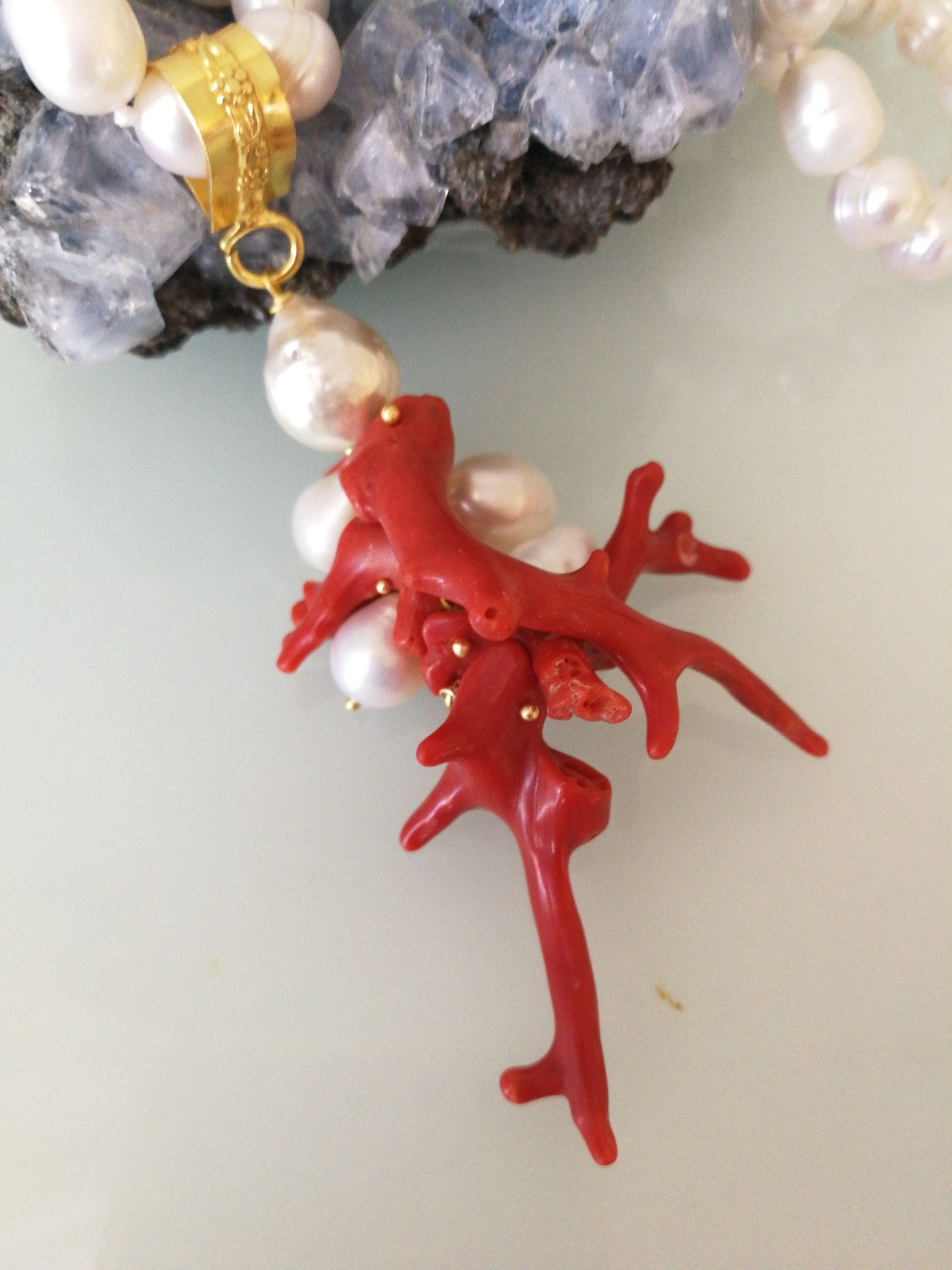 Collana esclusiva con perle naturali bianche , con maxi ciondolo di corallo rosso naturale del mediterraneo rametto e perla centrale .Moschettone della collana in argento placcata oro. Misura lunghezza totale collana 60 cm. Misura lunghezza ciondolo 7 cm.