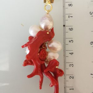 Collana corallo rosso naturale del mediterraneo e perle naturali bianche. Ciondolo con corallo rosso naturale rametto.