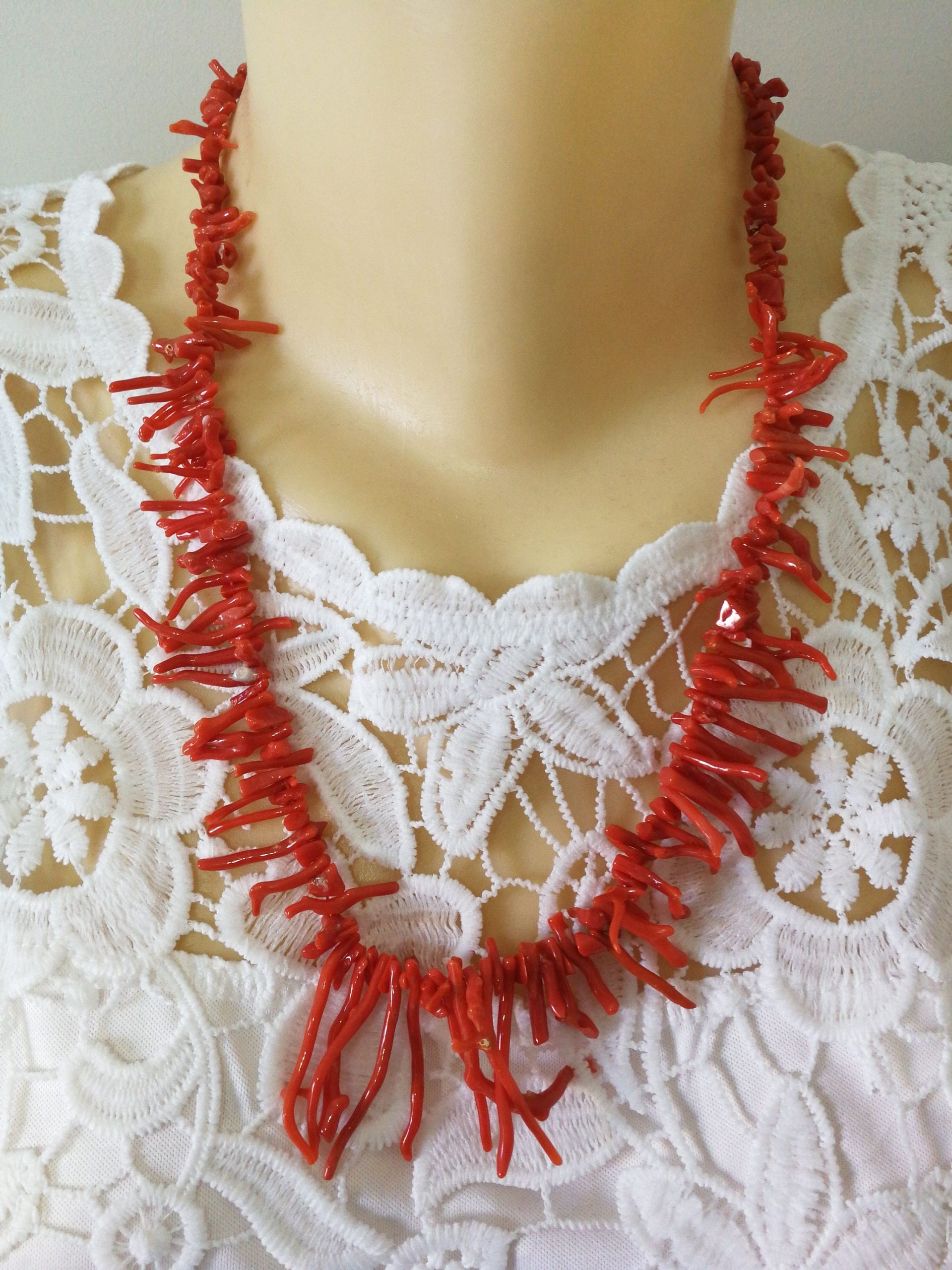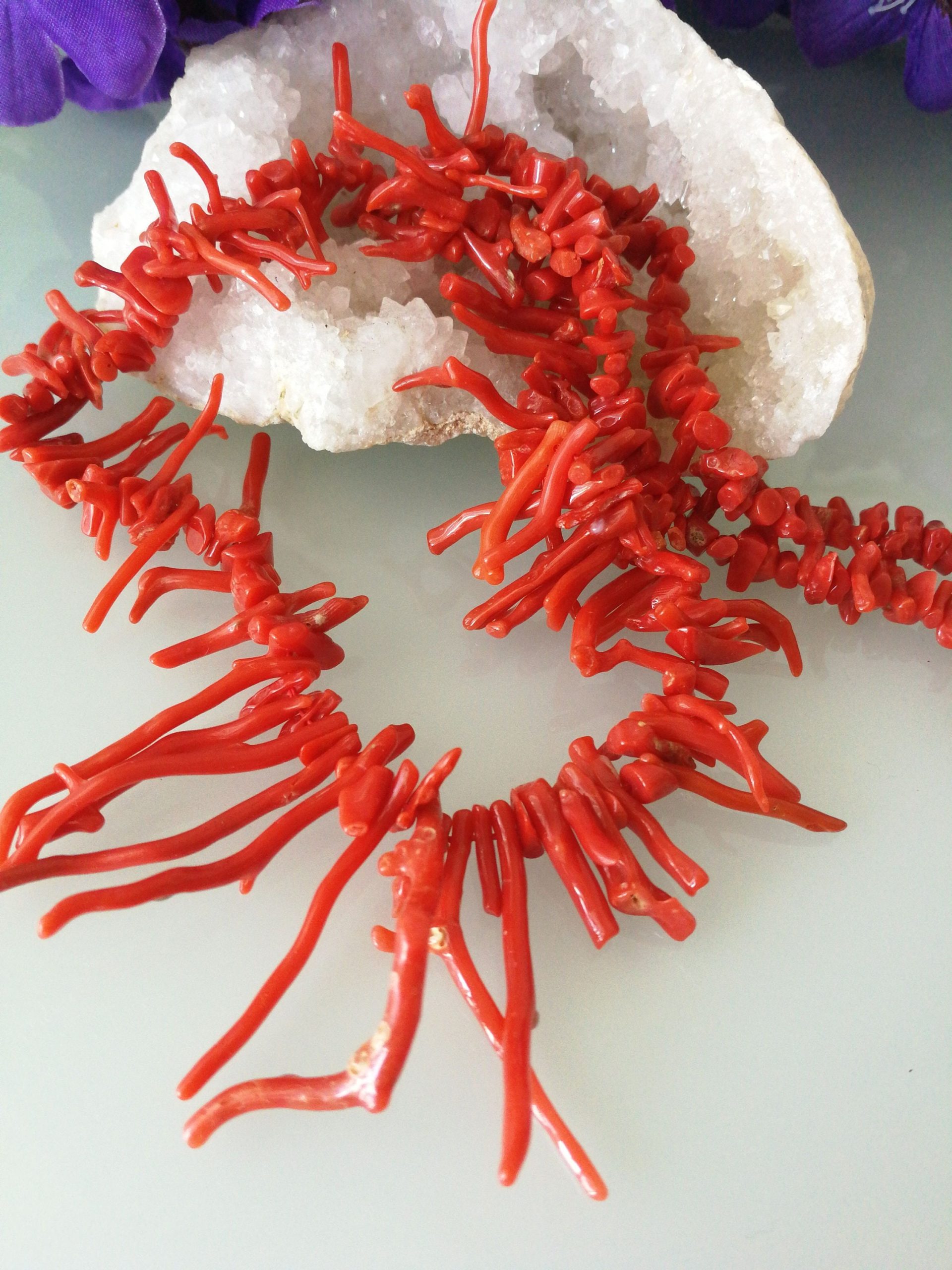 Bellissima collana décolleté in corallo rametto naturale di Sciacca Sicilia, con chiusura a moschettone in argento placcato oro. Autentico corallo naturale.Misura lunghezza rametto corallo 4 cm. Misura lunghezza collana 50 cm.