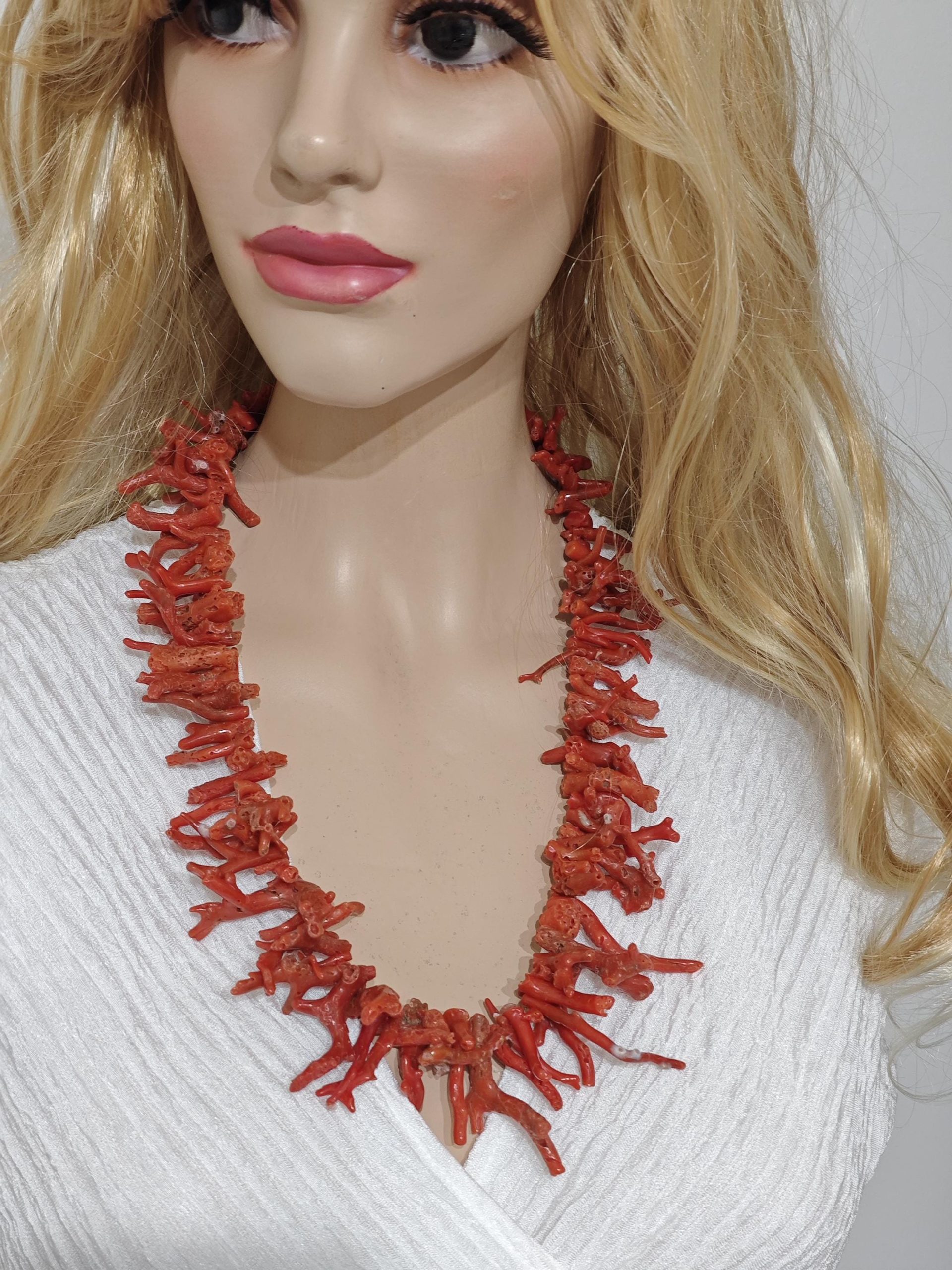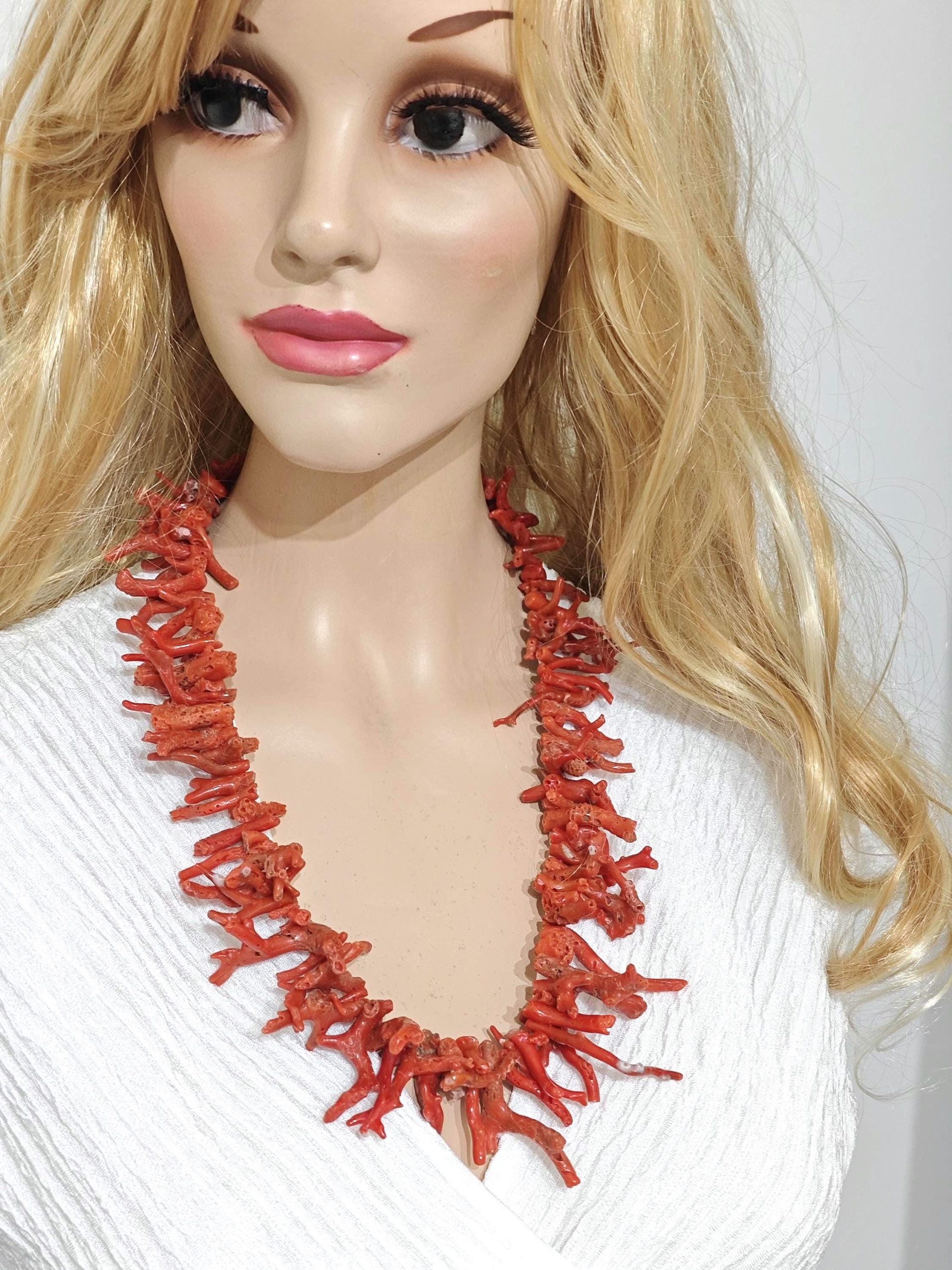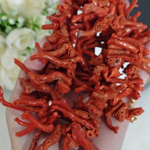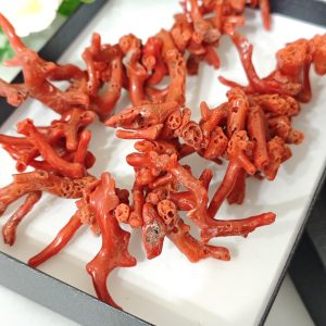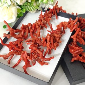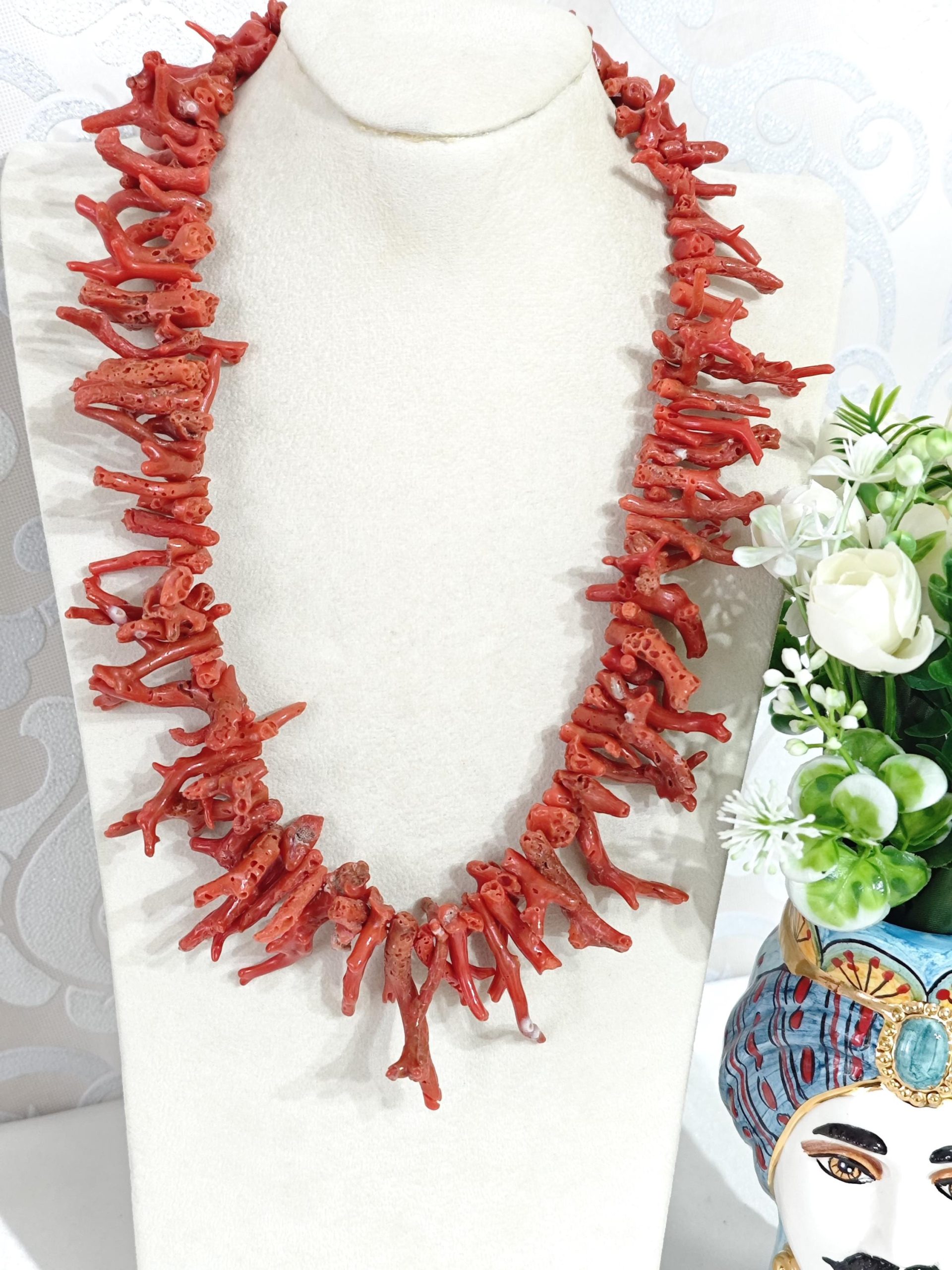 Collana realizzata con rametti corallo naturale rosso mediterraneo, lunghezza rametto da 1 cm fino a 4,5 cm, chiusura a moschettone in argento 925 placcato oro, lunghezza 60 cm.