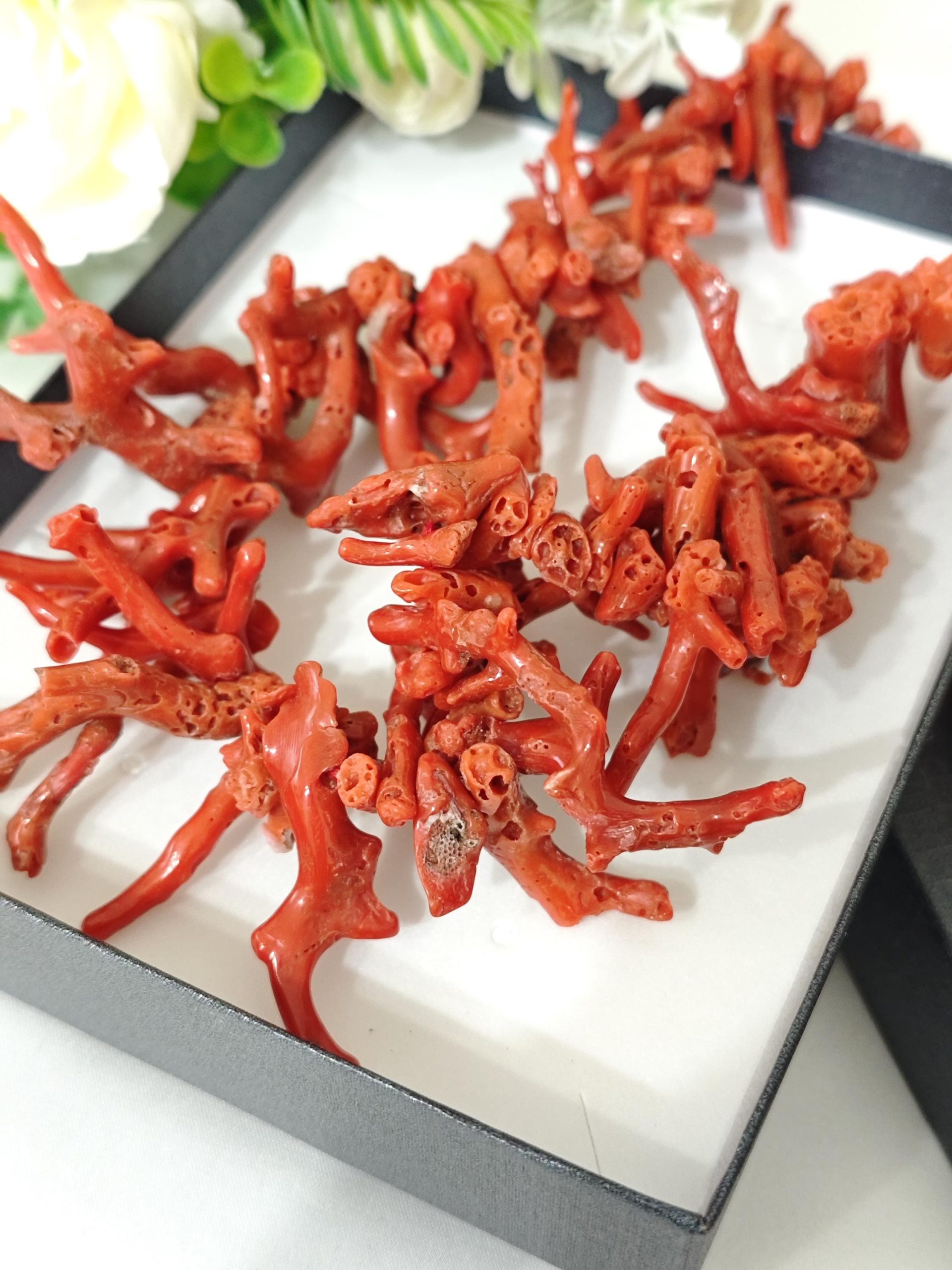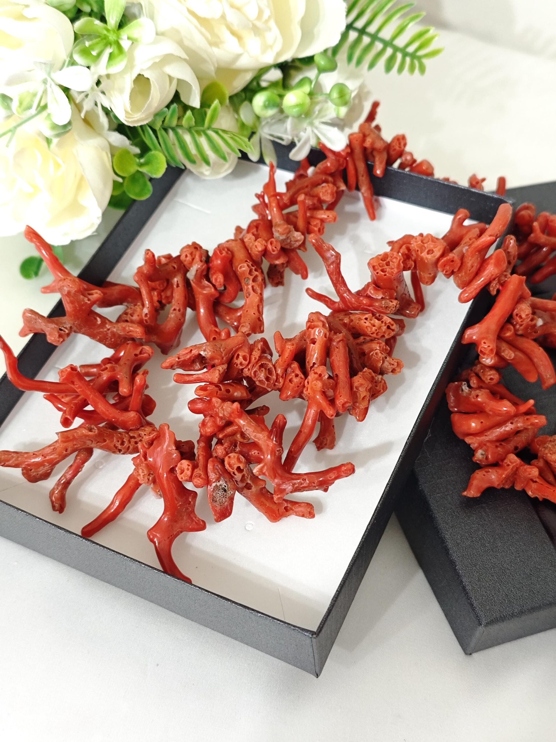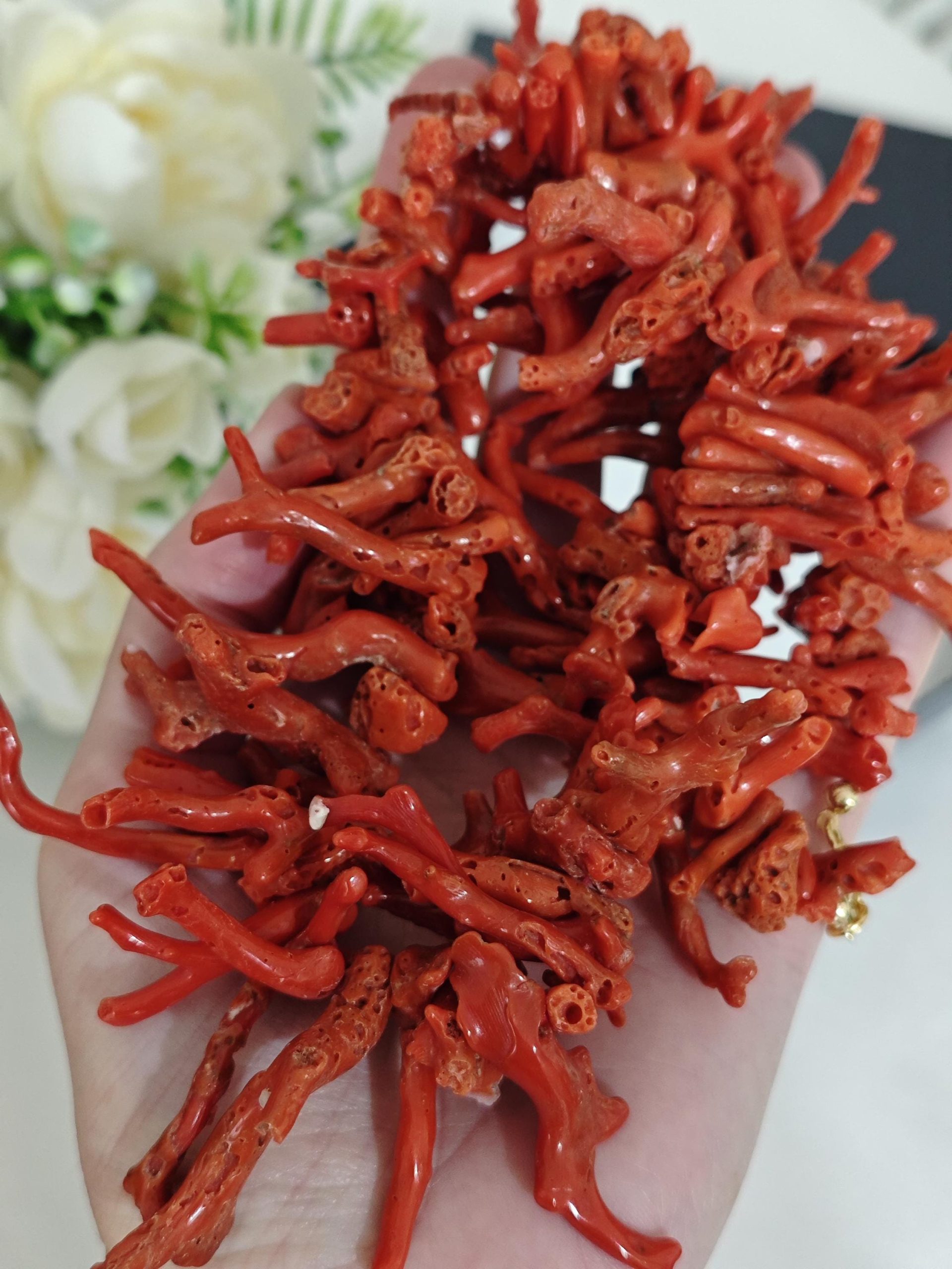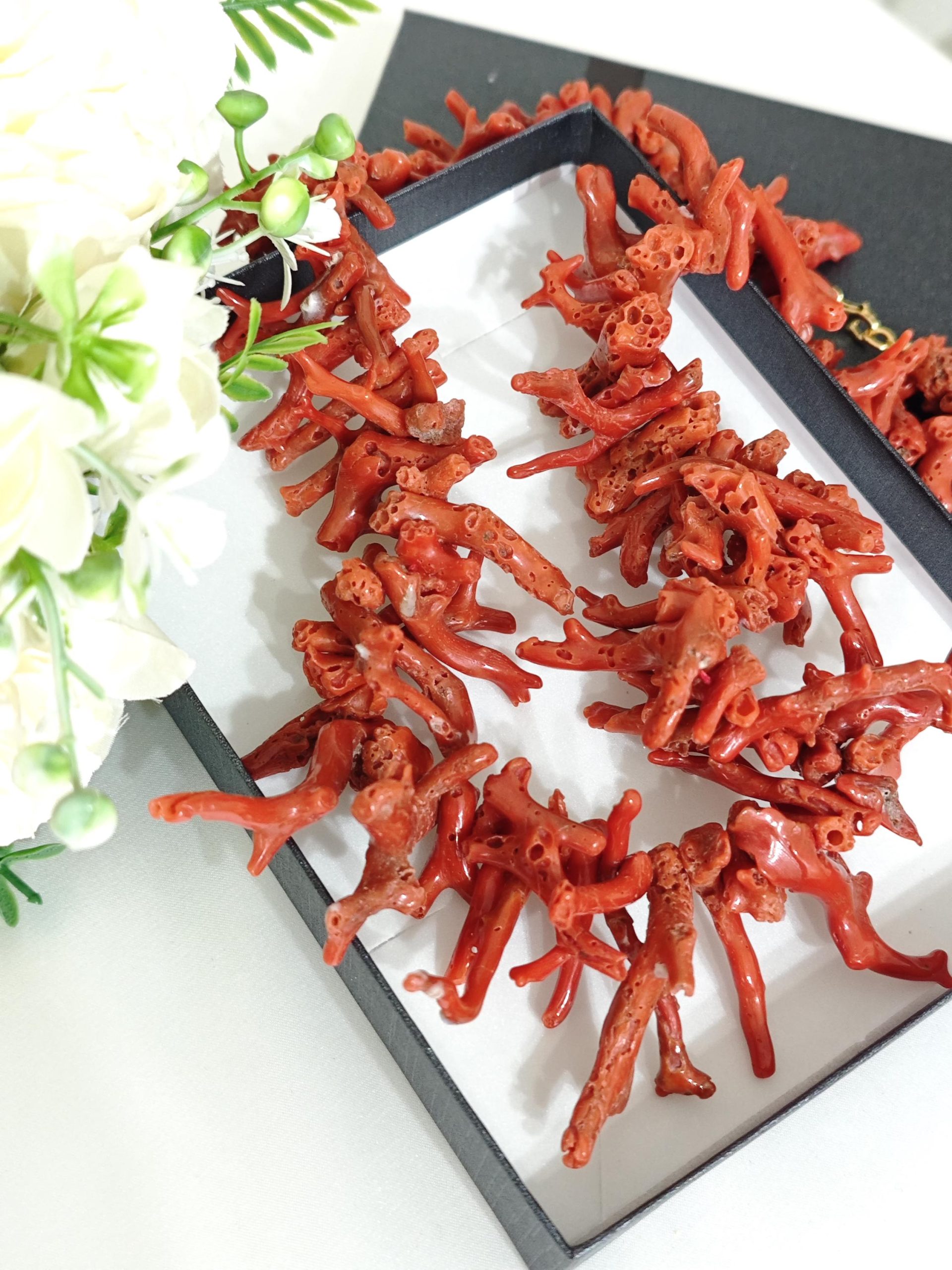 Collana realizzata con rametti corallo naturale rosso mediterraneo, lunghezza rametto da 1 cm fino a 4,5 cm, chiusura a moschettone in argento 925 placcato oro, lunghezza 60 cm.