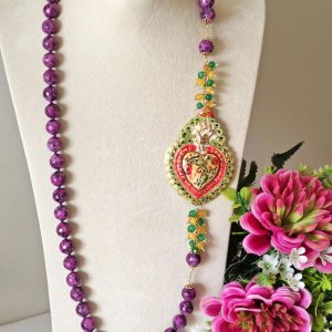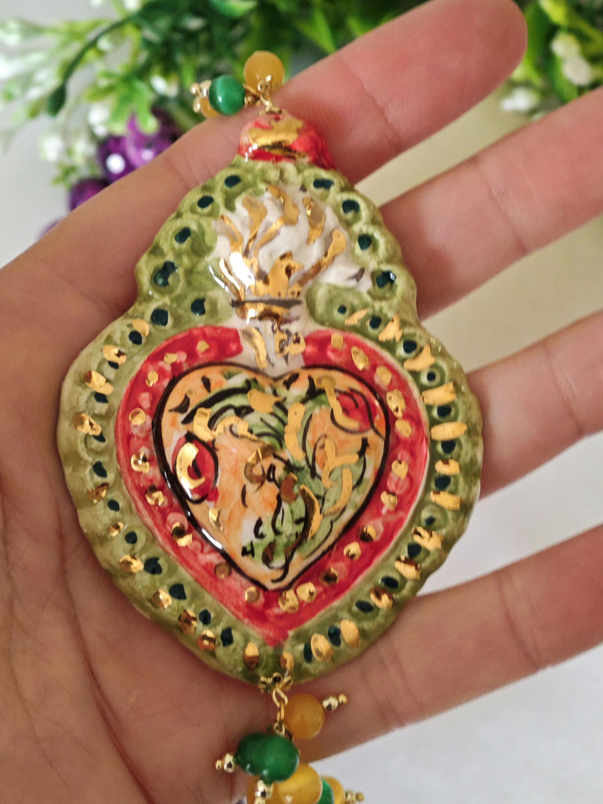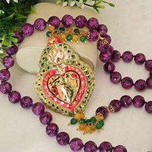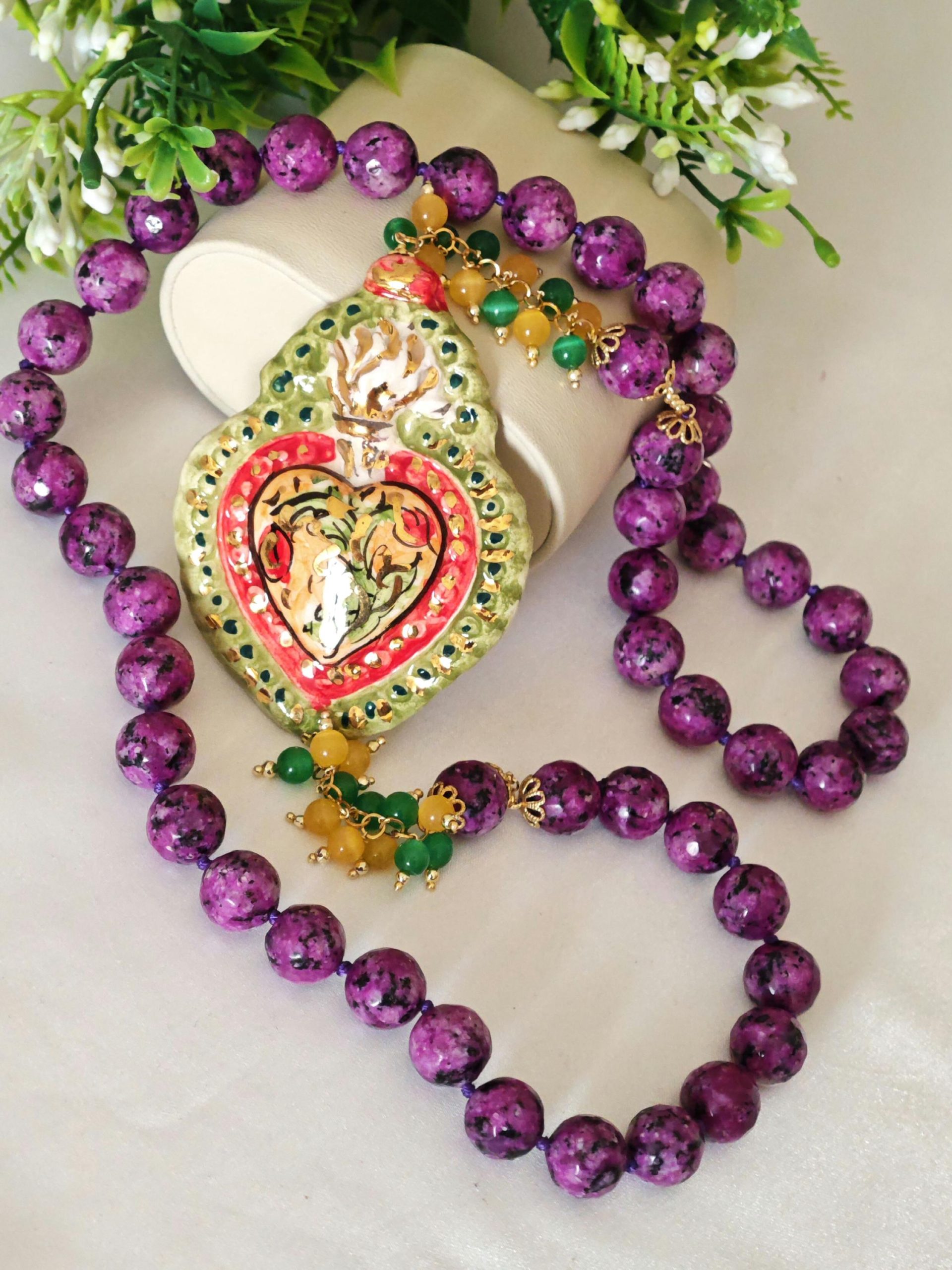 Collana annodata a mano con pietre dure sfaccettate zoisite viola 12 mm, grappolo pietre quarzo verde e giallo e Cuore Sacro in ceramica di Caltagirone realizzata e dipinta a mano con applicazioni foglia oro 22 kt, 7,5×5,5 cm dimensioni.