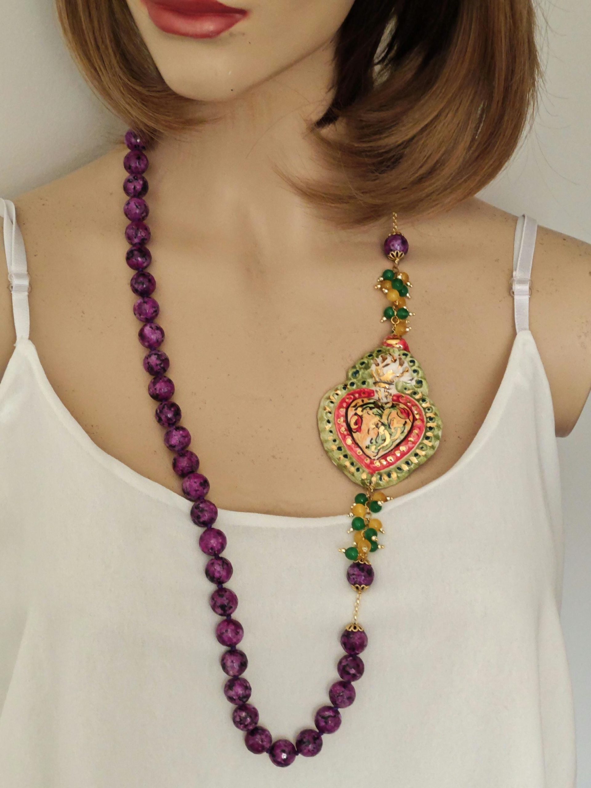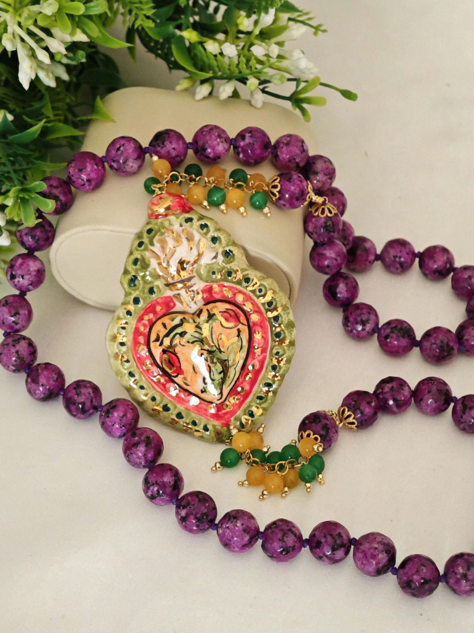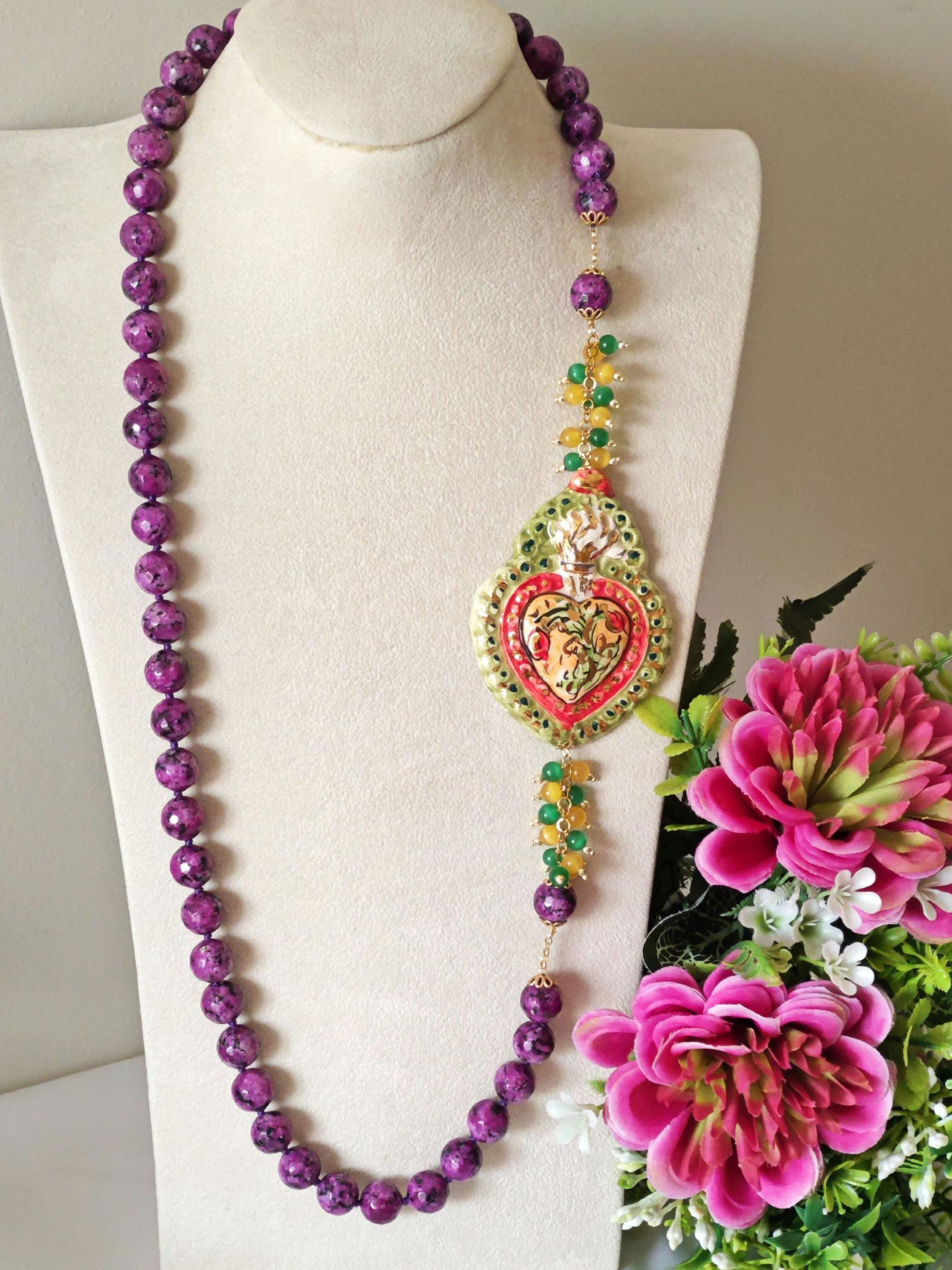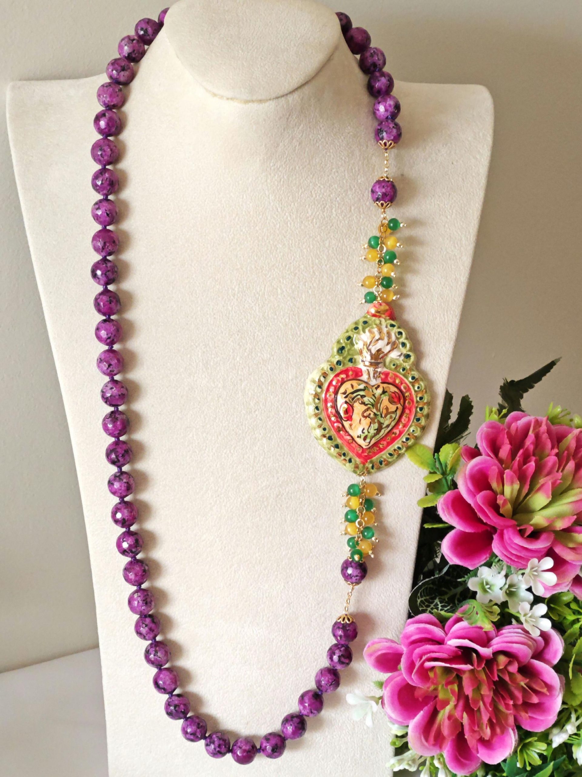 Collana Cuore Sacro ceramica di Caltagirone con pietre dure zoisite viola , collana siciliana