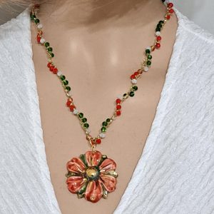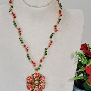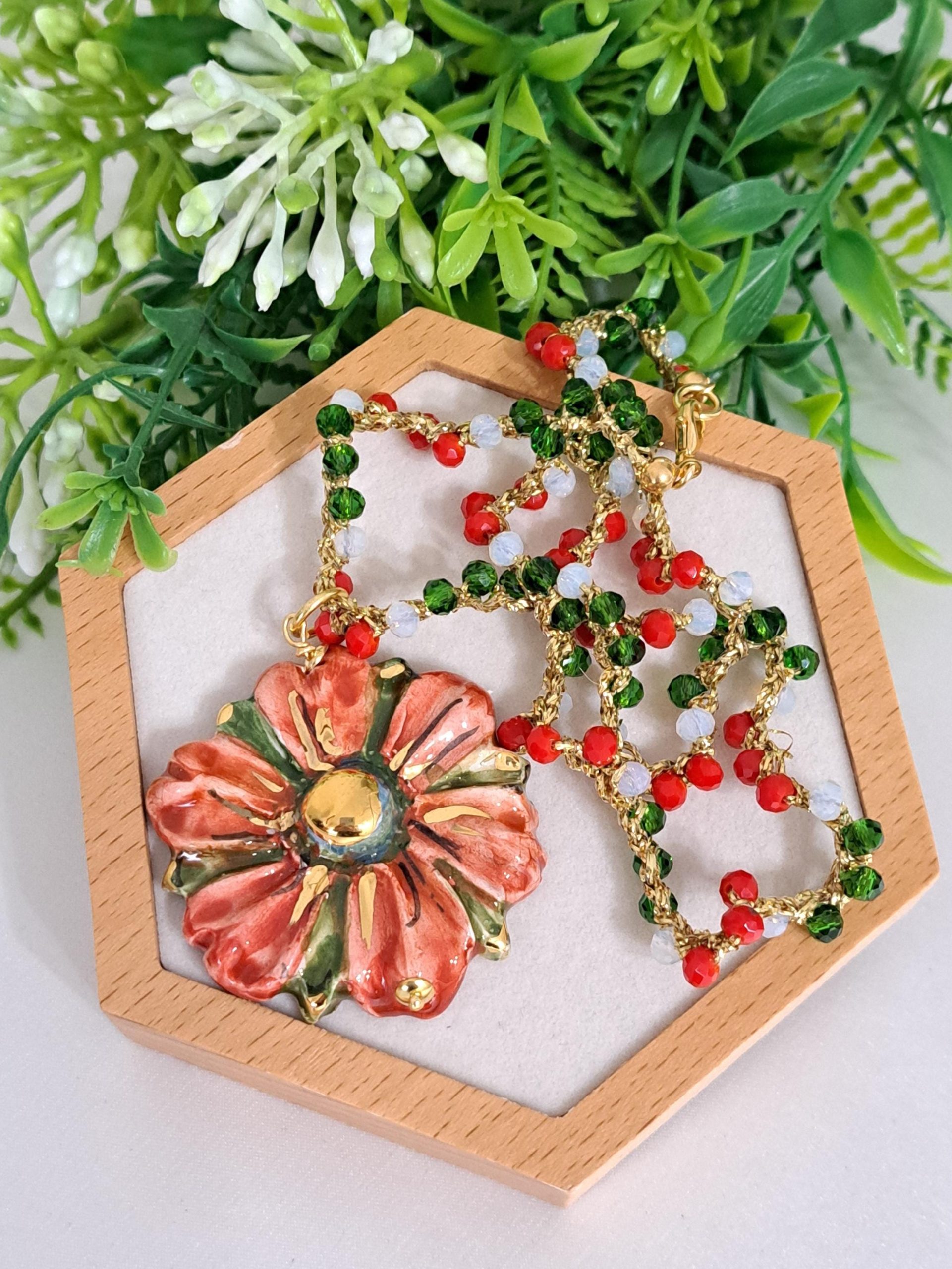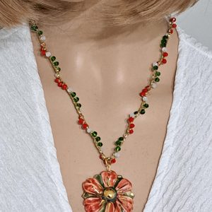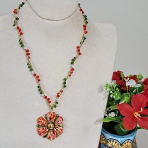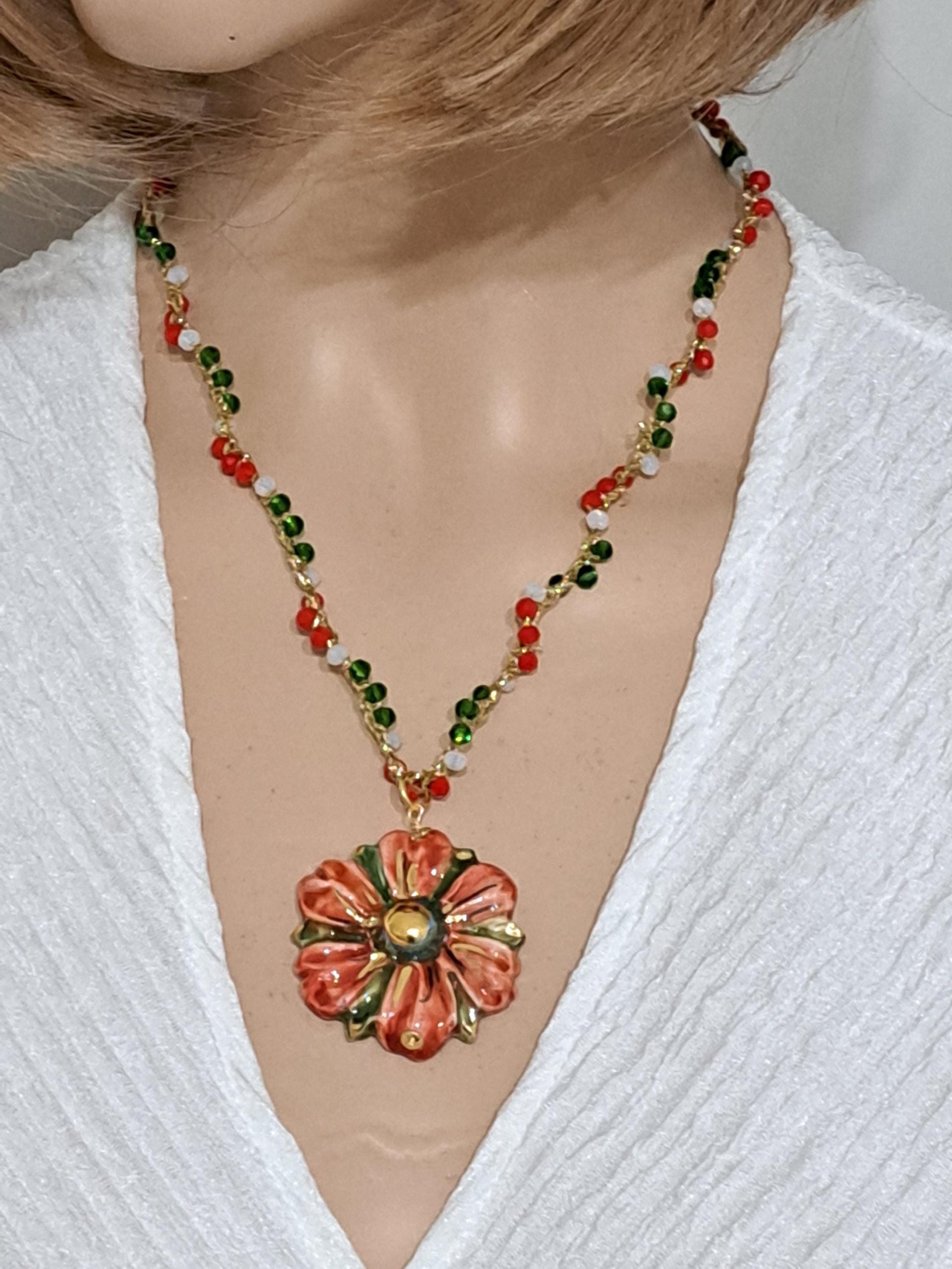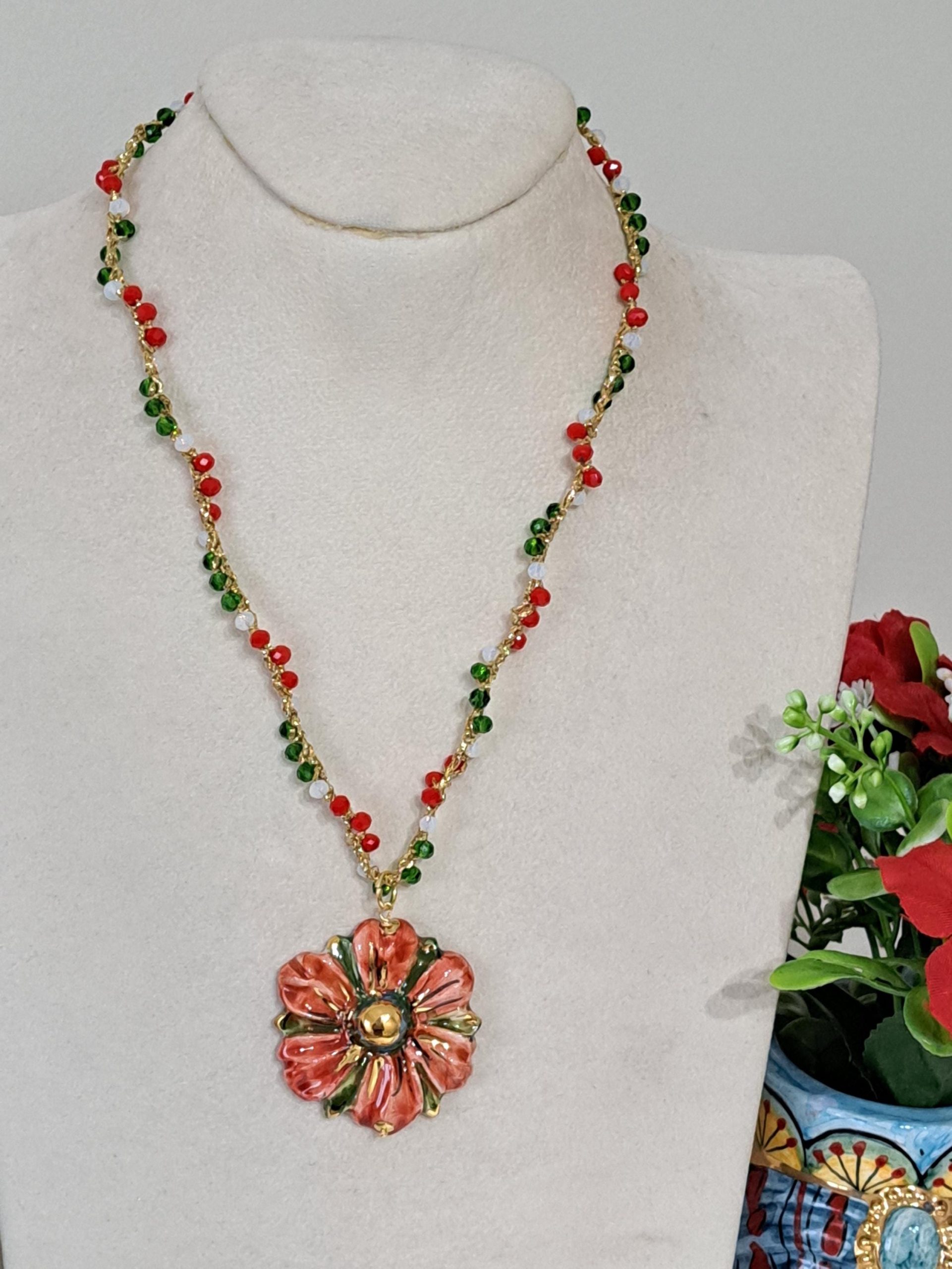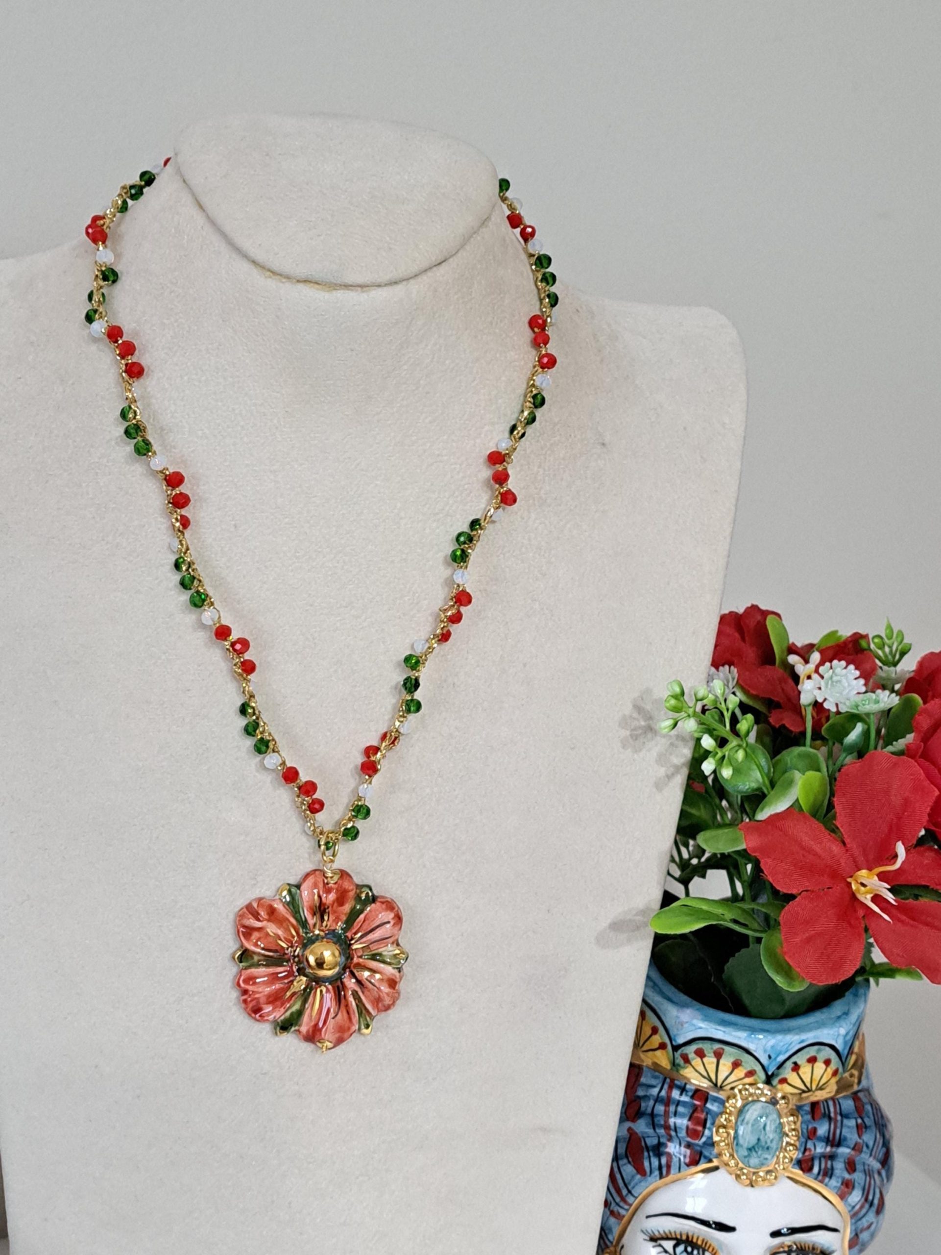 Al centro della collana spicca un pendente in ceramica di Caltagirone, modellato a forma di fiore. Il fiore è decorato a mano con smalti dai colori intensi: rosso, verde e accenti dorati che ne esaltano i dettagli e l’artigianalità. Diametro fiore 4 cm.