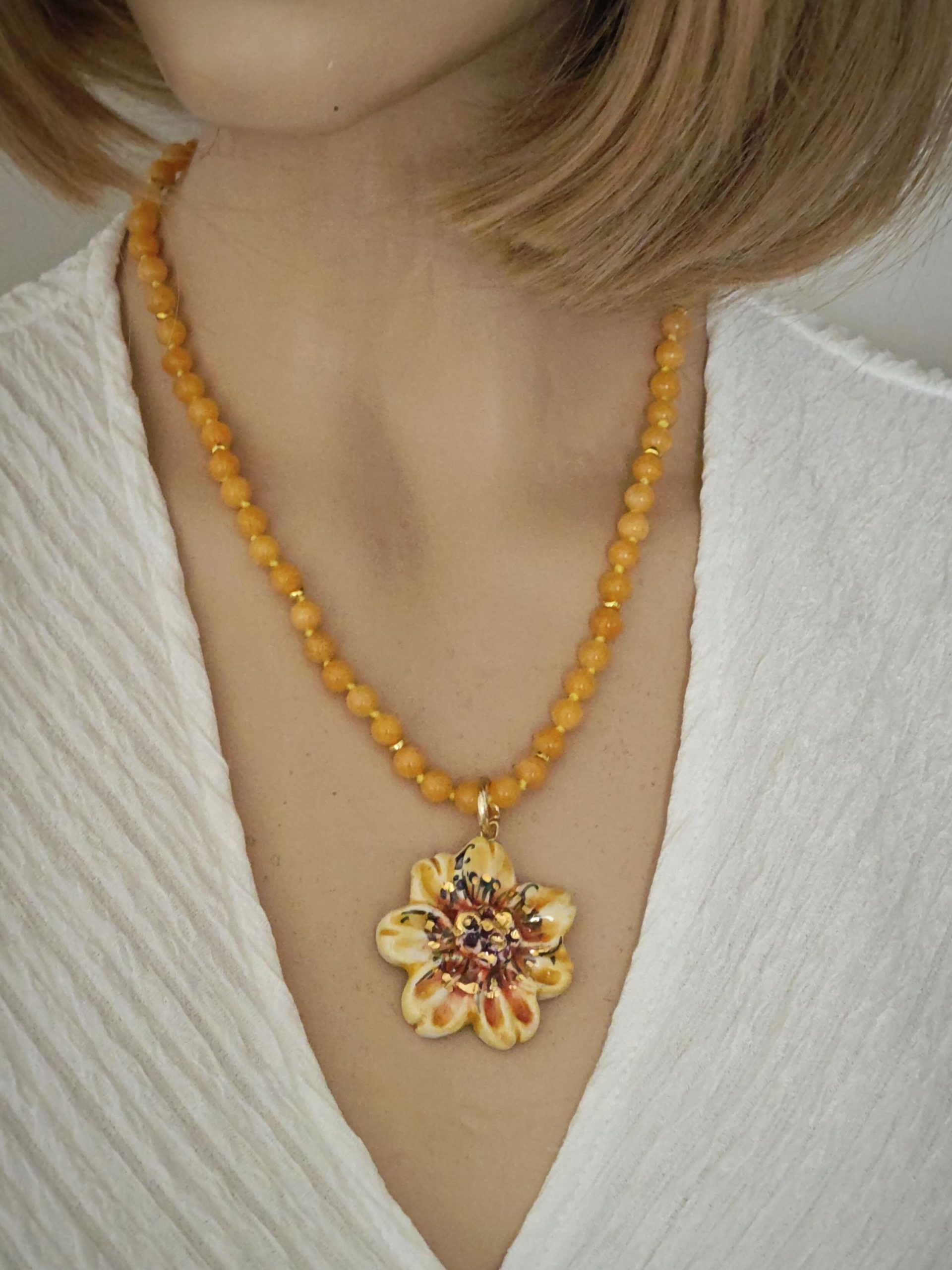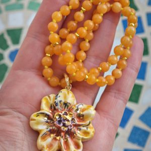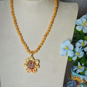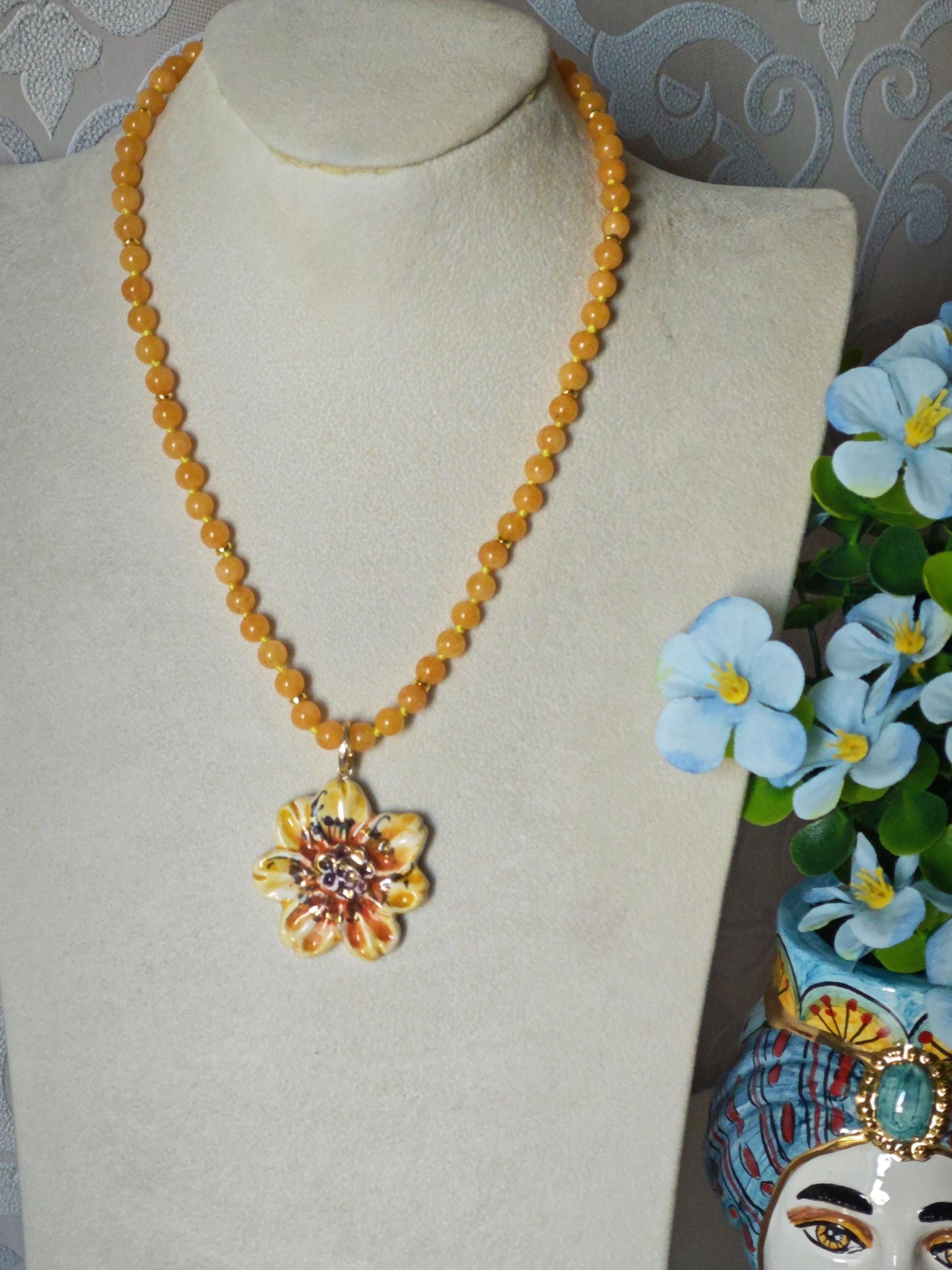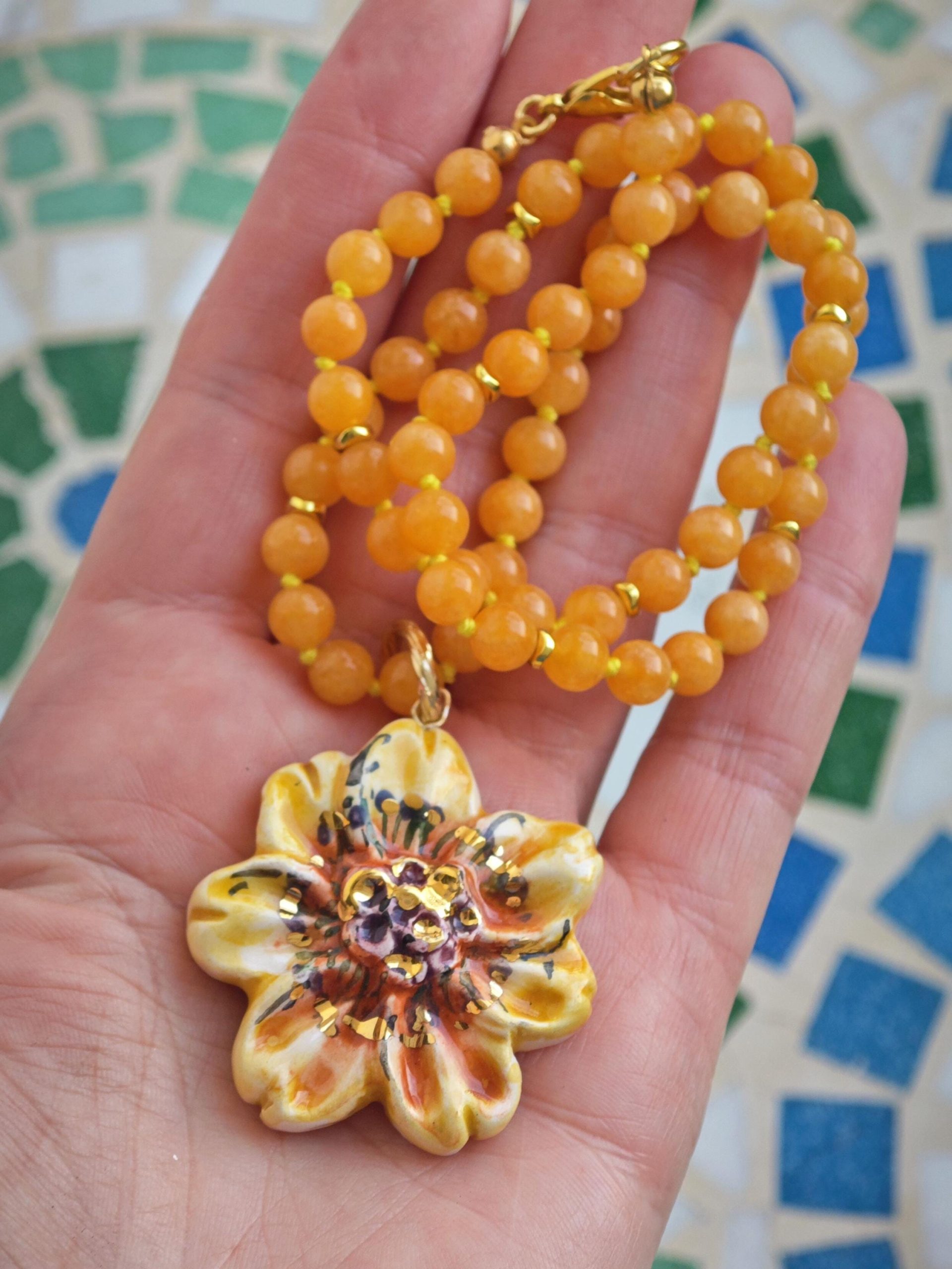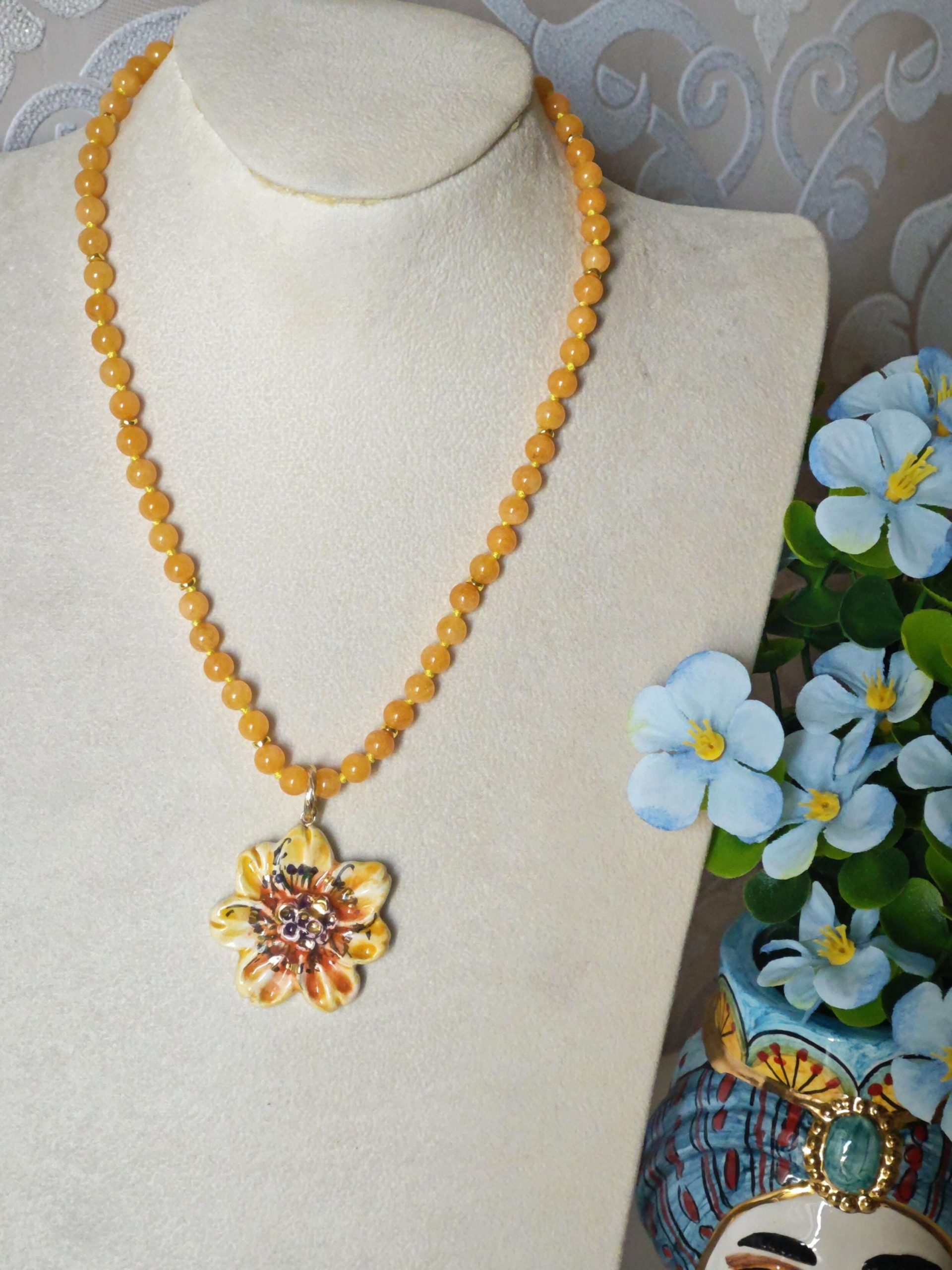 Collana DAISY con fiore in ceramica di Caltagirone e pietre dure agata gialla, collana siciliana