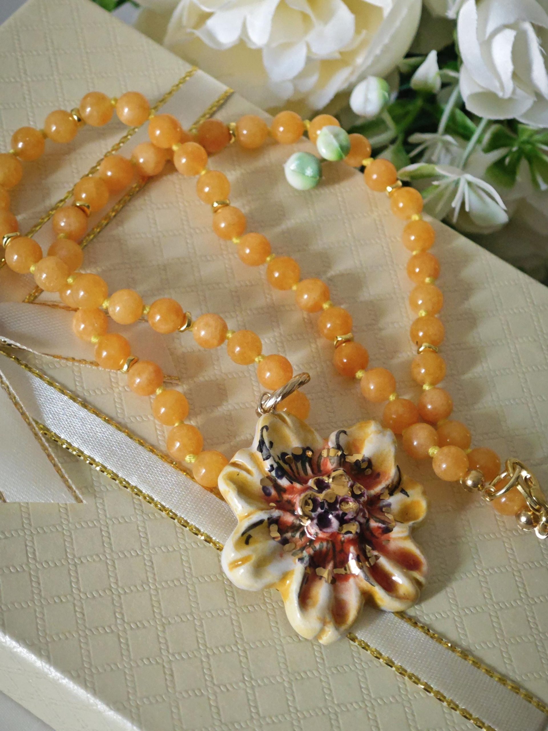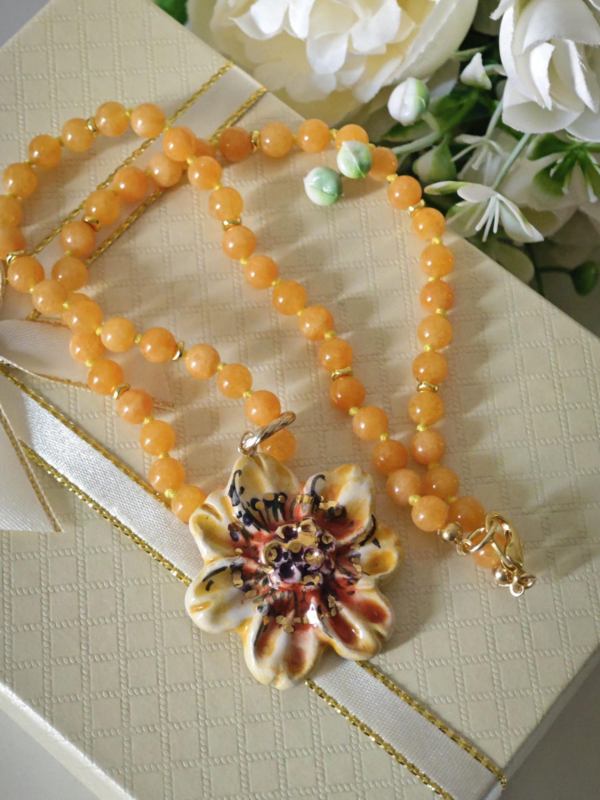 La collana è composta da sfere di agata gialla lucida 6 mm, che riflettono una luce calda e accogliente. Il pendente, realizzato in ceramica di Caltagirone, rappresenta un fiore di 4 cm diametro,dipinto a mano con dettagli vivaci e delicati, simbolo di artigianato tradizionale siciliano. Il design rimuovibile del pendente ti consente di adattare la collana in base al tuo stile, aggiungendo un tocco di personalità a ogni look.
