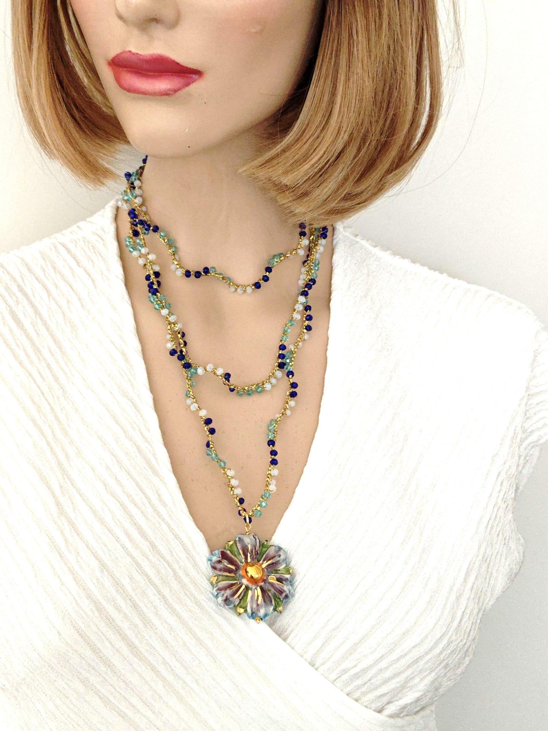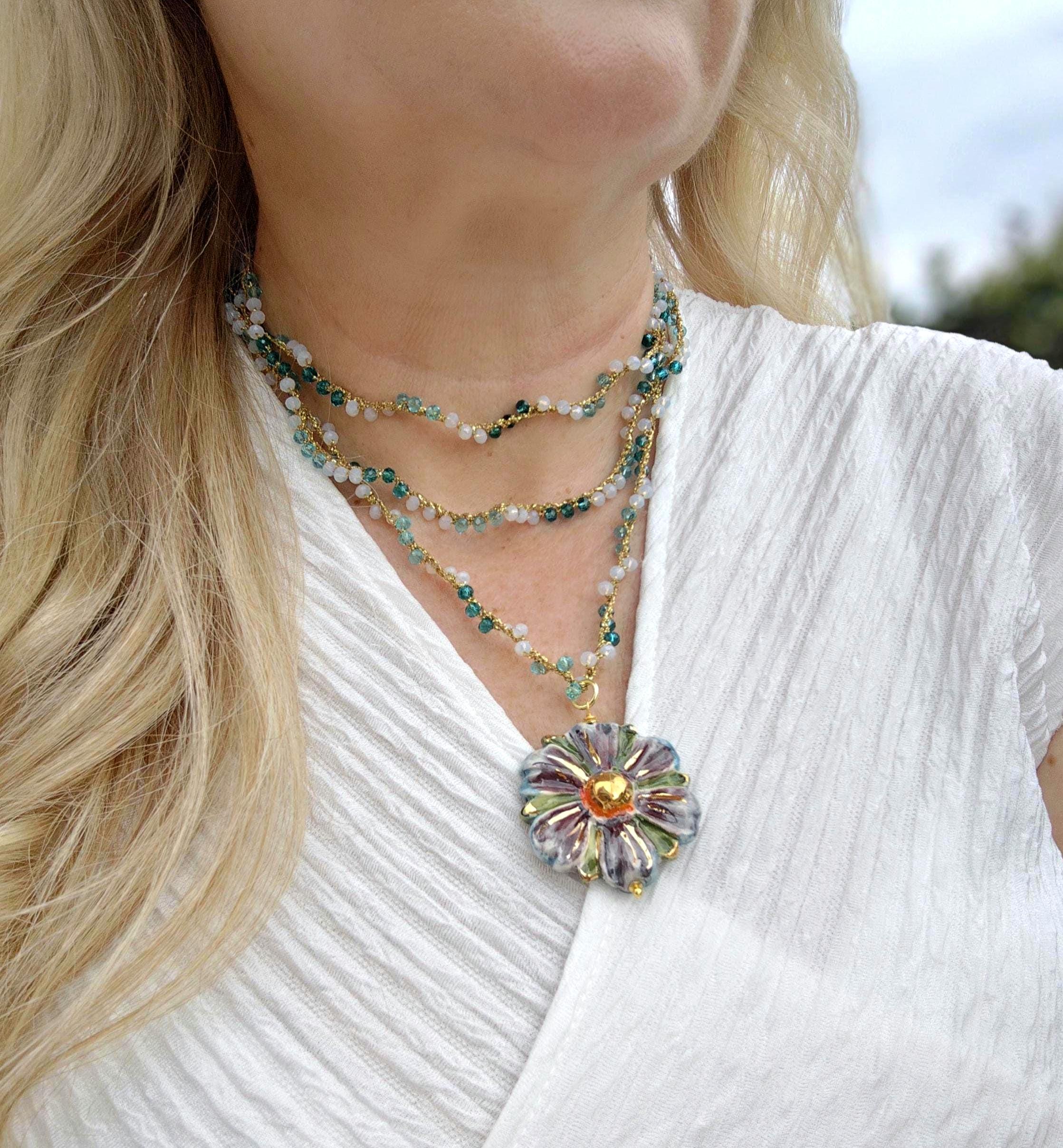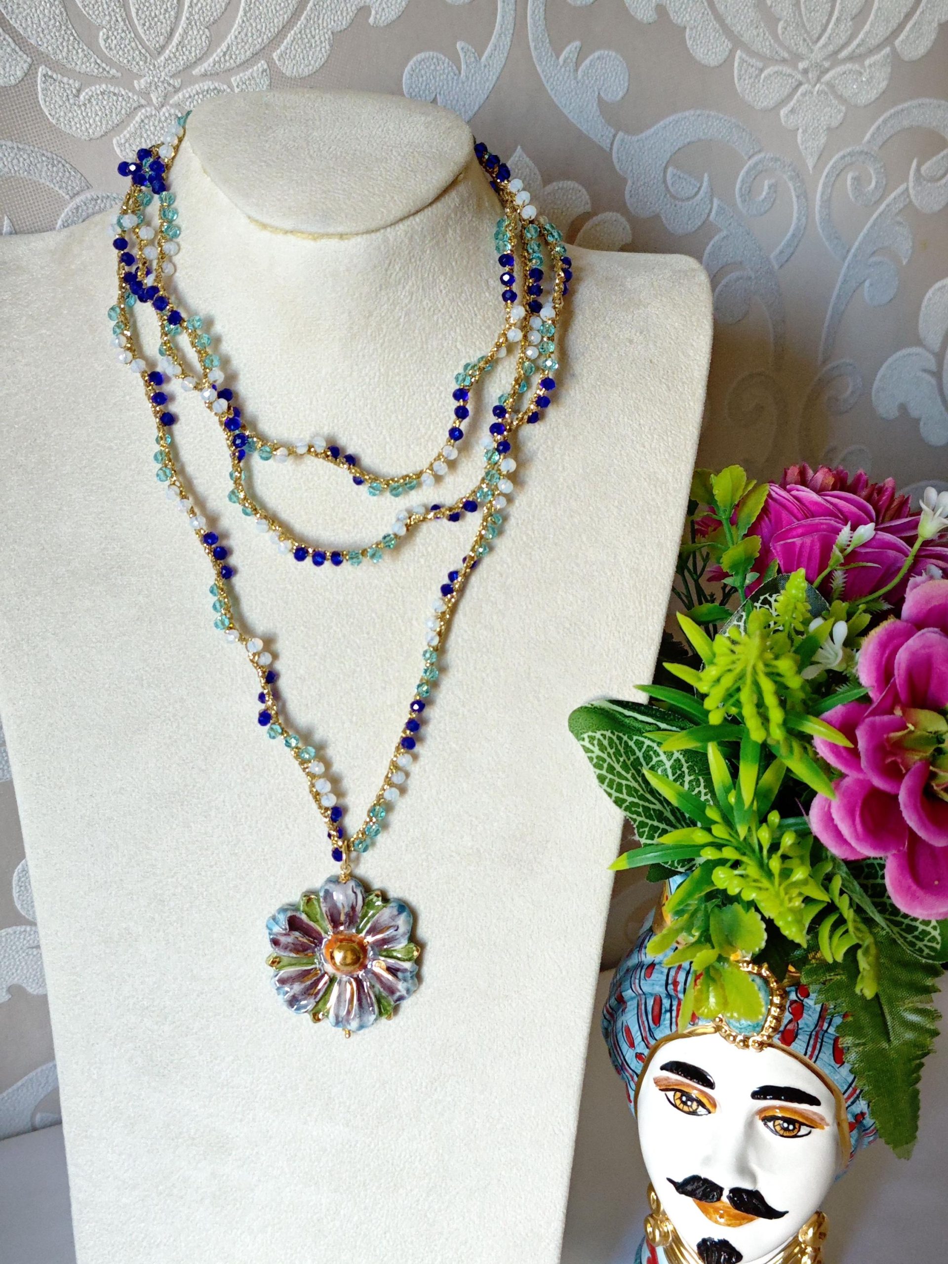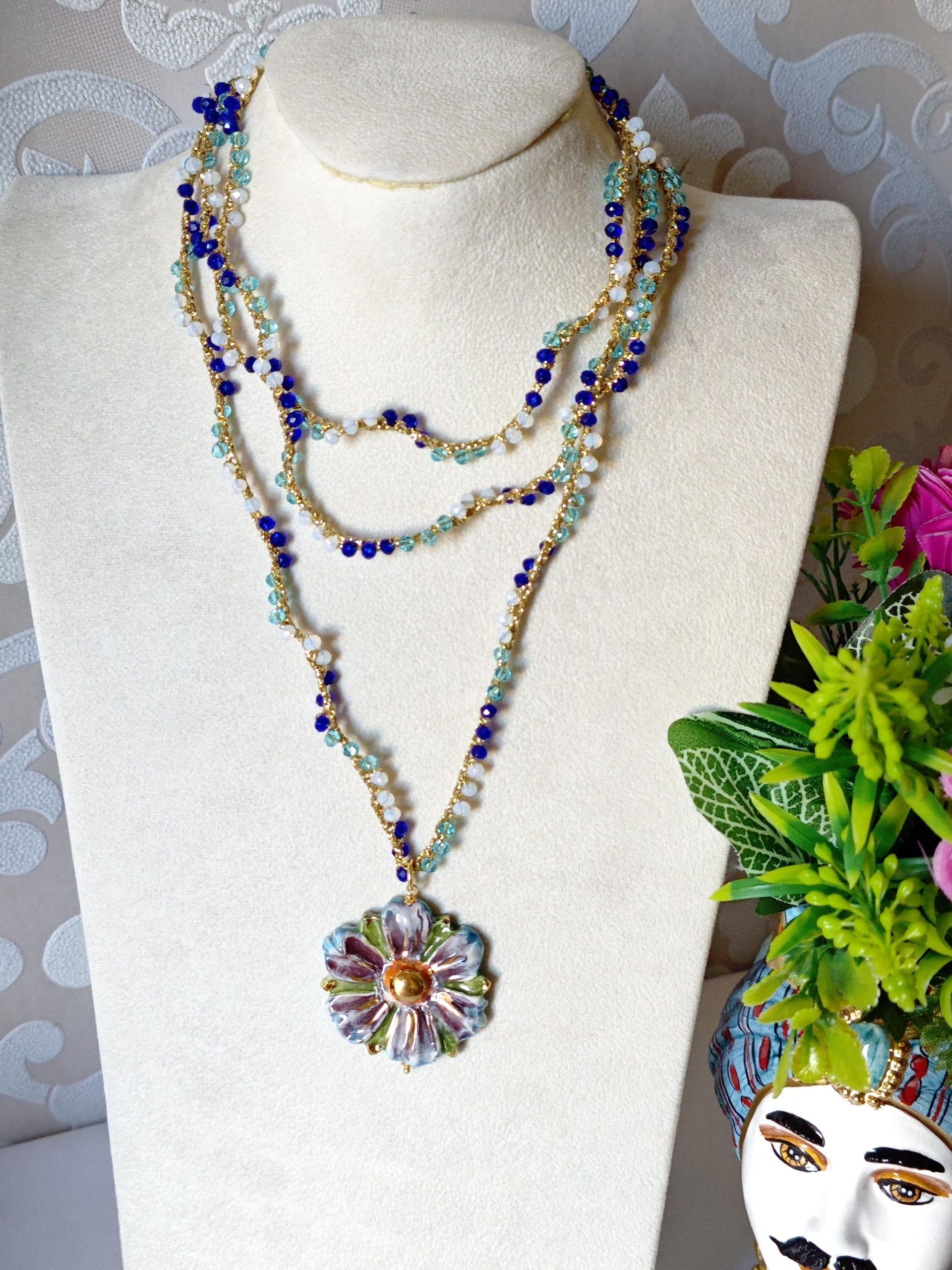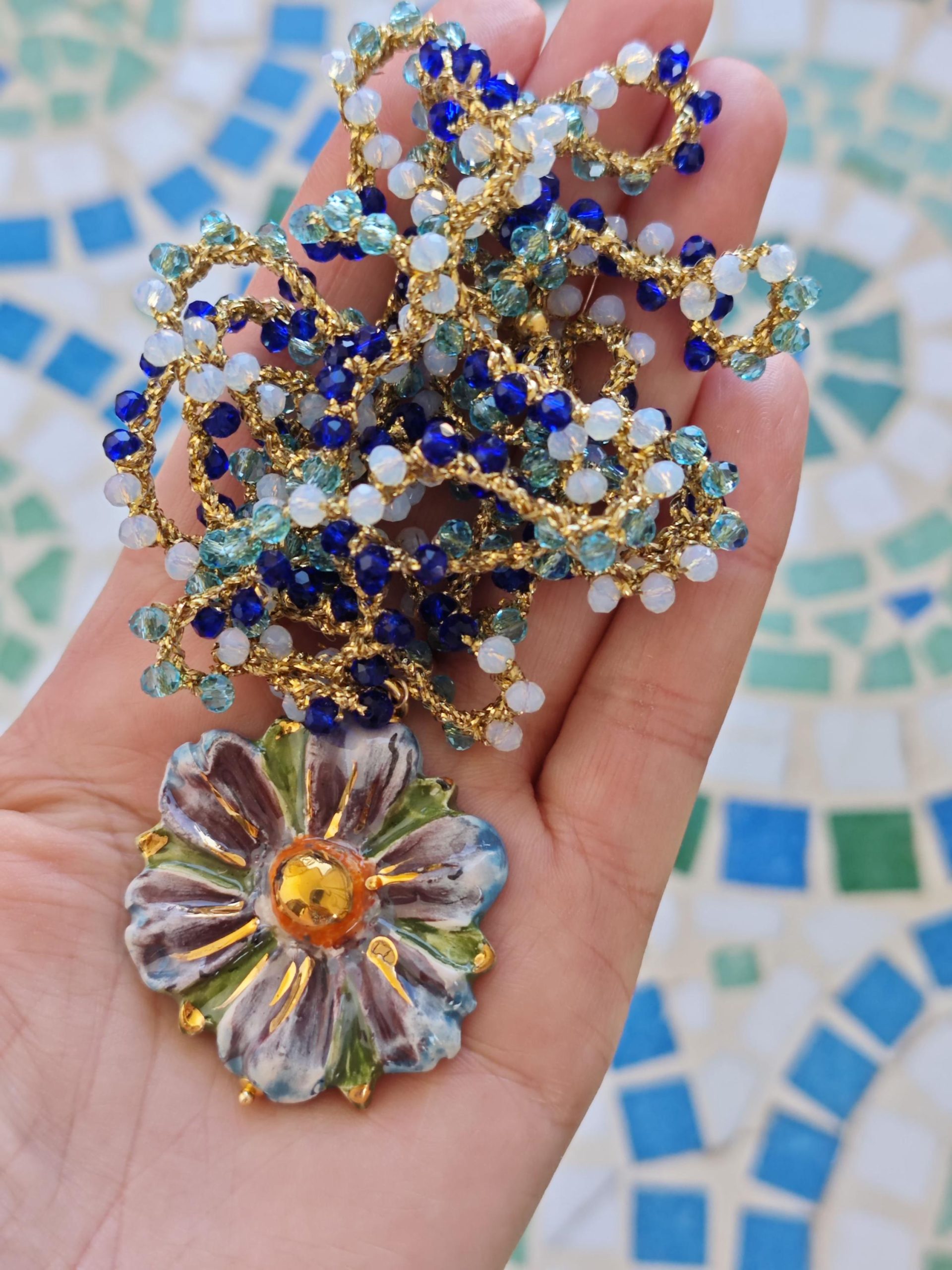 Collana fiore ceramica di Caltagirone e cristalli , collana rosario siciliana