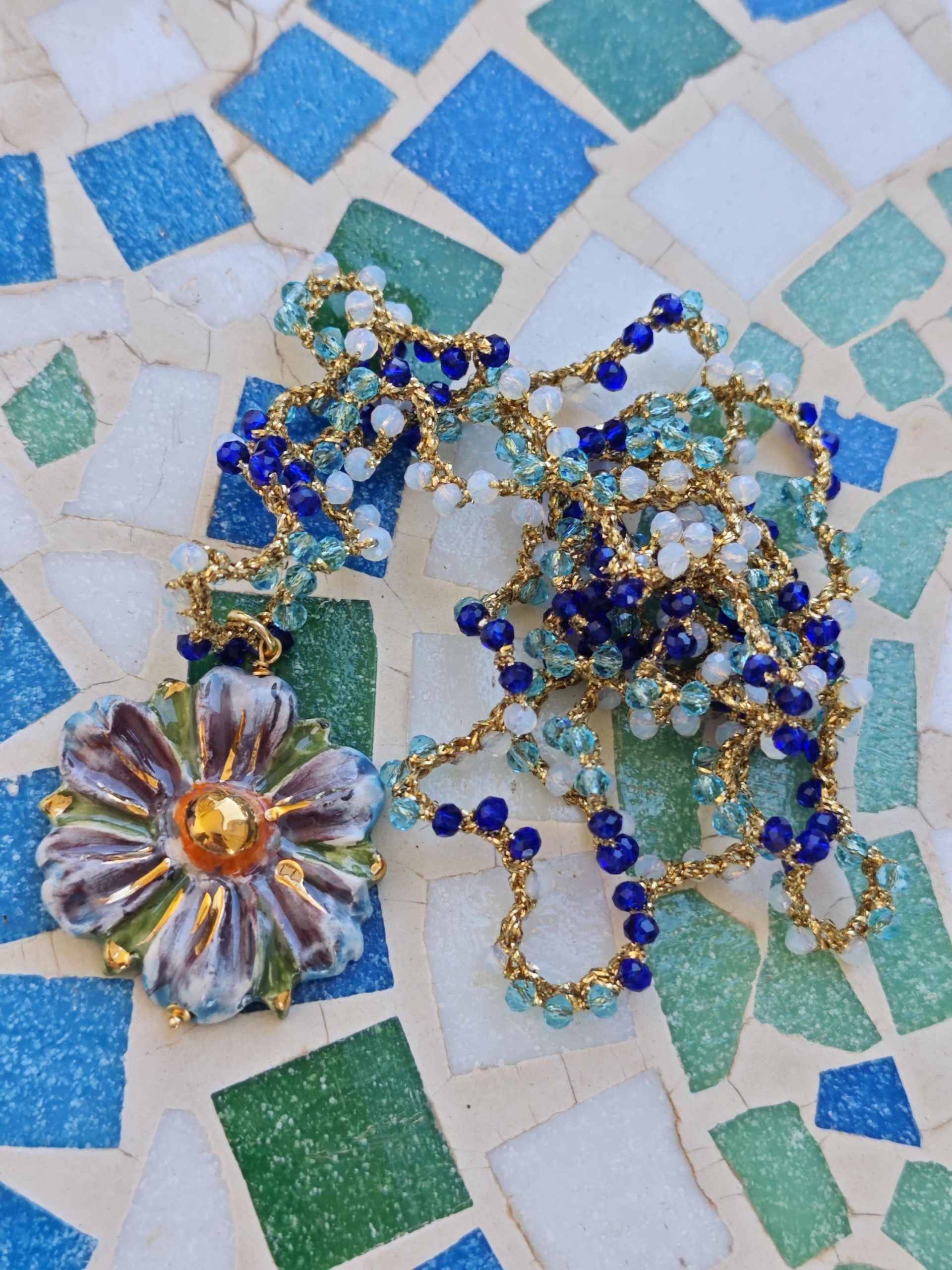 Questa collana lunga artigianale è un gioiello unico e versatile, realizzato interamente a mano all’uncinetto con filo lurex dorato e impreziosito da cristalli luminosi nei toni del blu, azzurro e bianco. Il protagonista è un raffinato ciondolo a forma di fiore in ceramica di Caltagirone, dipinto a mano secondo l’autentica tradizione siciliana. Diametro fiore 4 cm.