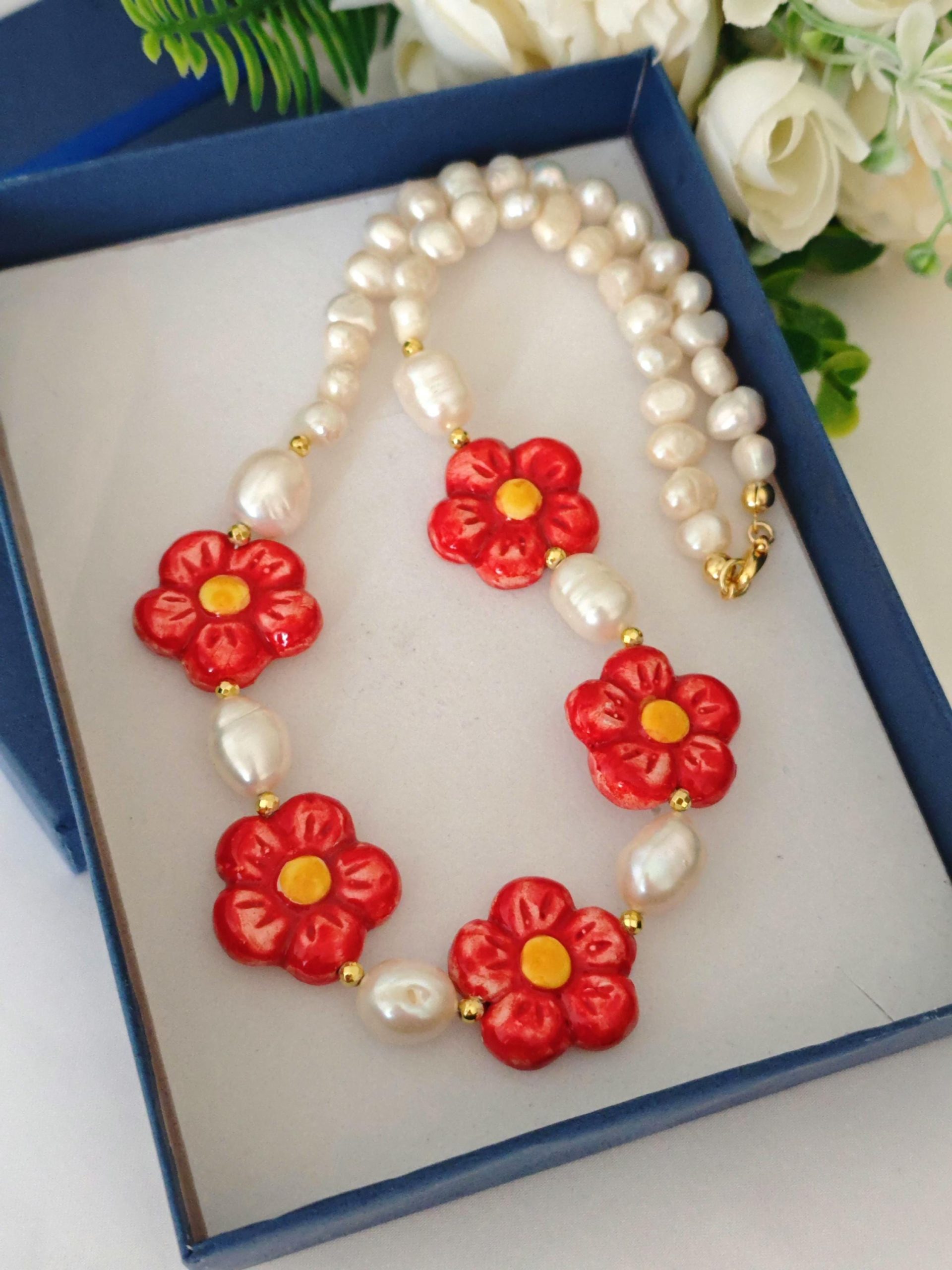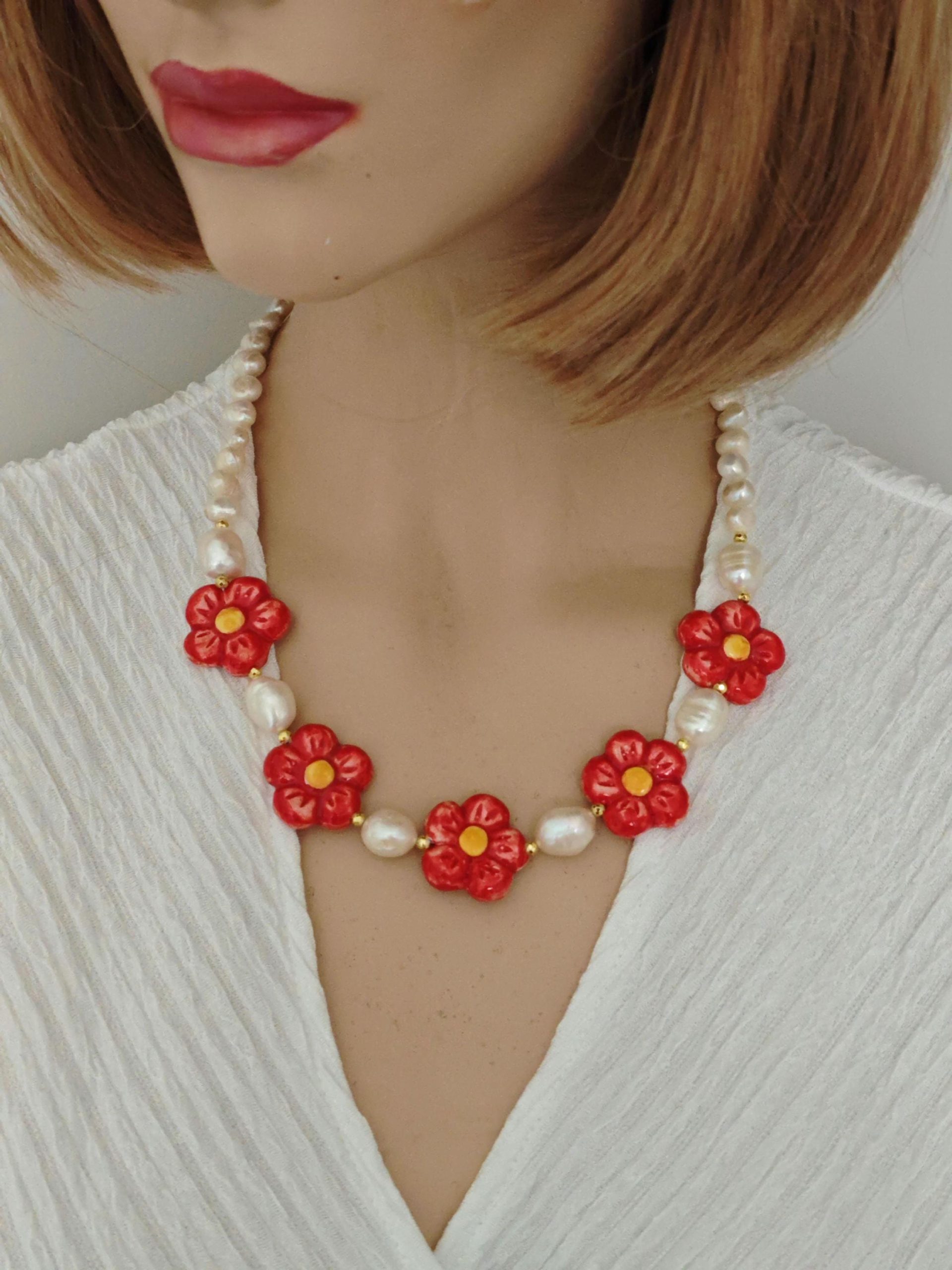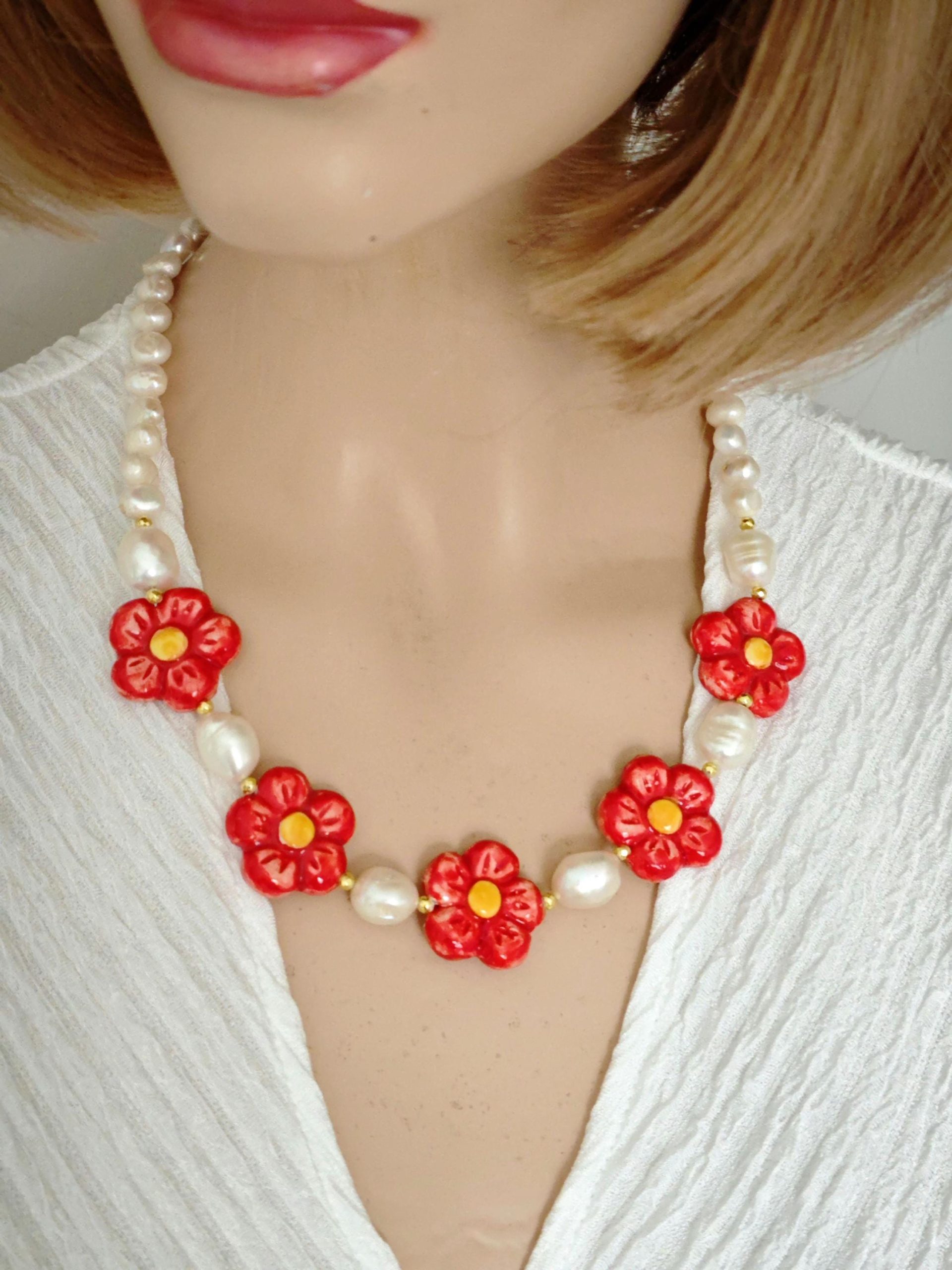 Collana realizzata con fiori in ceramica di Caltagirone realizzata e dipinta a mano, 2,5 cm diametro, perle bianche barocche naturali annodate, chiusura a moschettone in ottone dorato.