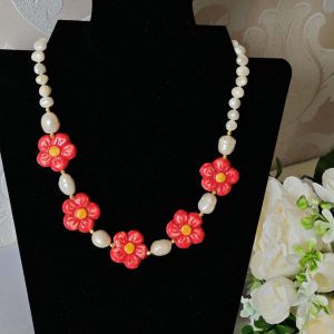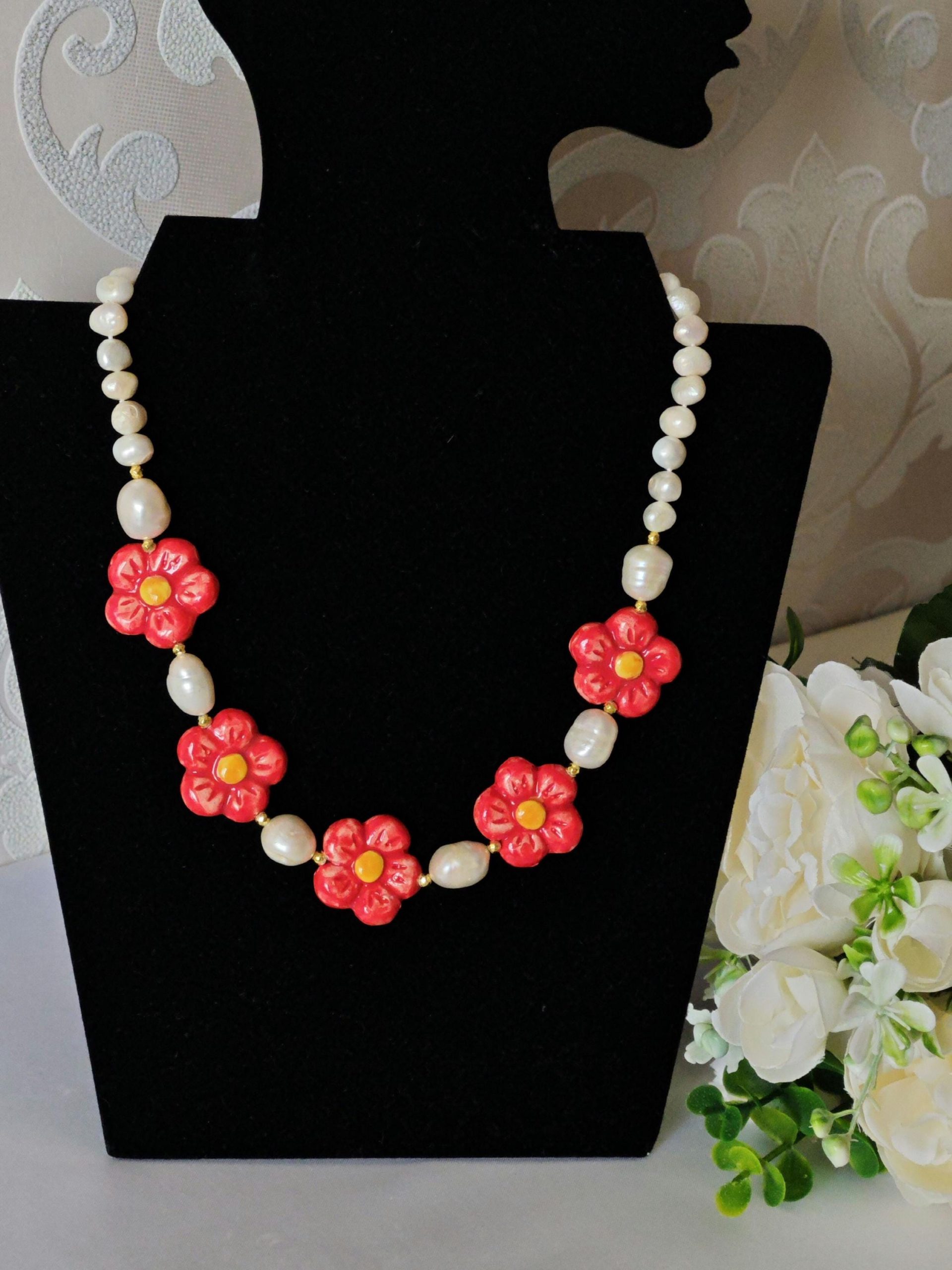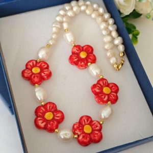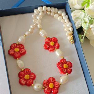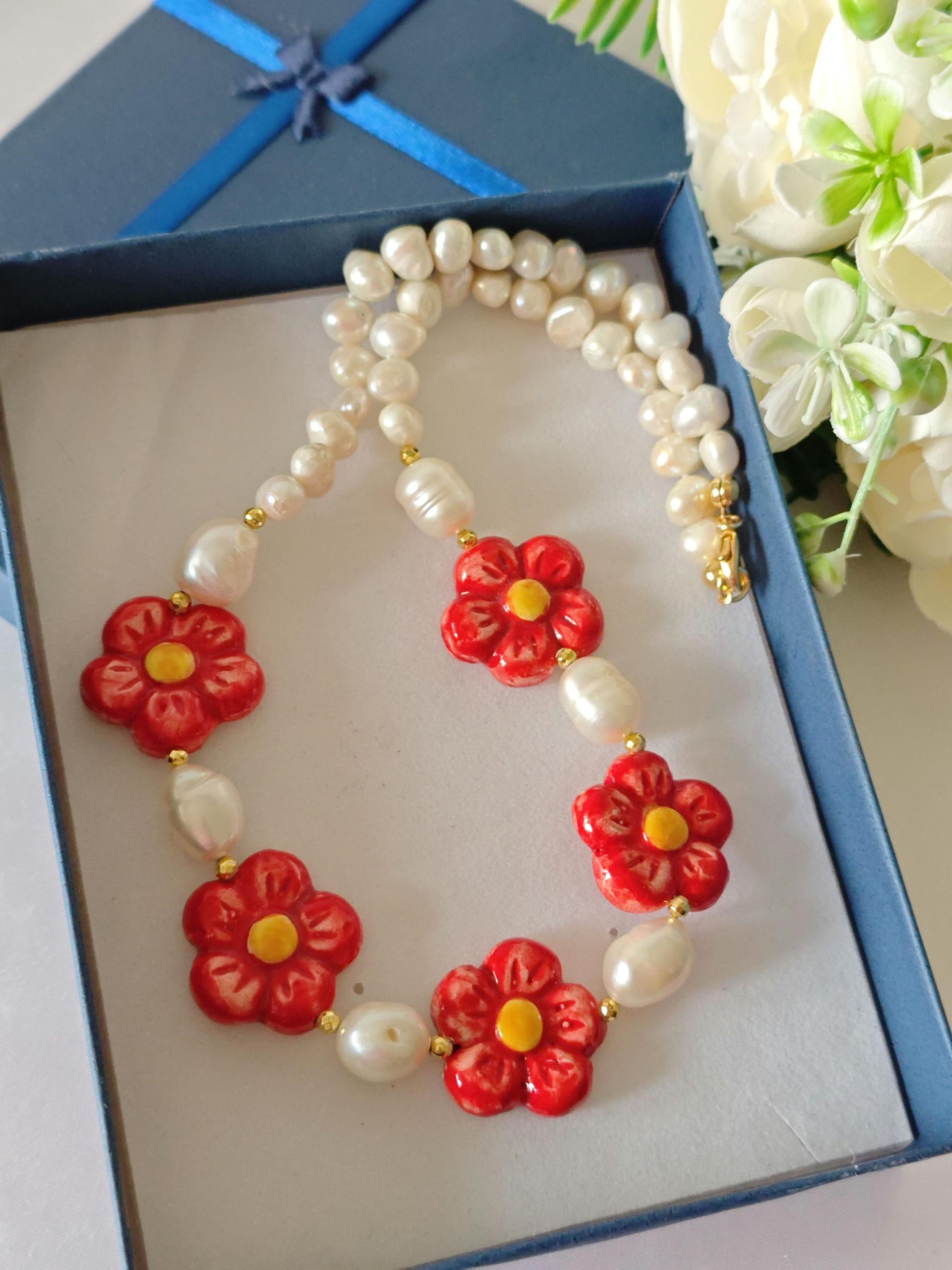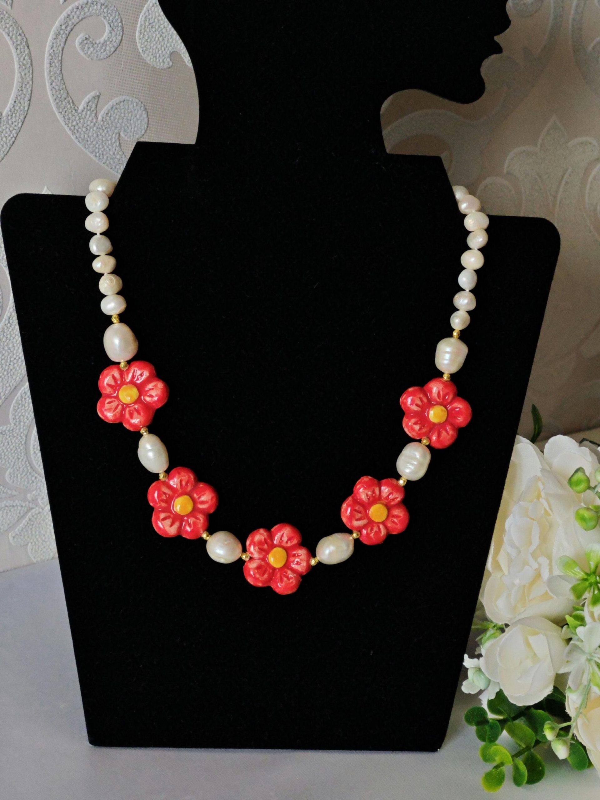 Collana realizzata con fiori in ceramica di Caltagirone realizzata e dipinta a mano, 2,5 cm diametro, perle bianche barocche naturali annodate, chiusura a moschettone in ottone dorato.