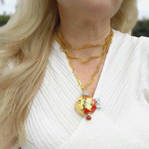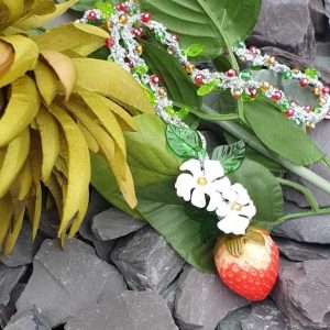 Questa collana artigianale è un delicato pezzo realizzato a mano con tecniche di uncinetto con filo lurex dorato/ argentato. Ogni dettaglio è curato con attenzione per creare un design elegante e fresco. La base della collana è intrecciata con cristalli scintillanti e foglioline di resina che aggiungono un tocco naturale e vivace. Al centro, un’incantevole pendente in resina raffigura una fragola rossa con fiori bianchi, anch’essi in resina, che donano un aspetto fresco e primaverile. Questo gioiello è perfetto per chi cerca un accessorio unico, raffinato e che cattura la bellezza della natura. Ideale da indossare in occasioni speciali o come tocco di eleganza quotidiana. Un pezzo che non passa inosservato e aggiunge colore e originalità a qualsiasi outfit!