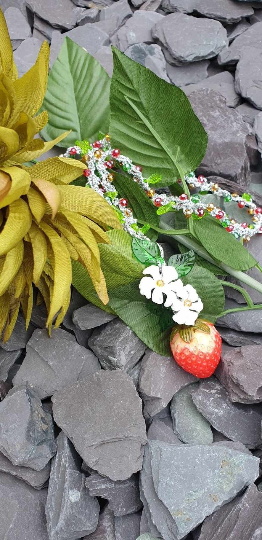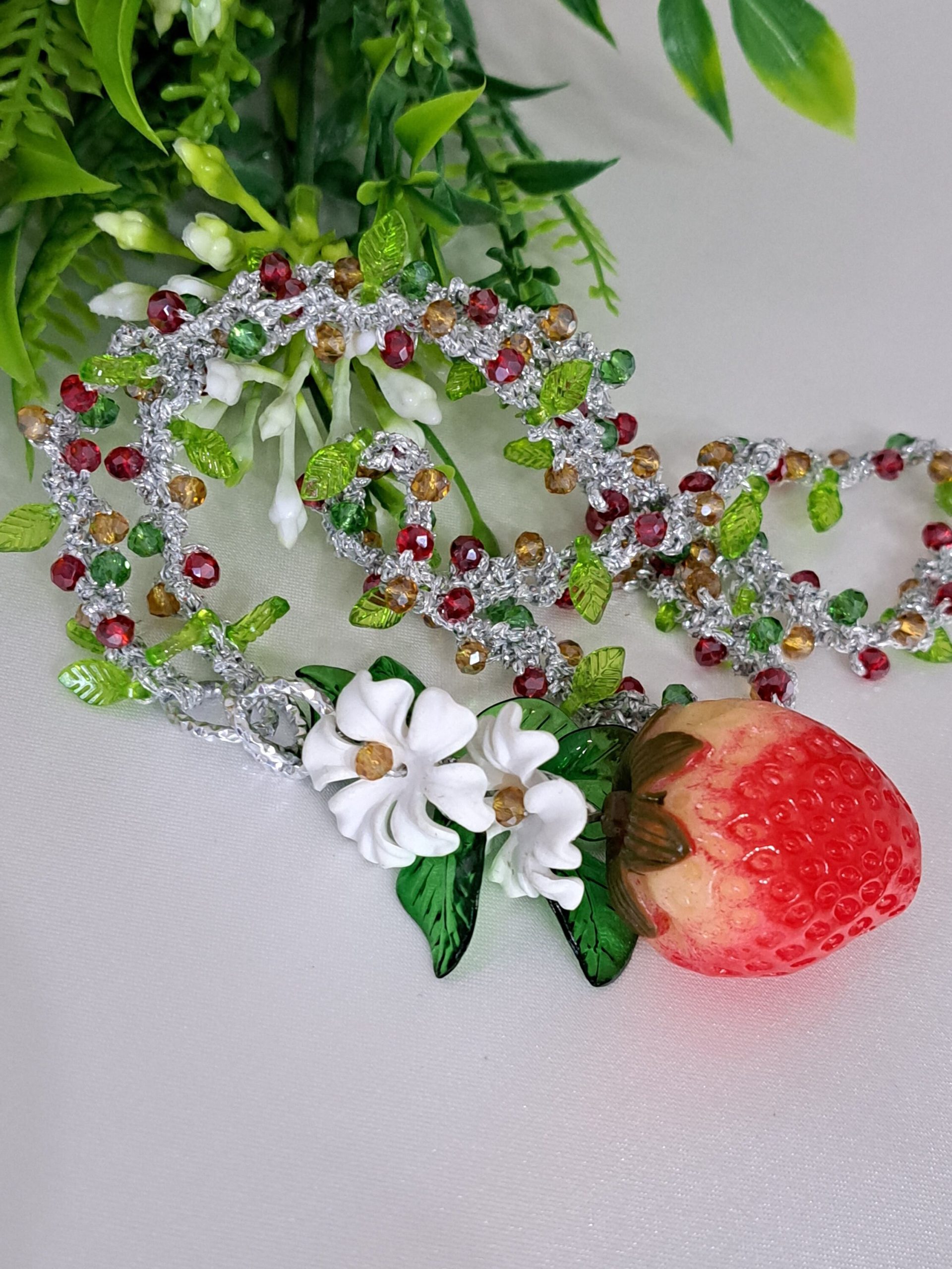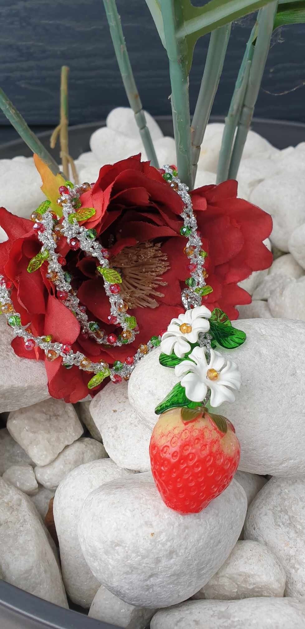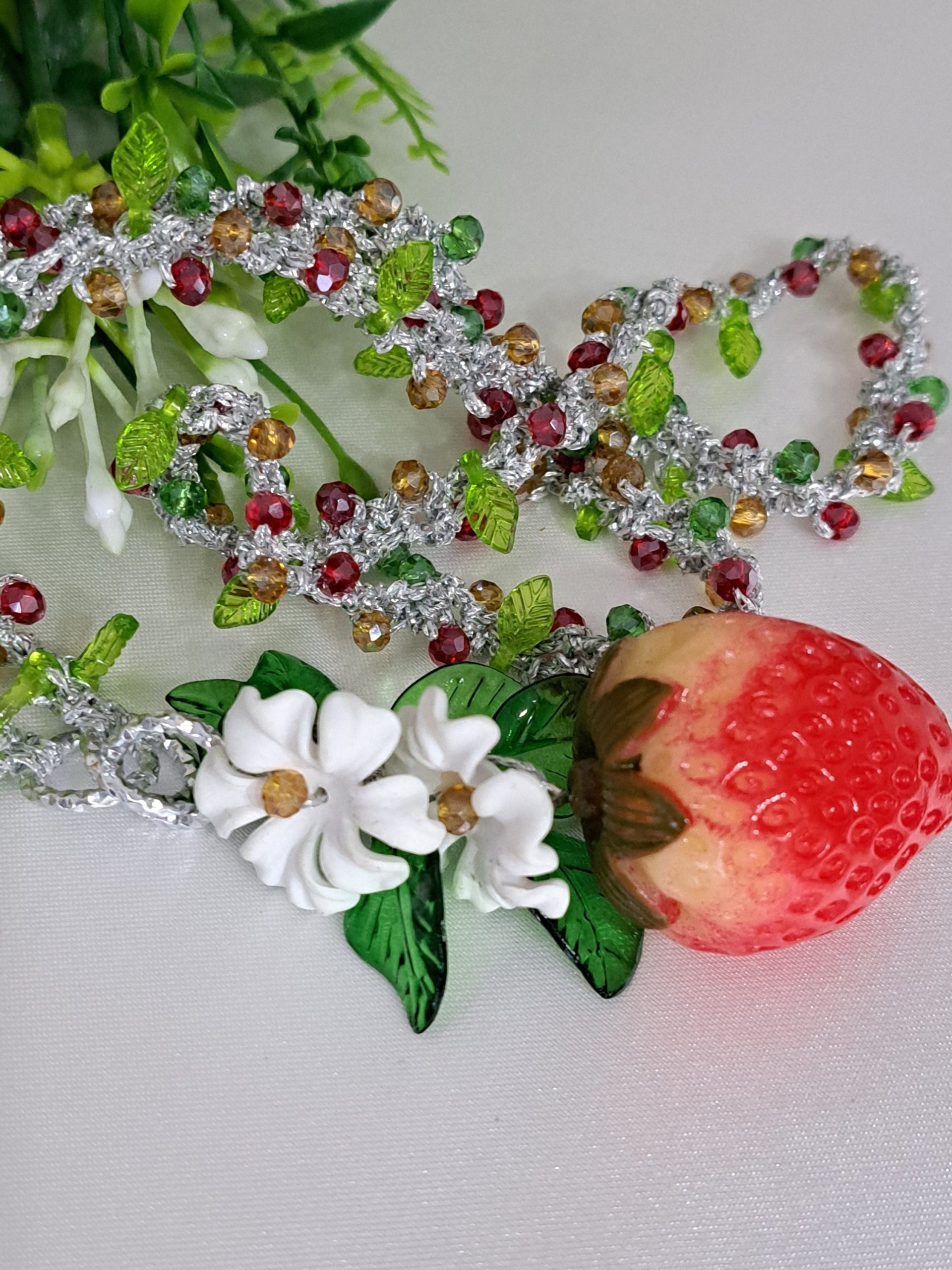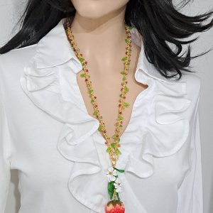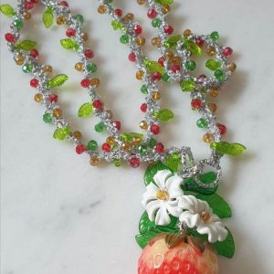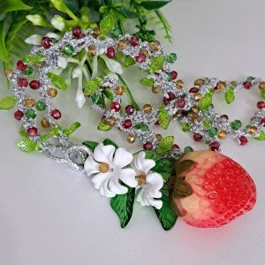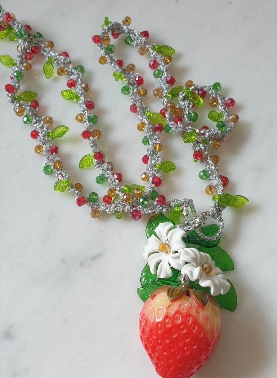 Collana fragole, fiori e cristalli , collana siciliana, collana lunga handmade