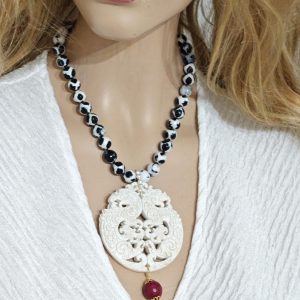 Collana pietre dure agata tibetana , perle bianche barocche e  pendente mandala giada itagliata