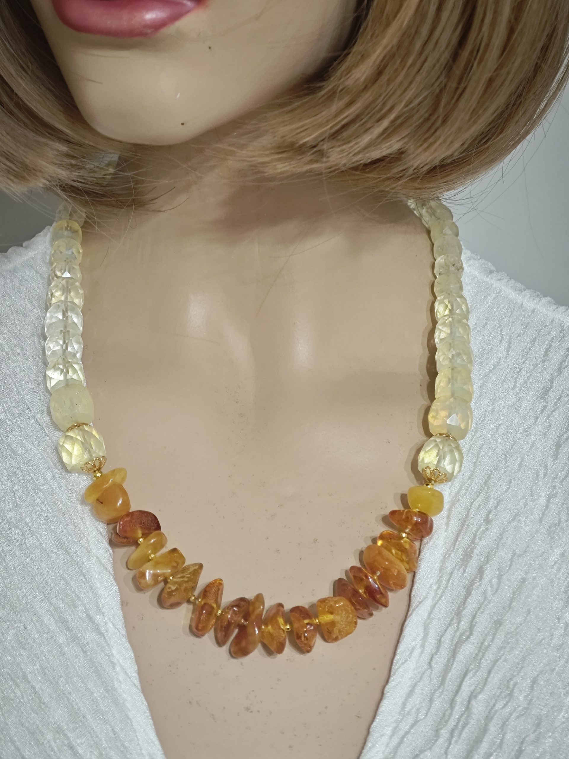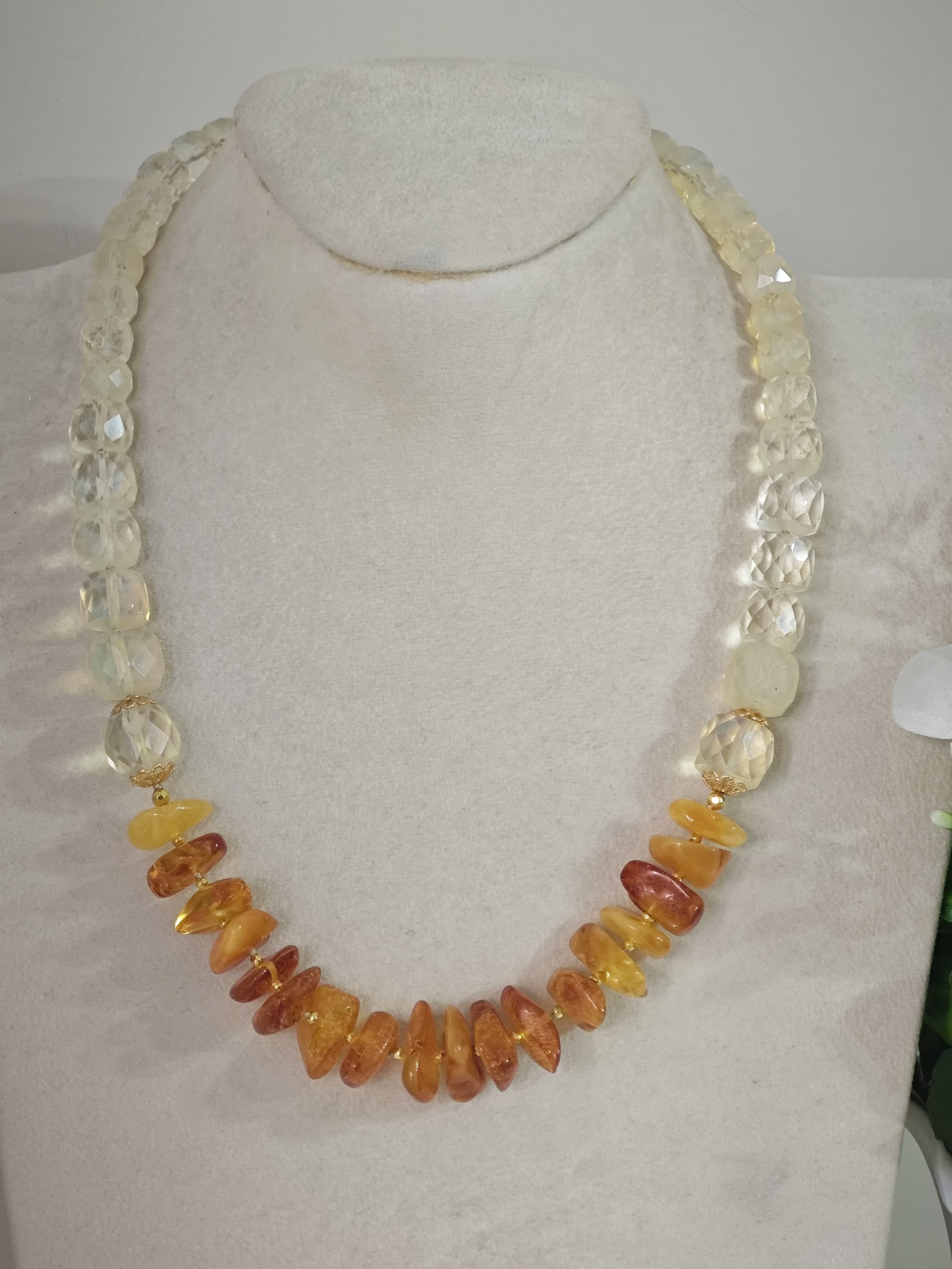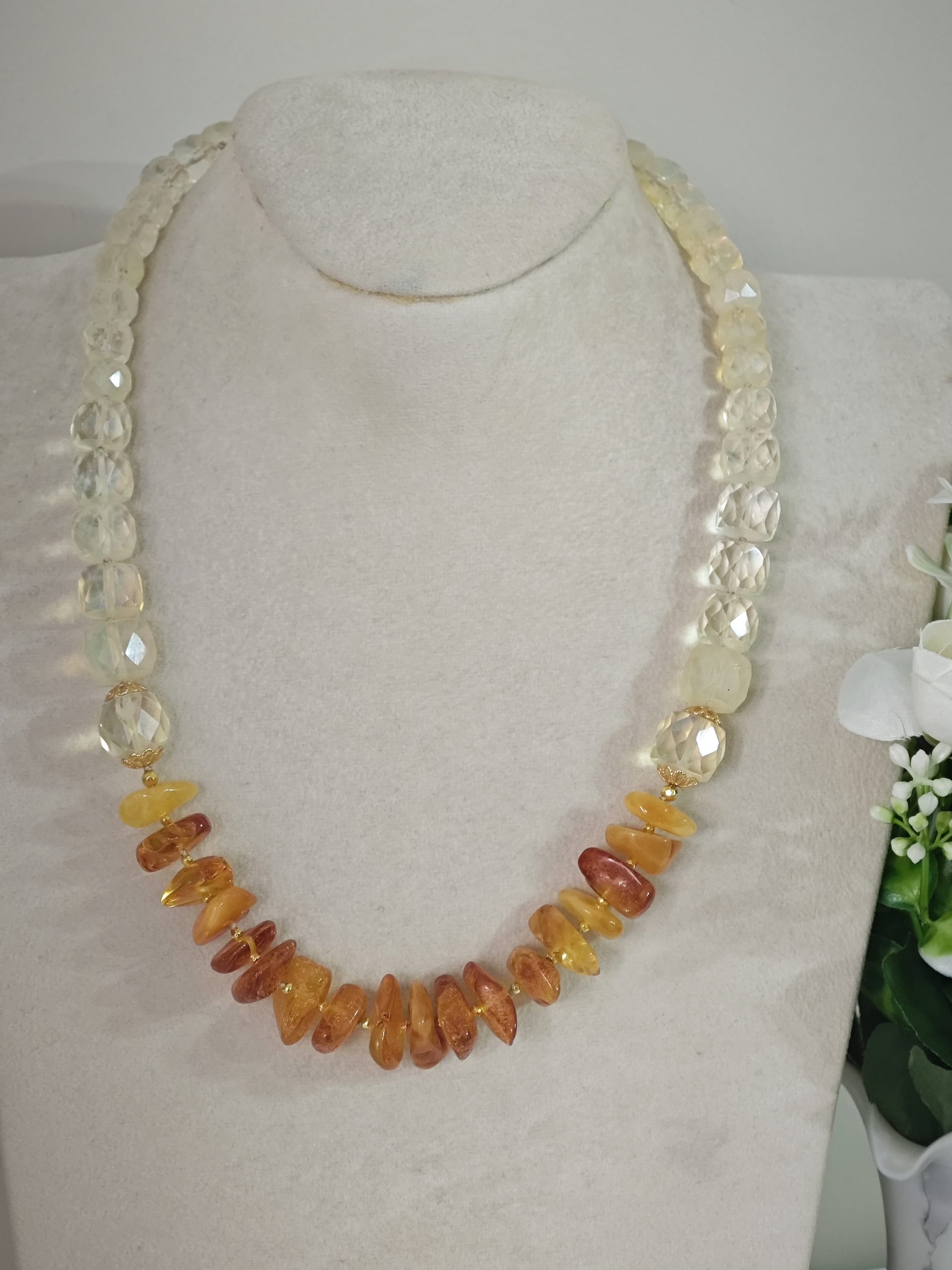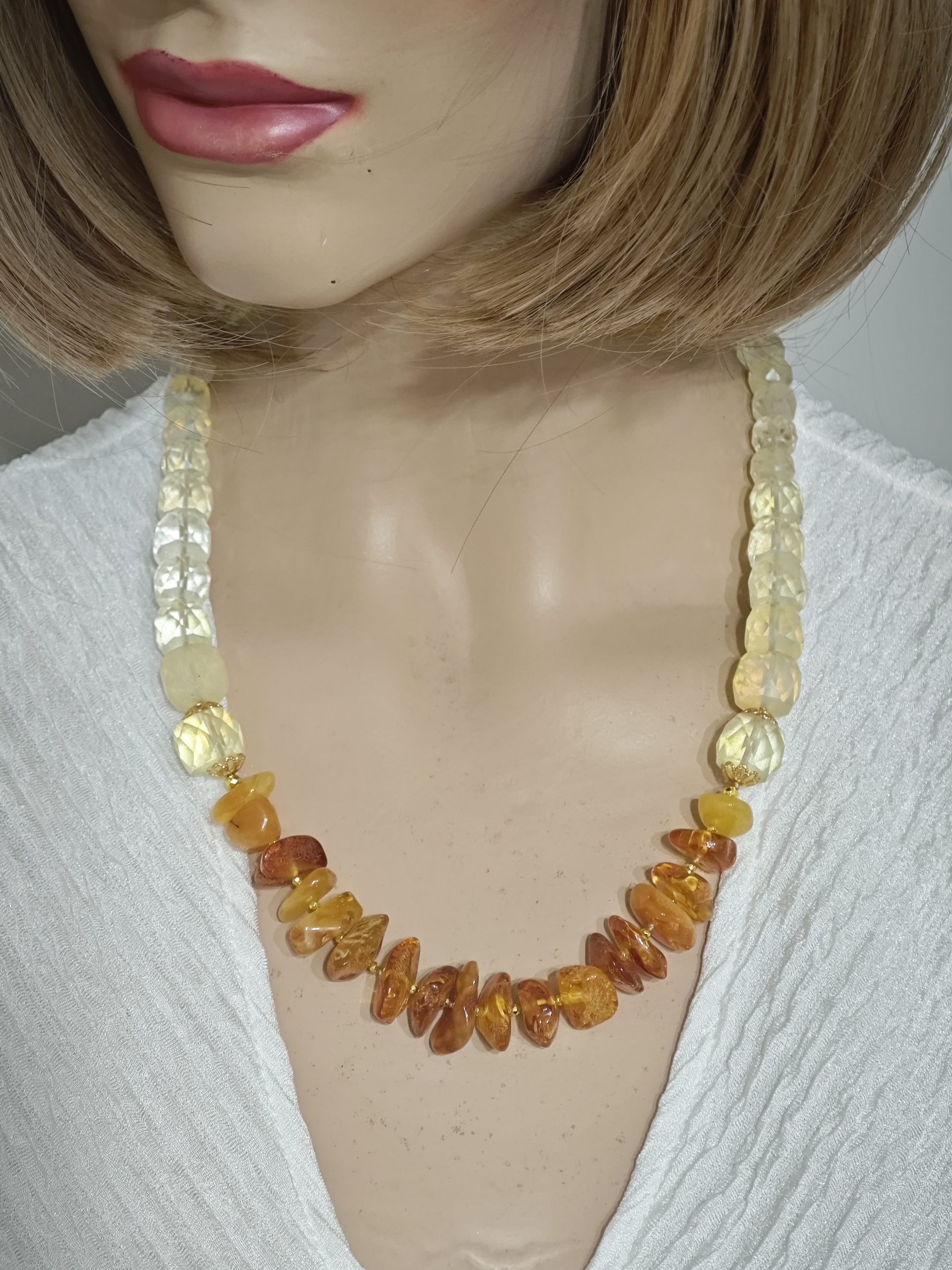 Bellissima collana girocollo realizzata interamente a mano con chips grandi ambra baltica naturale e pietre dure naturali sfaccettate quarzo citrino .
