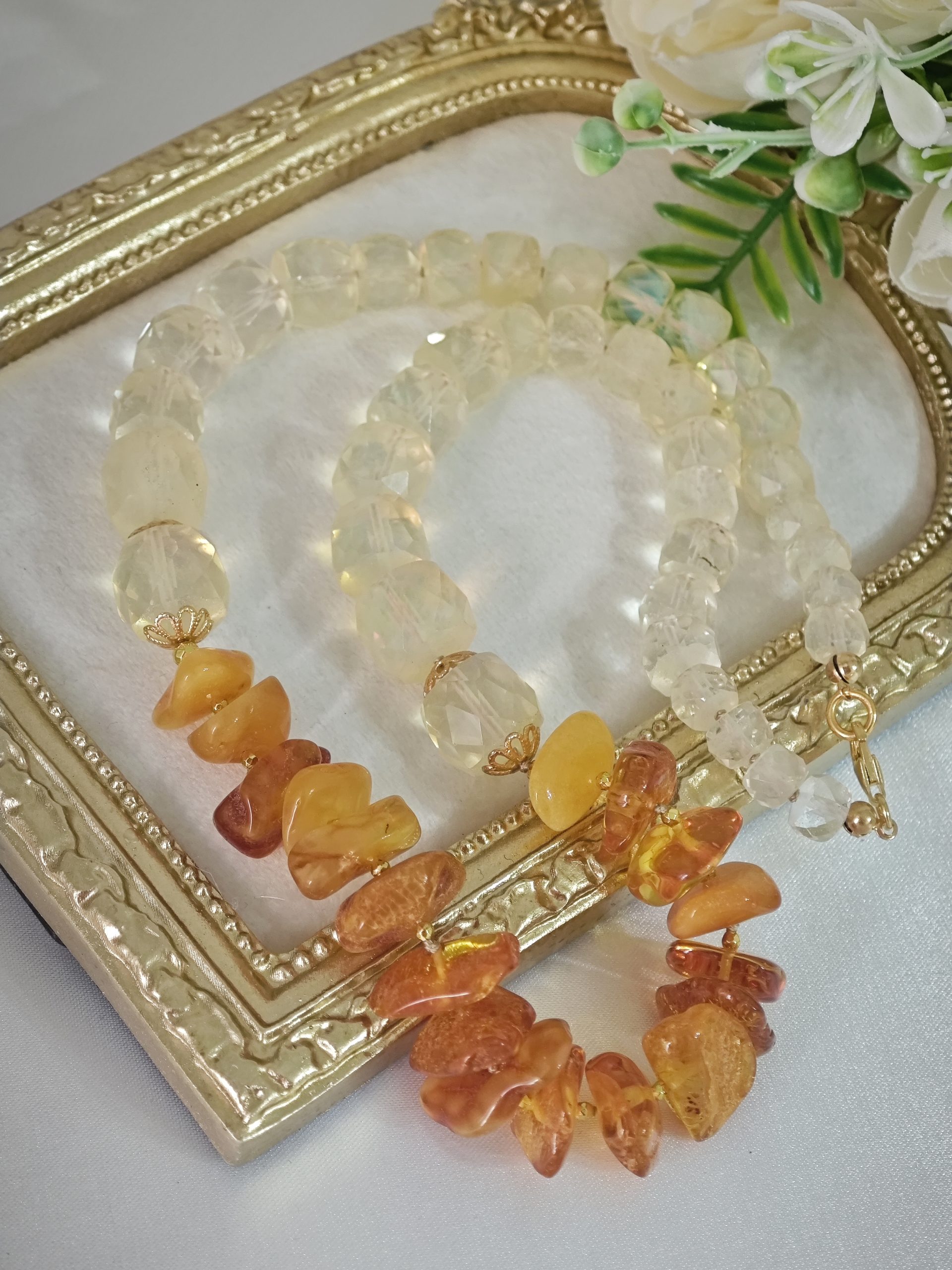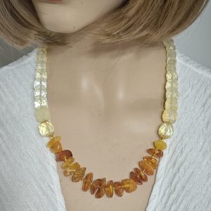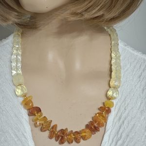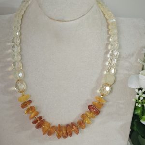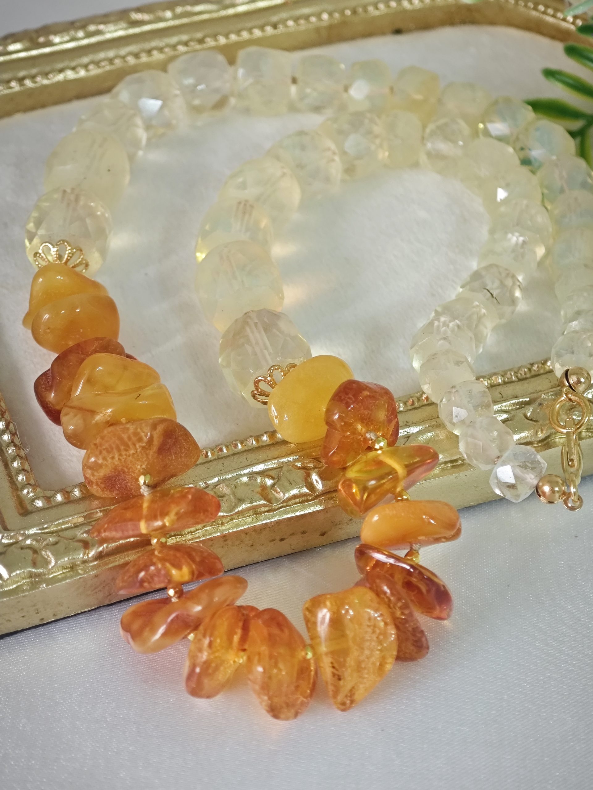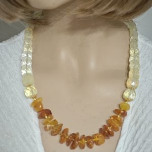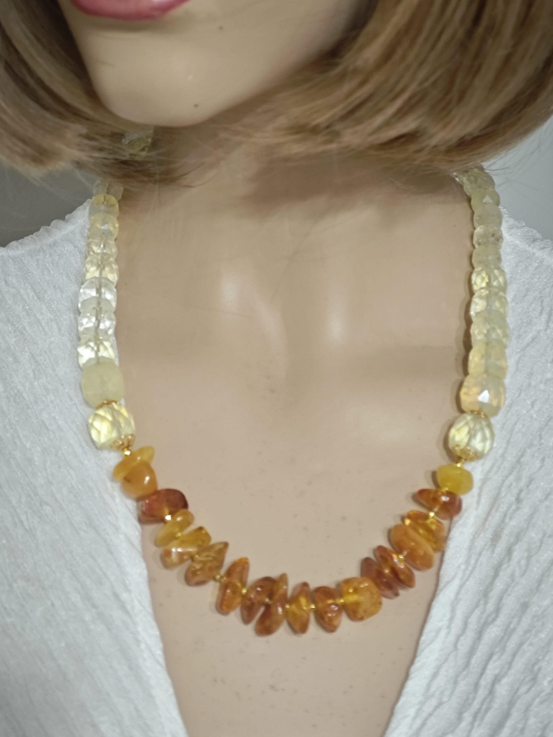 Bellissima collana girocollo realizzata interamente a mano con chips grandi ambra baltica naturale e pietre dure naturali sfaccettate quarzo citrino .