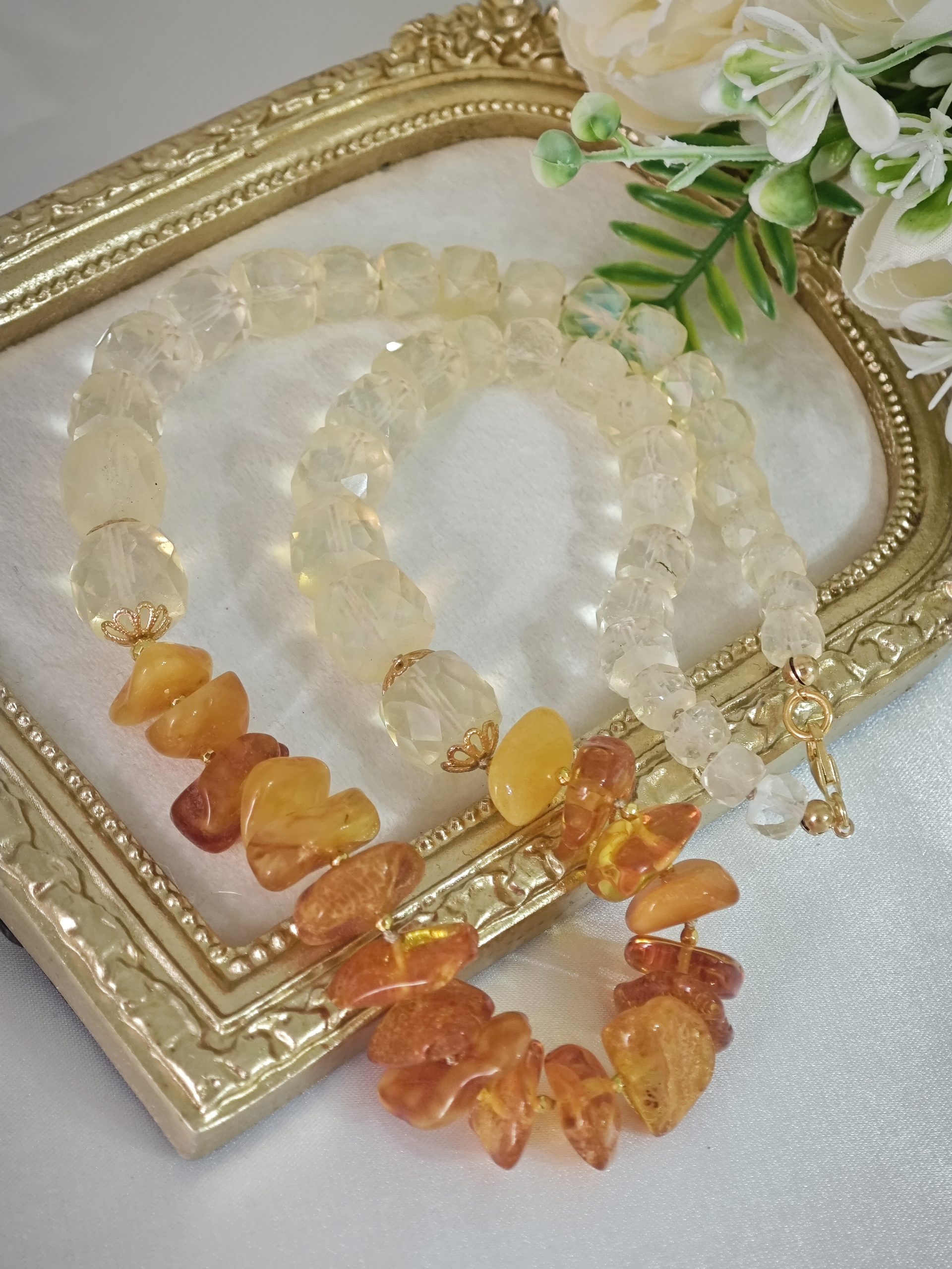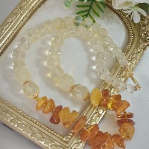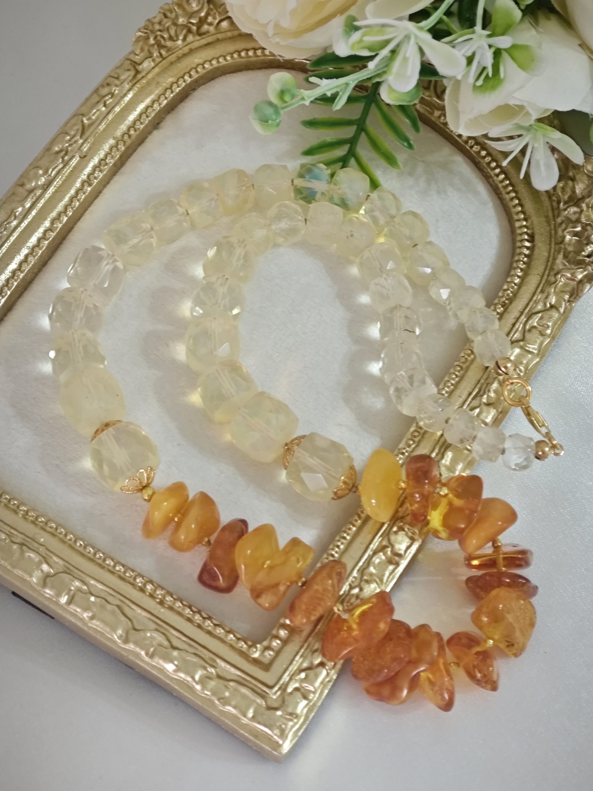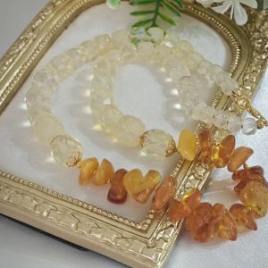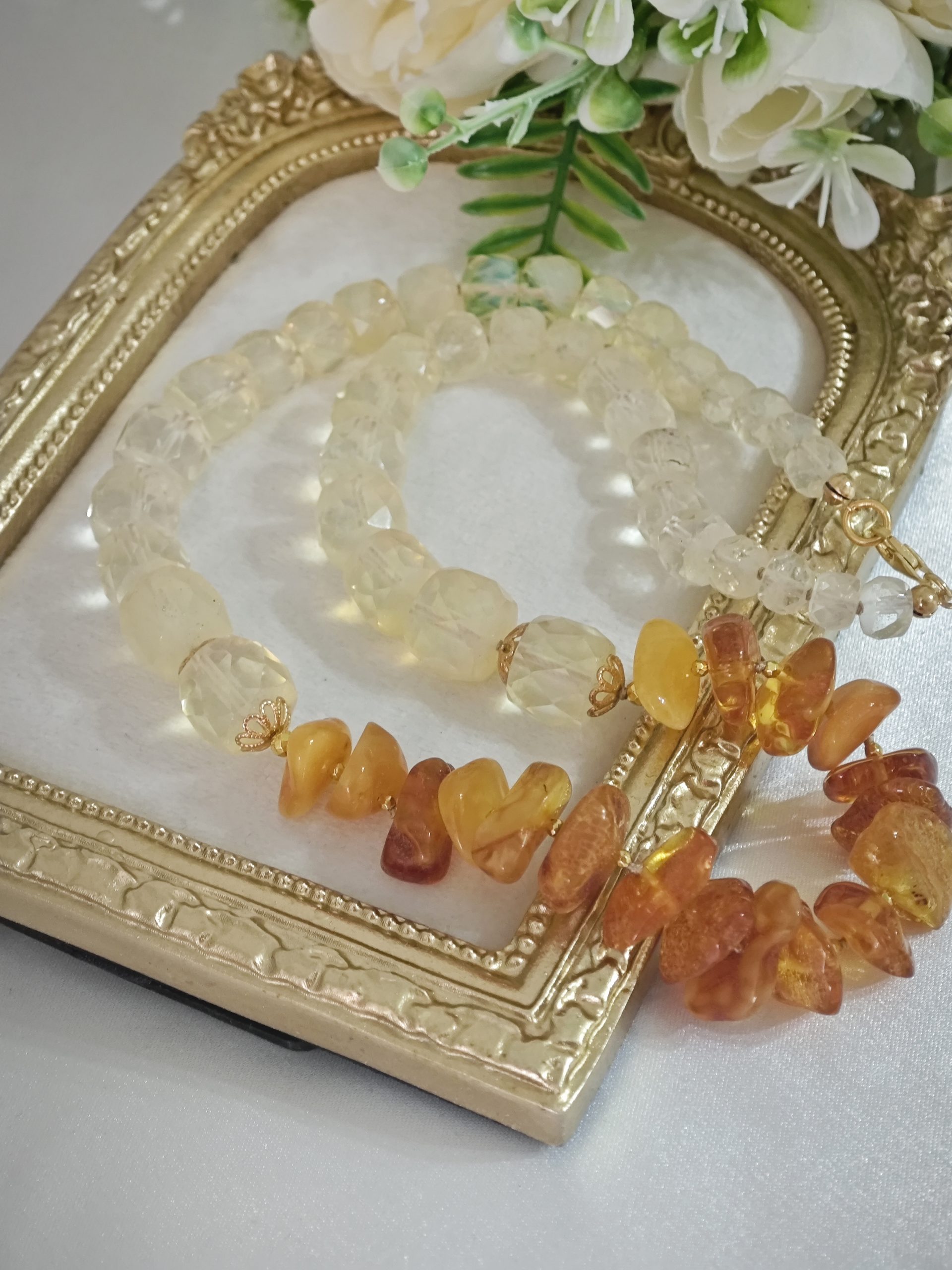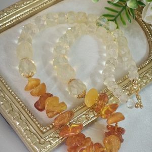 Bellissima collana girocollo realizzata interamente a mano con chips grandi ambra baltica naturale e pietre dure naturali sfaccettate quarzo citrino .