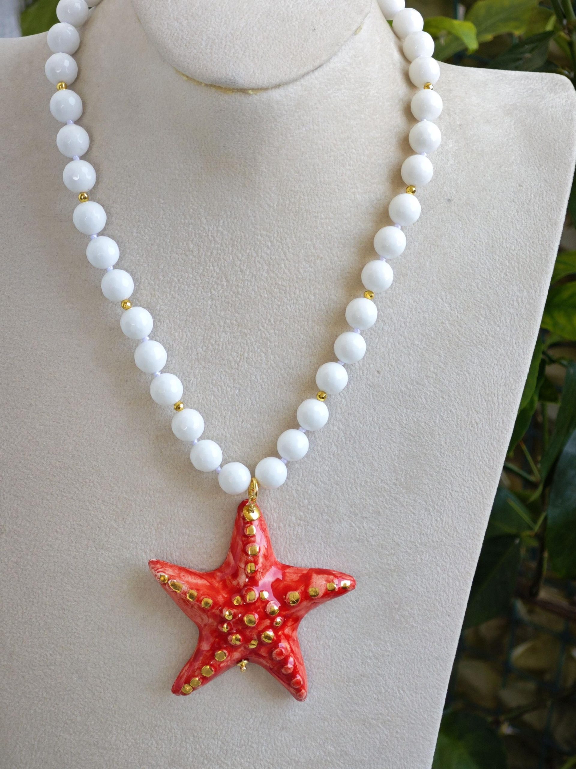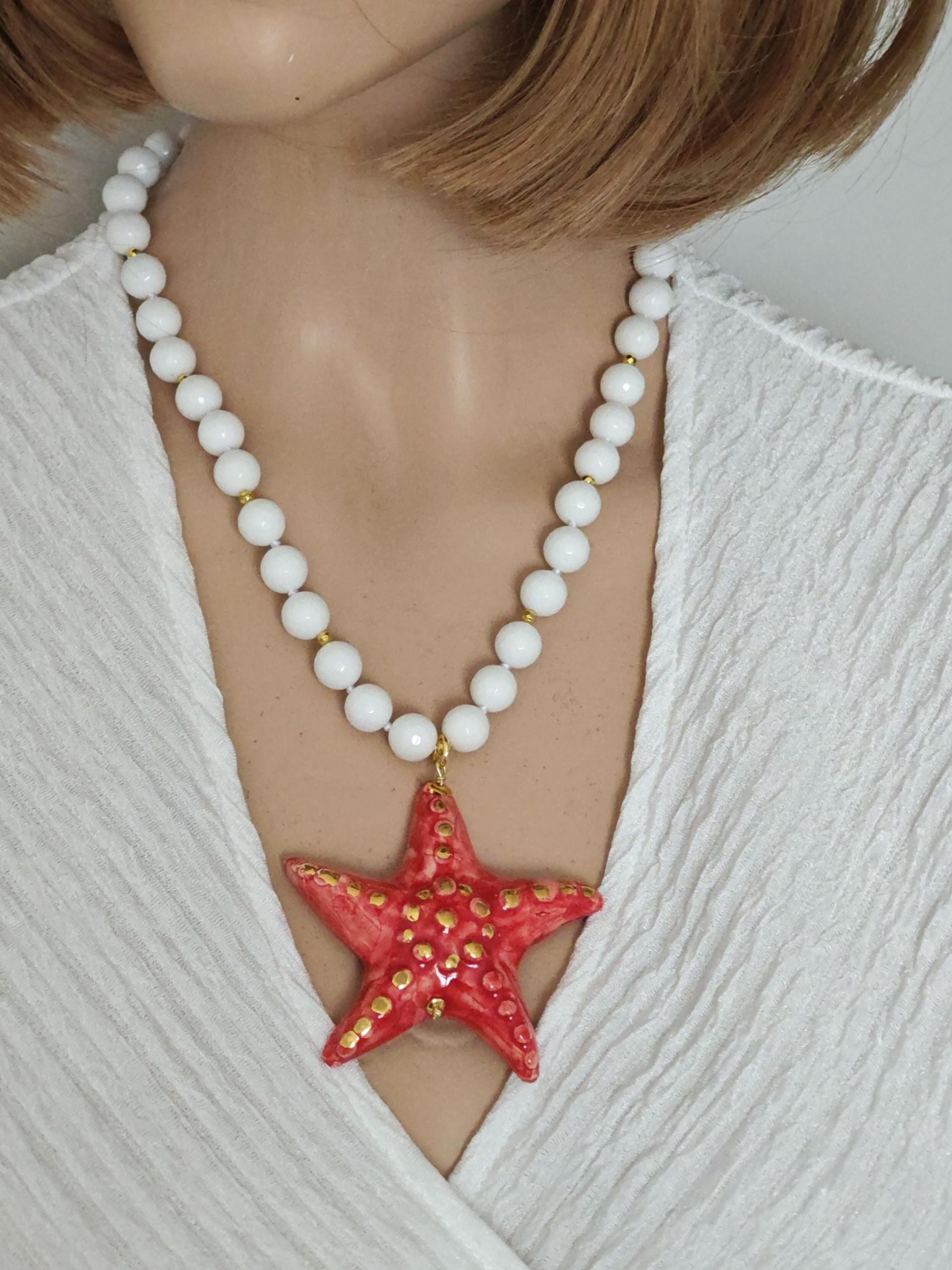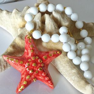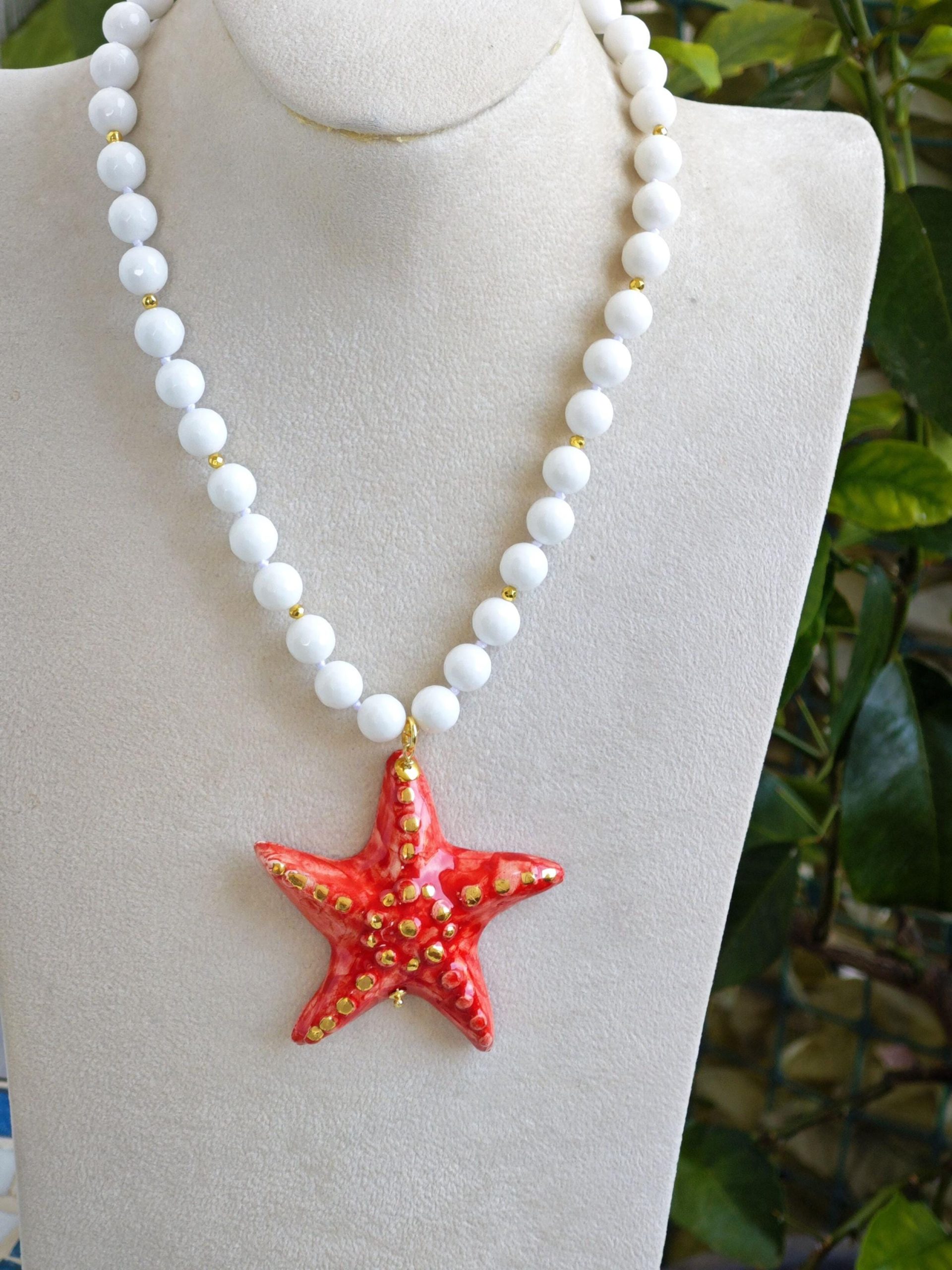 Collana girocollo annodata a mano con pietre dure sfaccettate onice bianco 10 mm con pendente stella marina in ceramica di Caltagirone realizzata e dipinta a mano, 6,5×6,5 cm dimensioni.