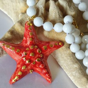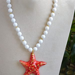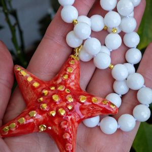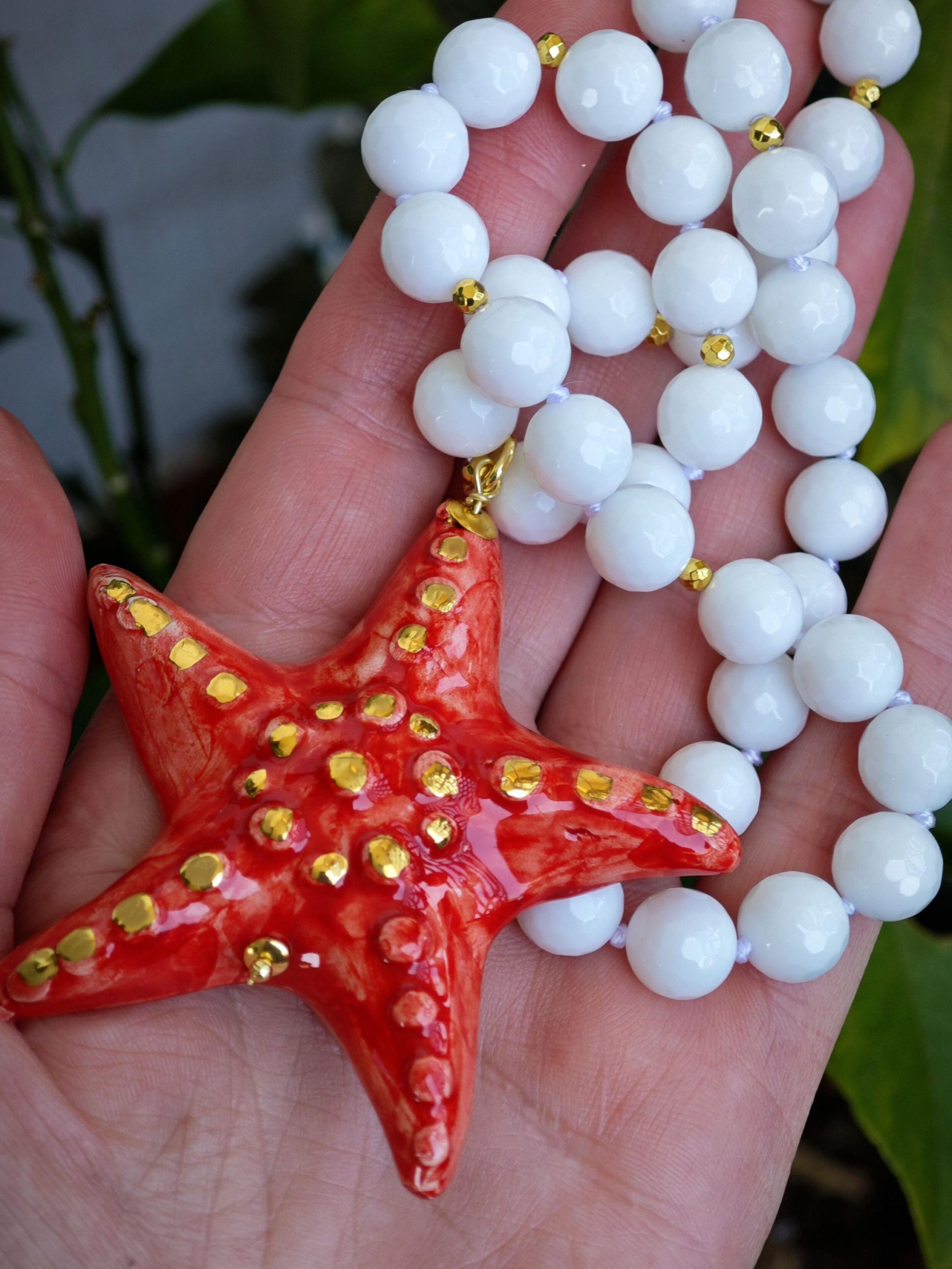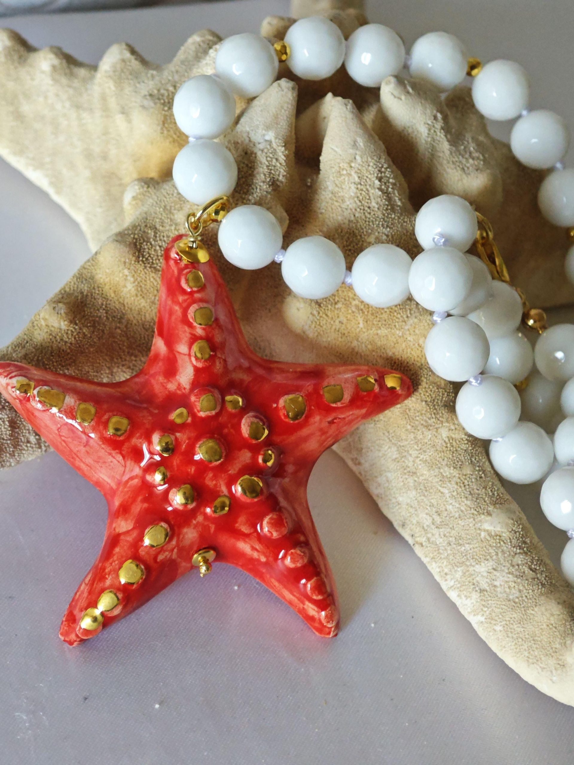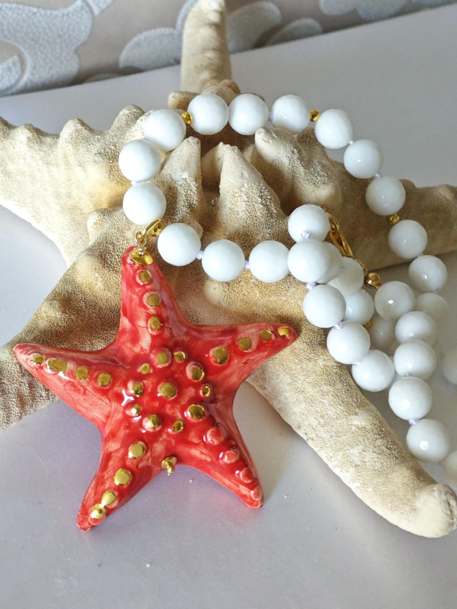 Collana girocollo annodata a mano con pietre dure sfaccettate onice bianco 10 mm con pendente stella marina in ceramica di Caltagirone realizzata e dipinta a mano, 6,5×6,5 cm dimensioni.