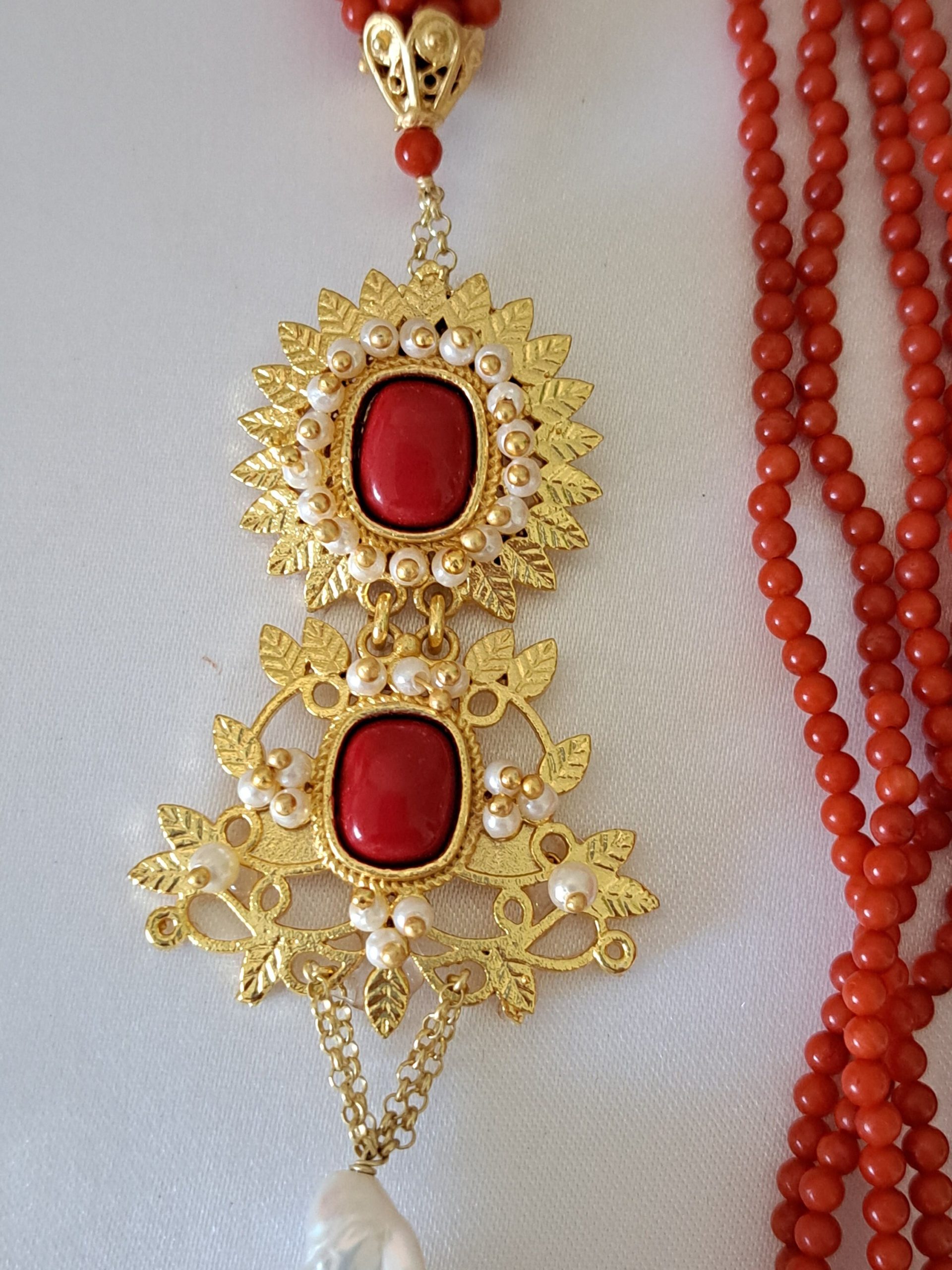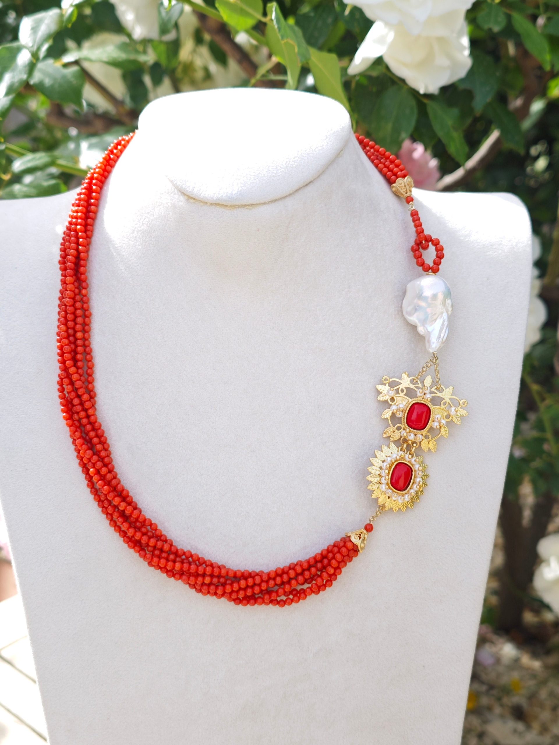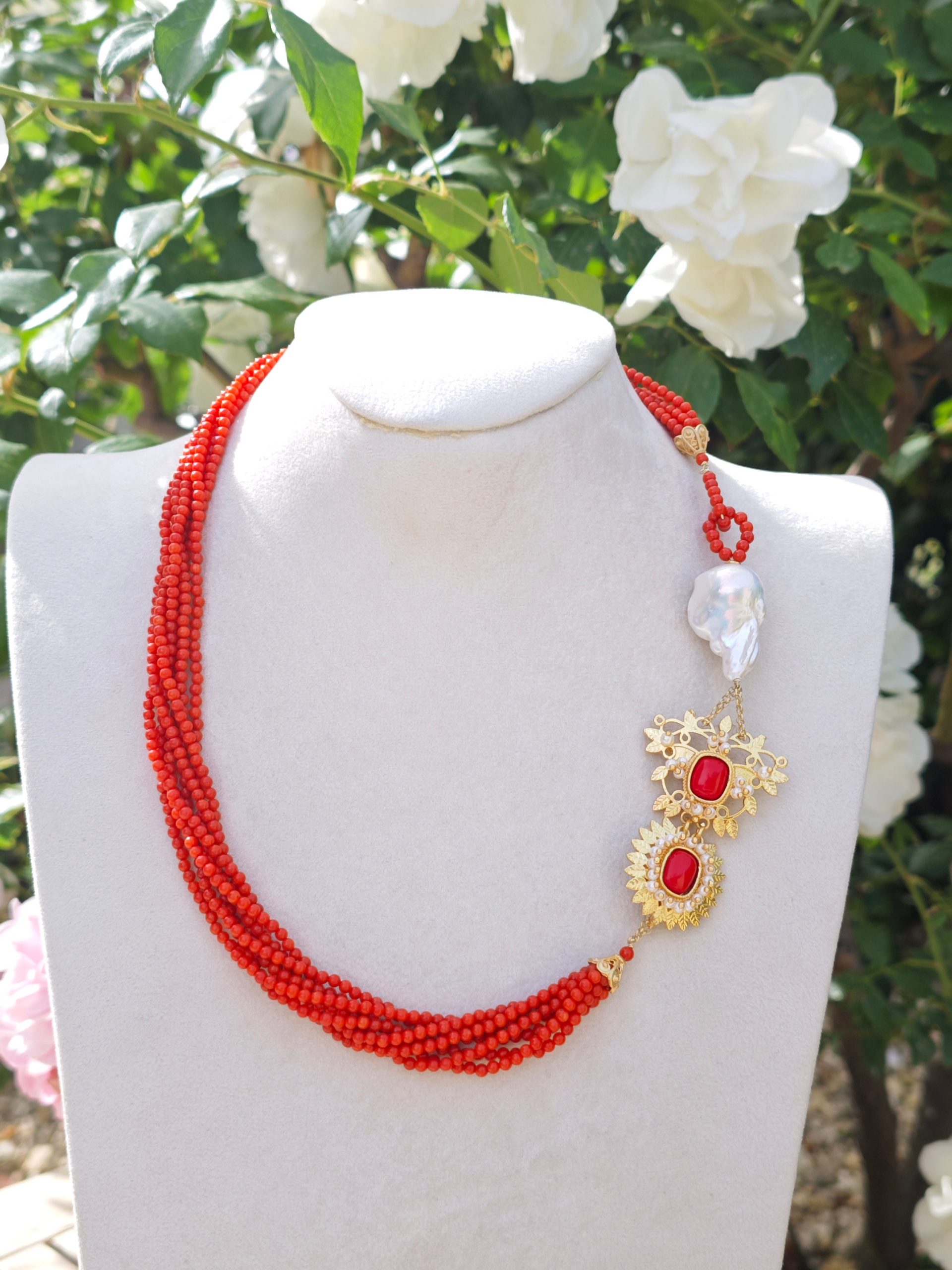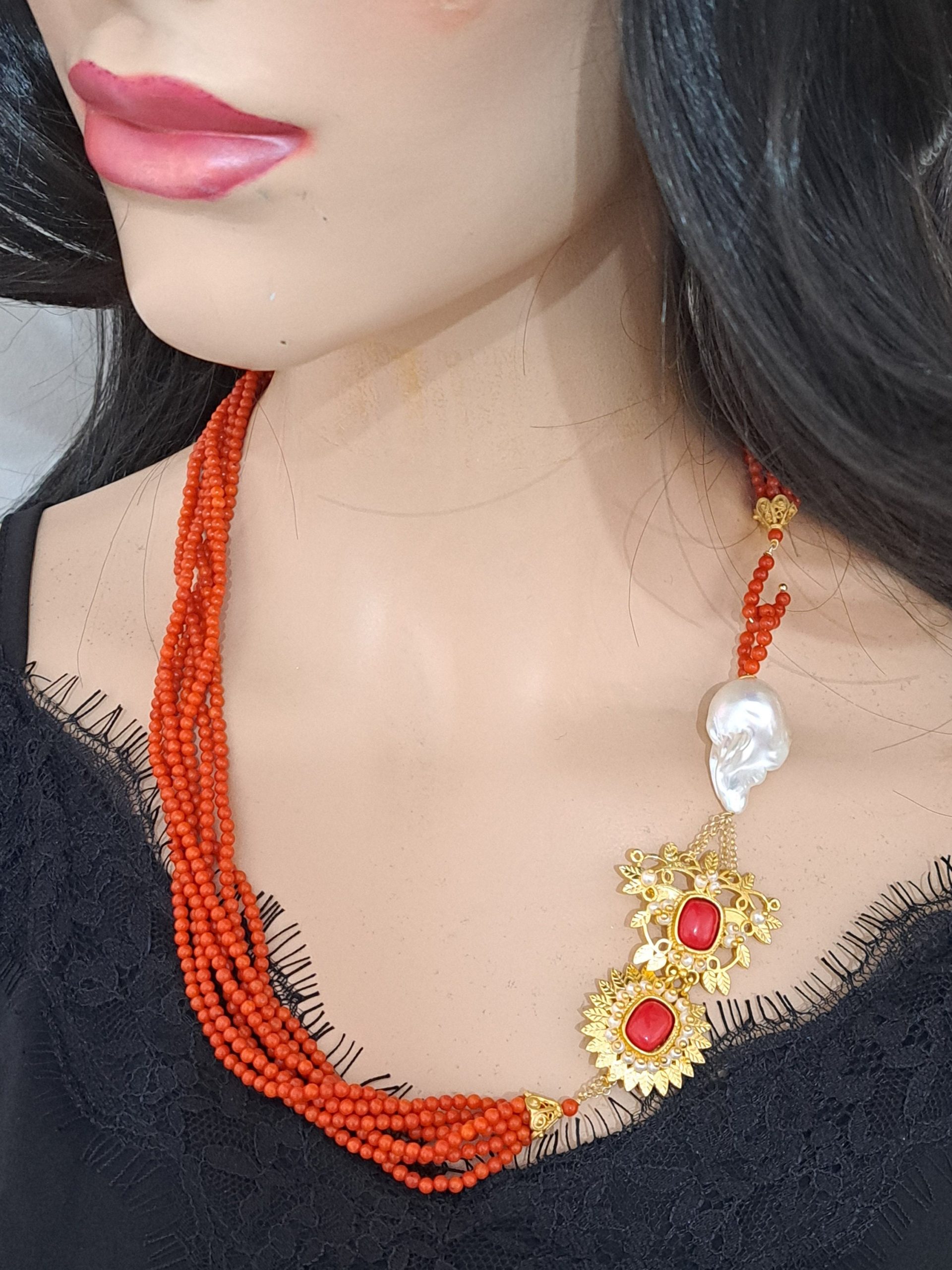 Collana maxi realizzata a mano con 7 fili perline corallo rosso bambù e grappolo laterale realizzato con elemento laterale in ottone dorato decorato con perline bianche e corallo e perla barocca bianca.