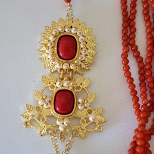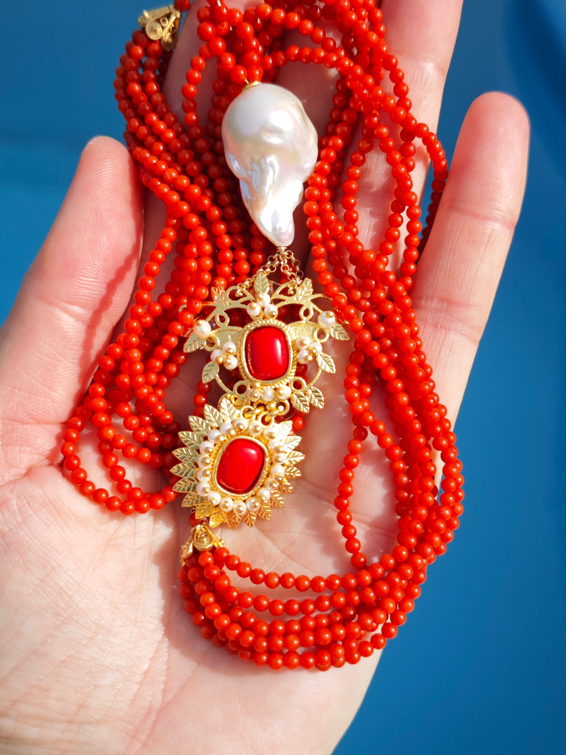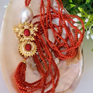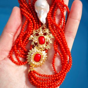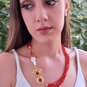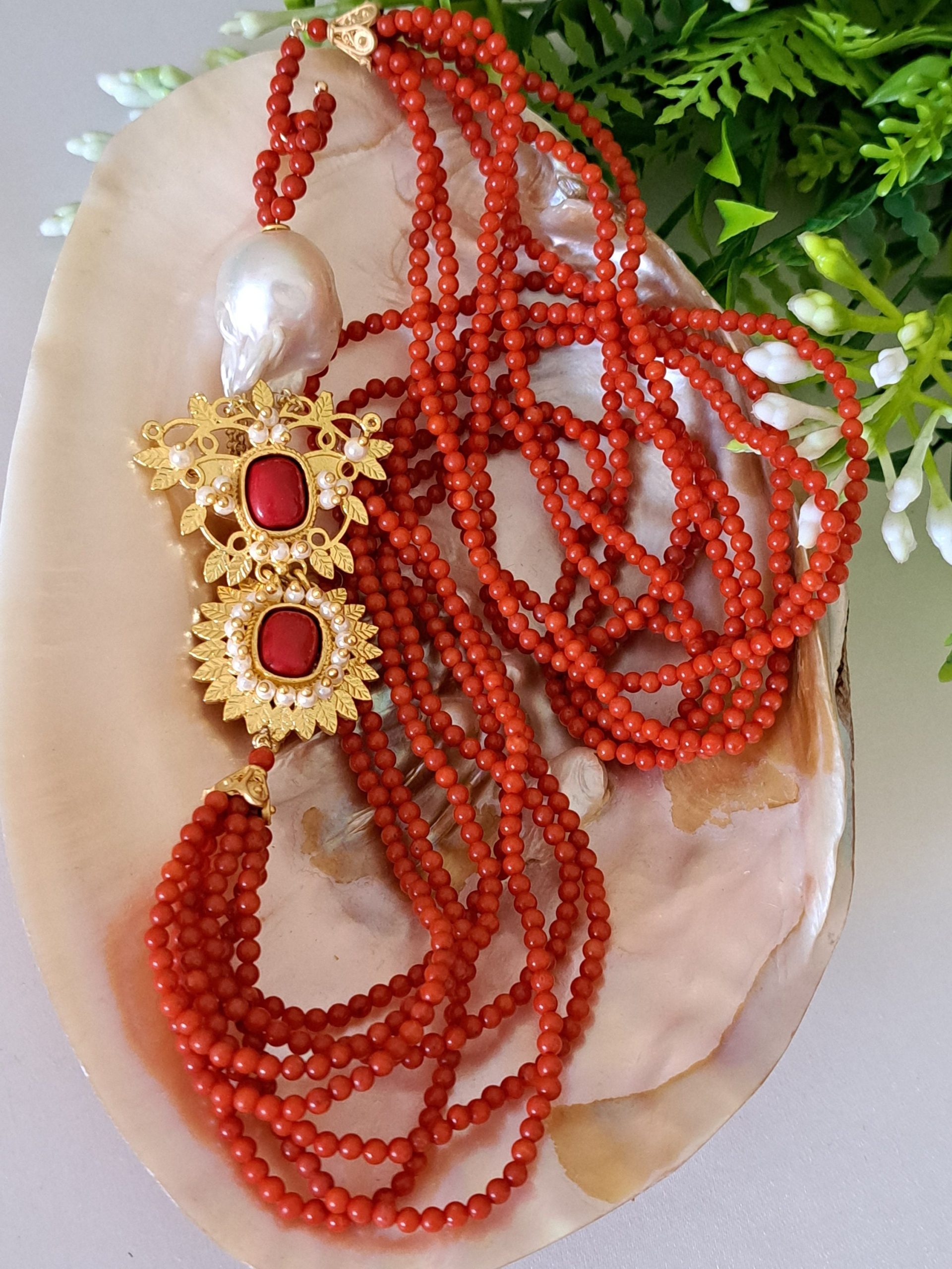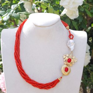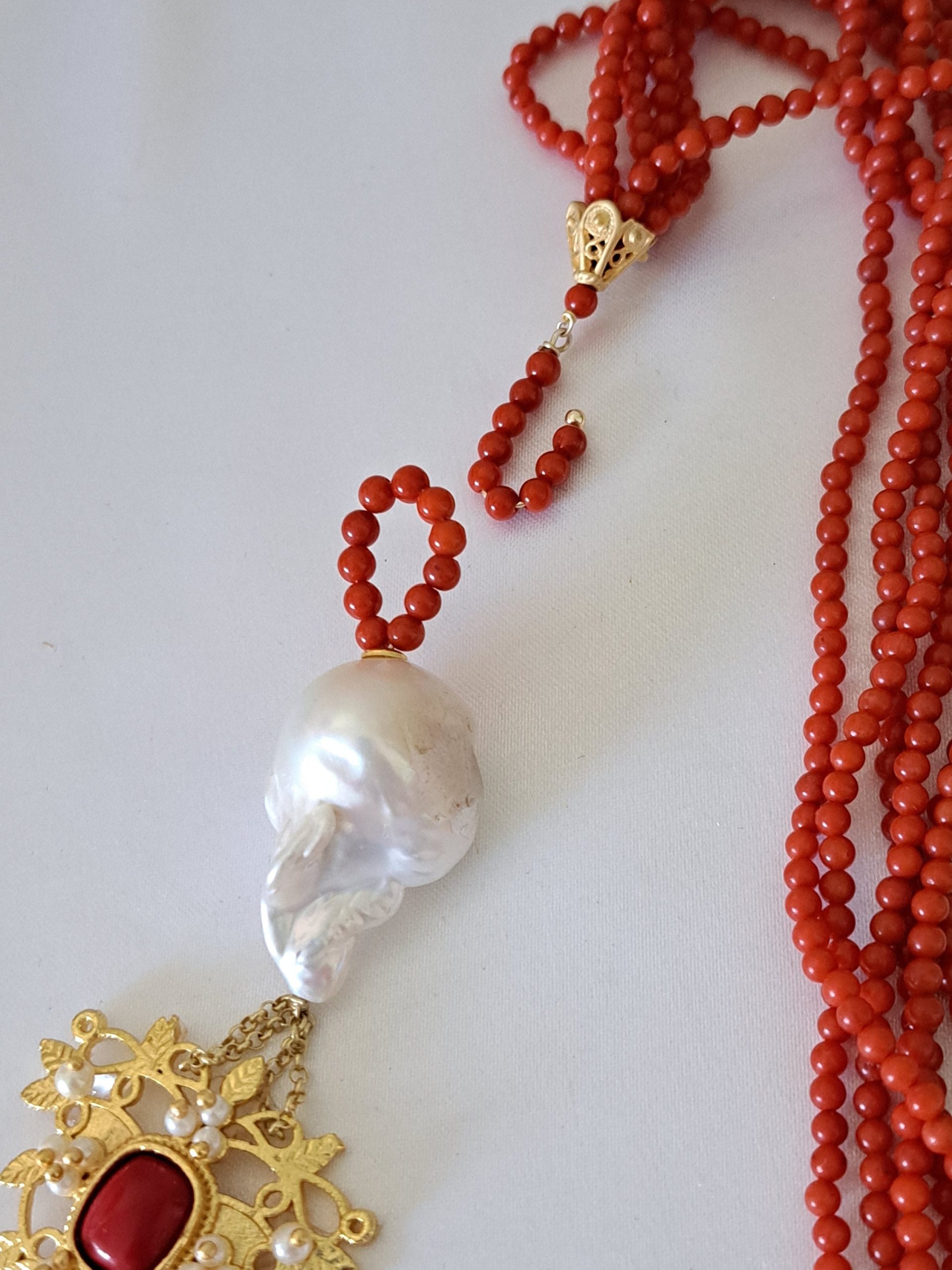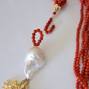 Collana maxi realizzata a mano con 7 fili perline corallo rosso bambù e grappolo laterale realizzato con elemento laterale in ottone dorato decorato con perline bianche e corallo e perla barocca bianca.