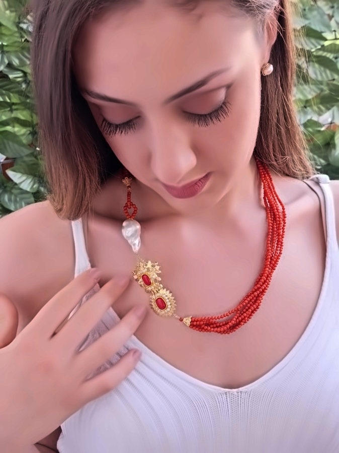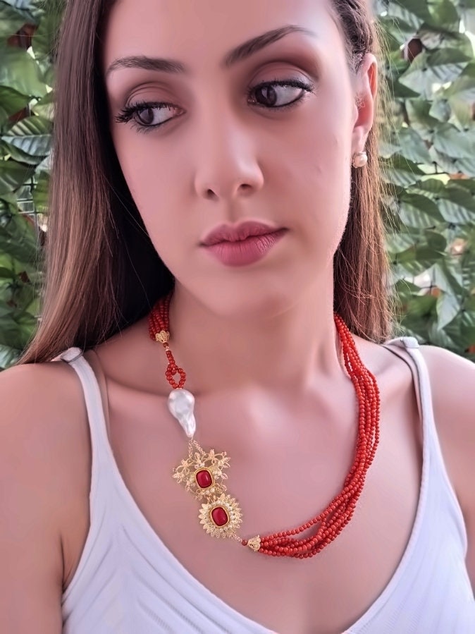 Collana girocollo corallo rosso con perle barocche bianche, collana multifilo, gioielli italiani