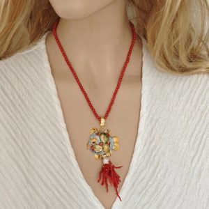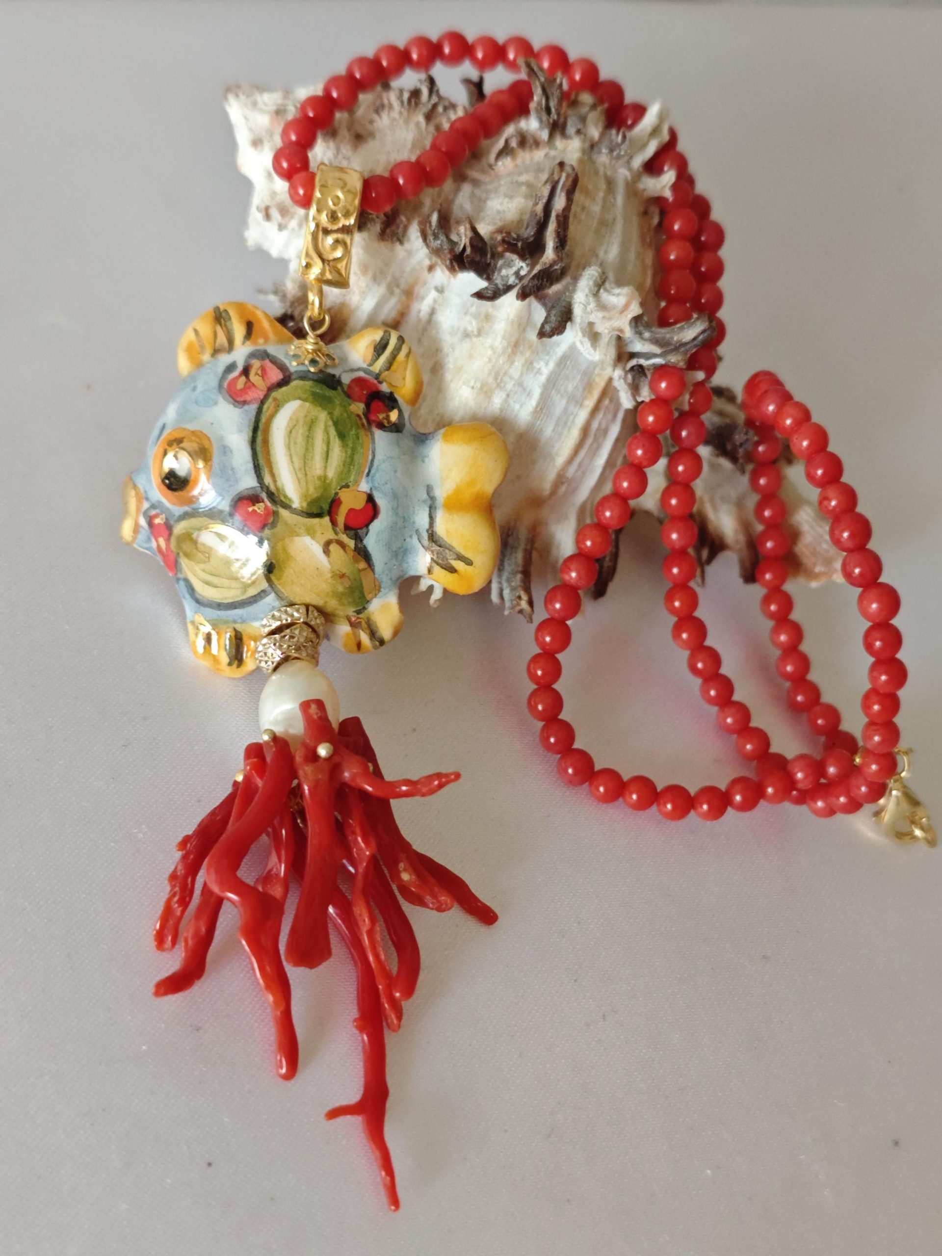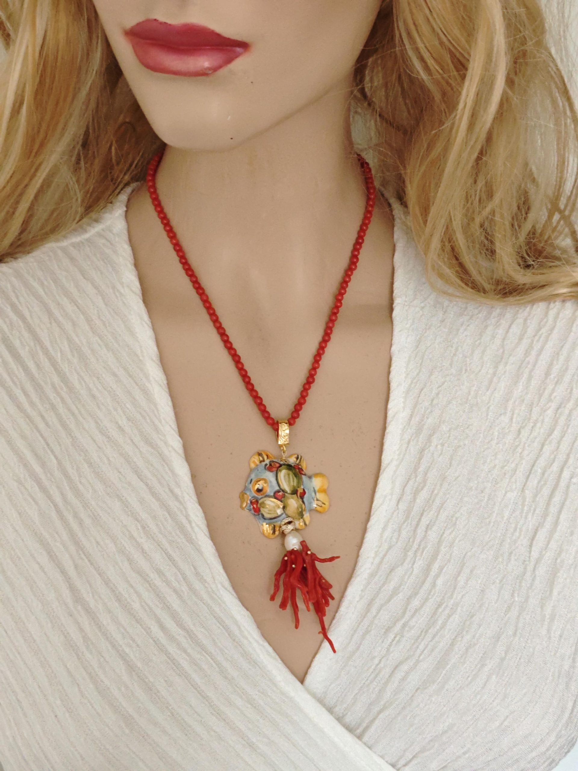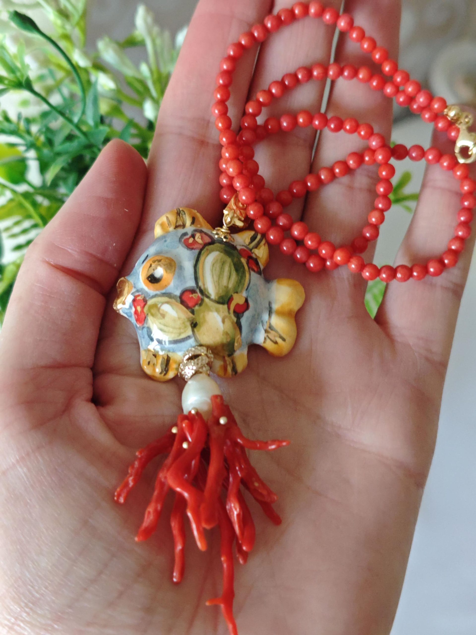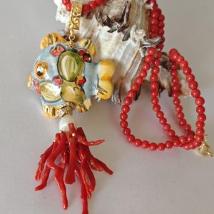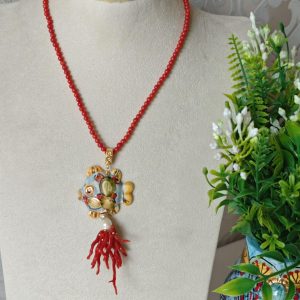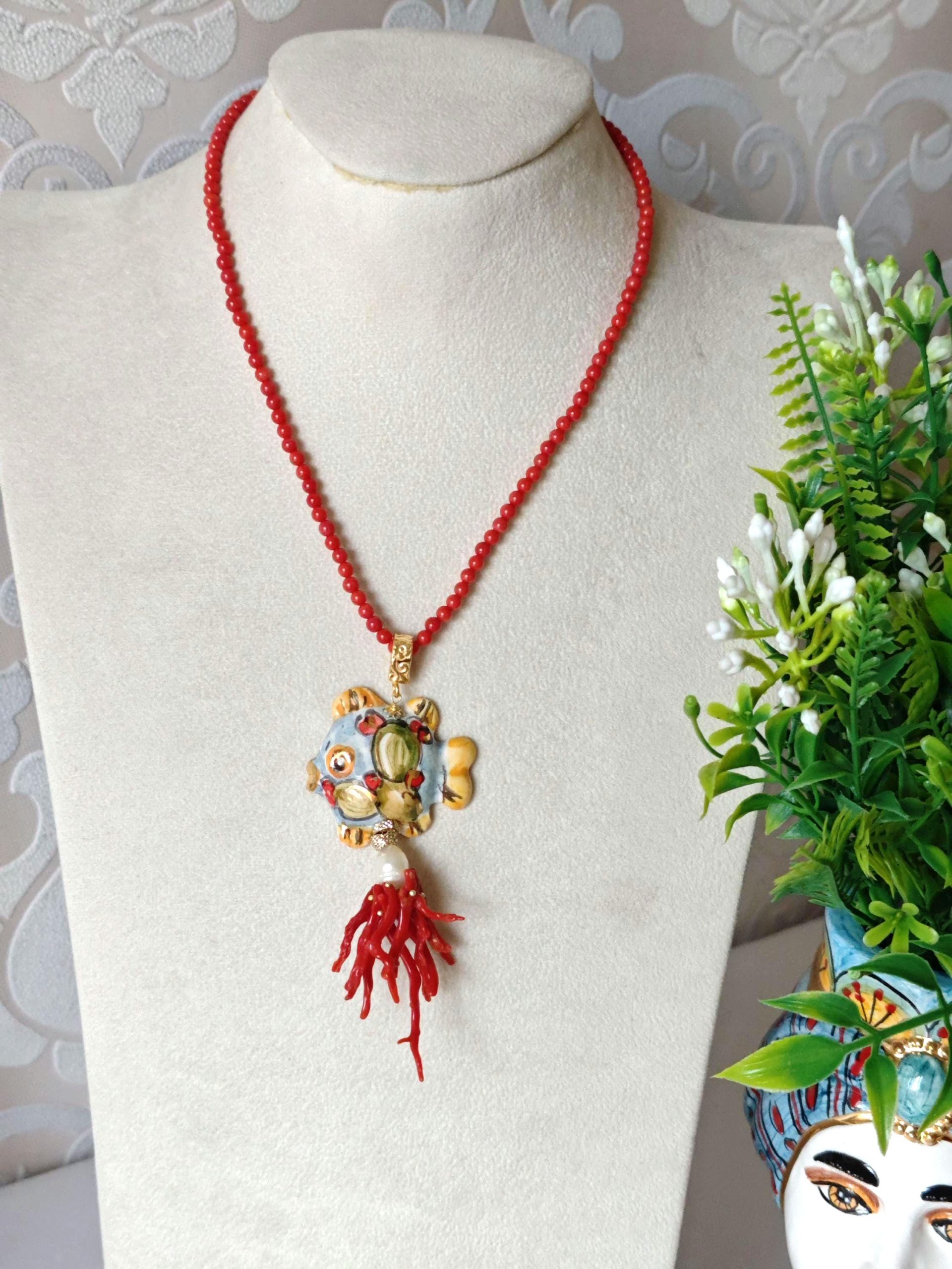 Collana girocollo corallo rosso con pesce in ceramica Caltagirone, collana siciliana