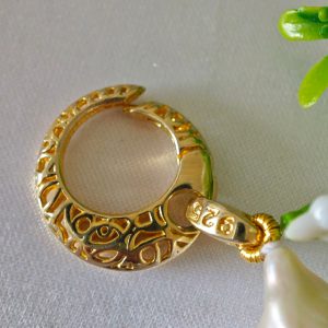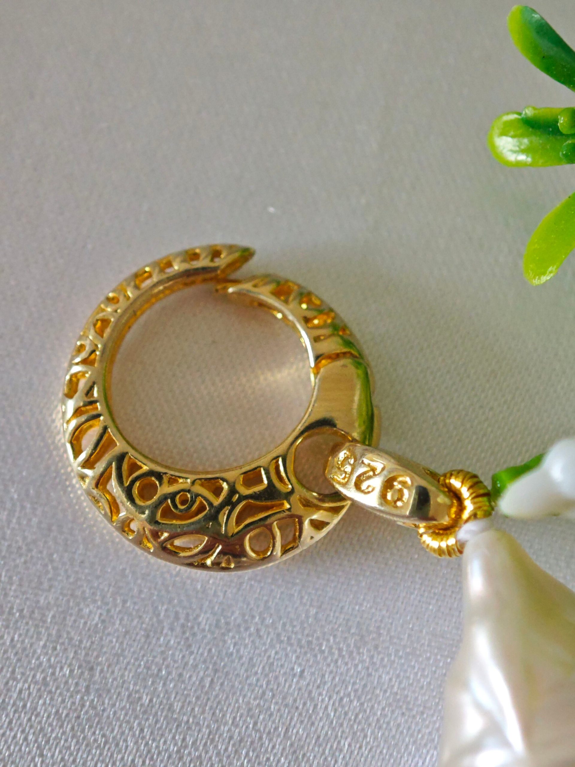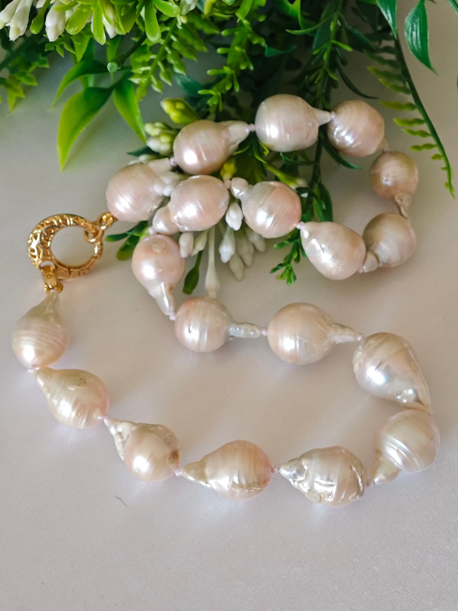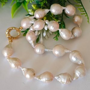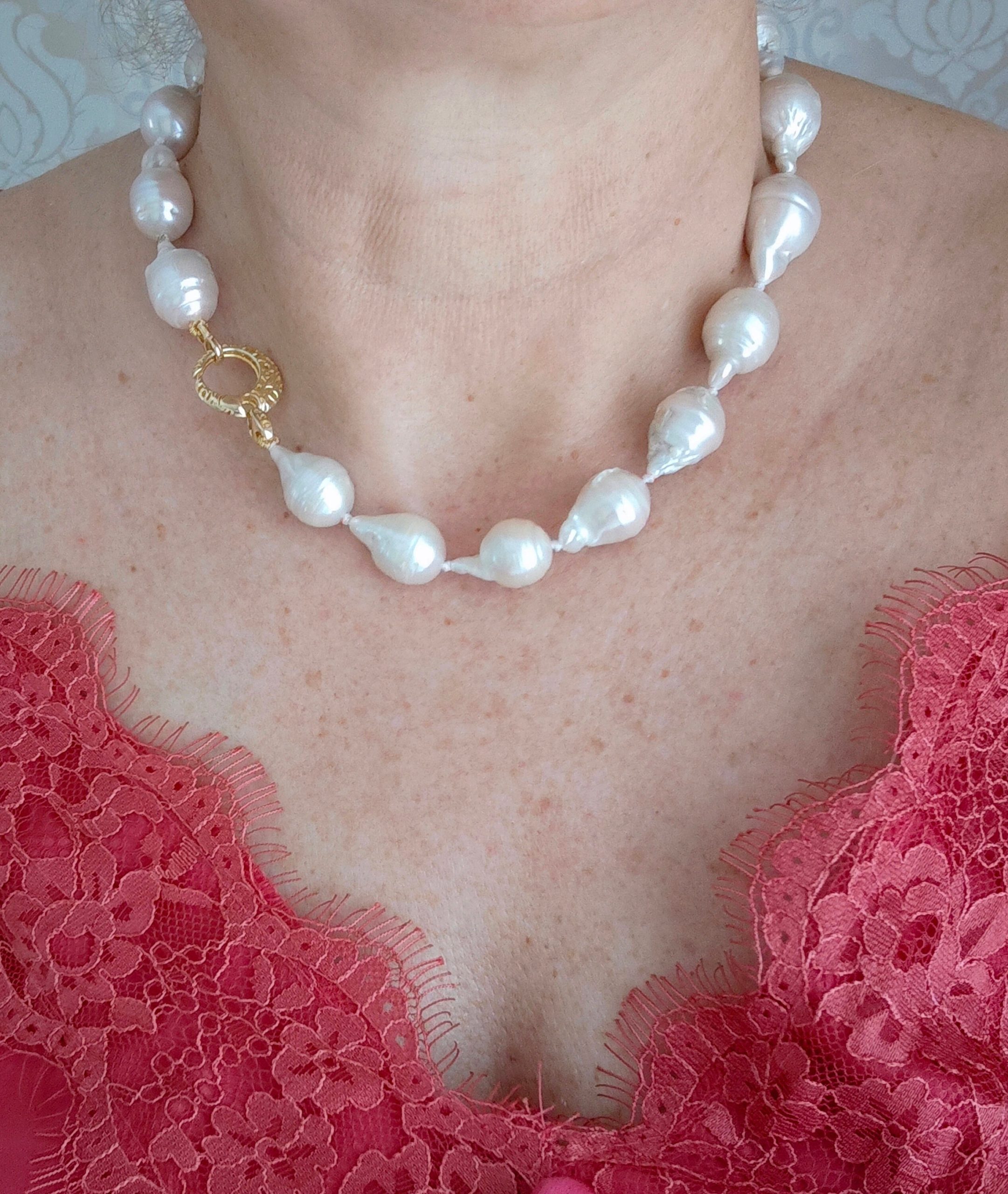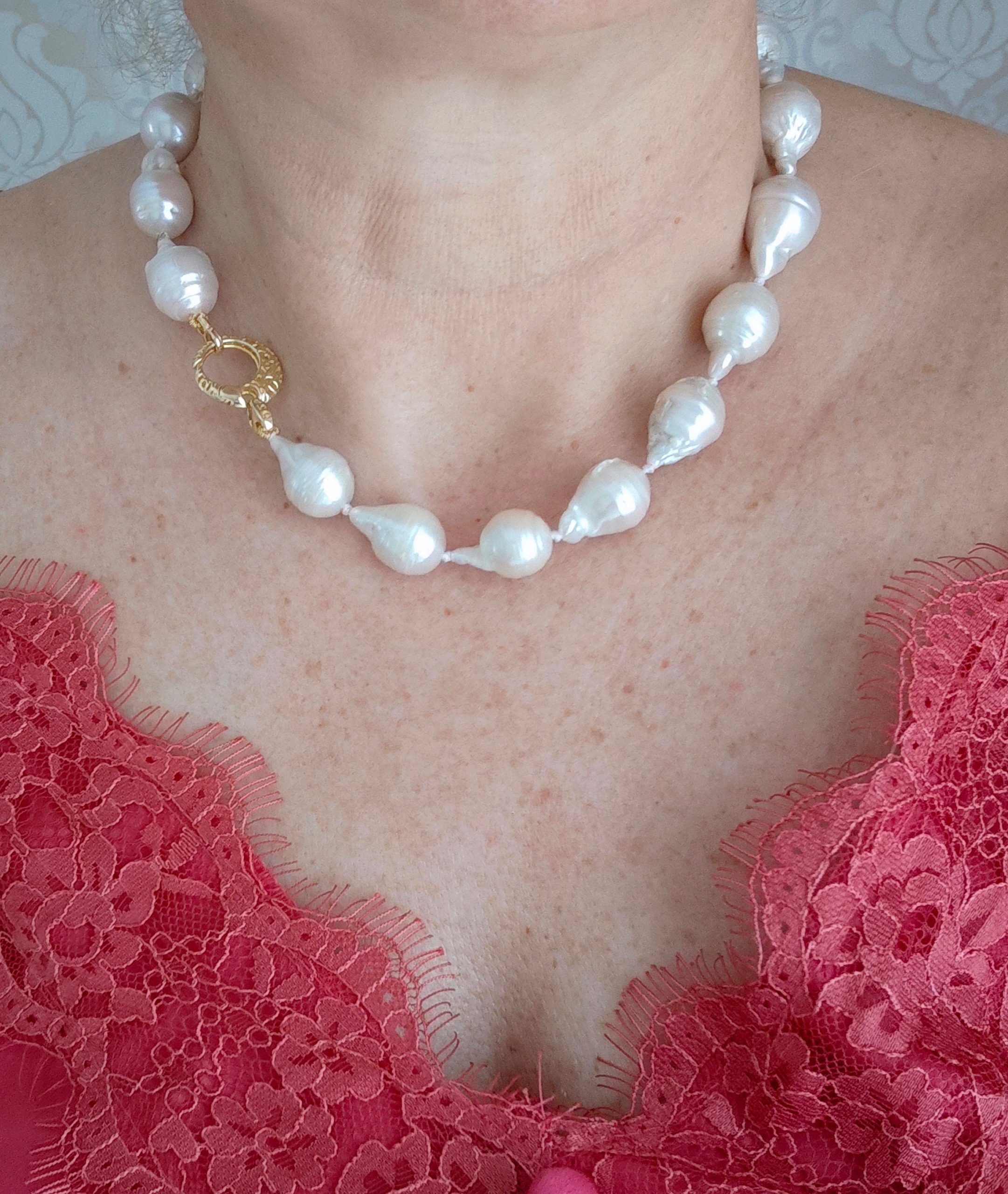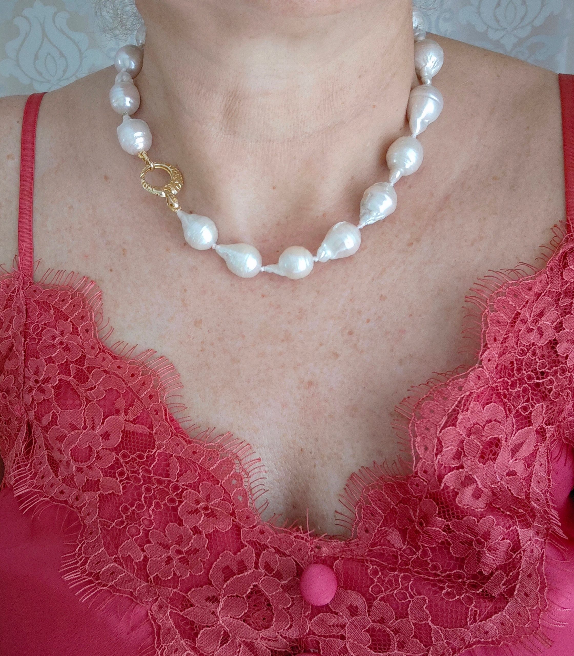 Collana girocollo perle barocche bianche con chiusura in argento 925 placcato oro, gioielli italiani