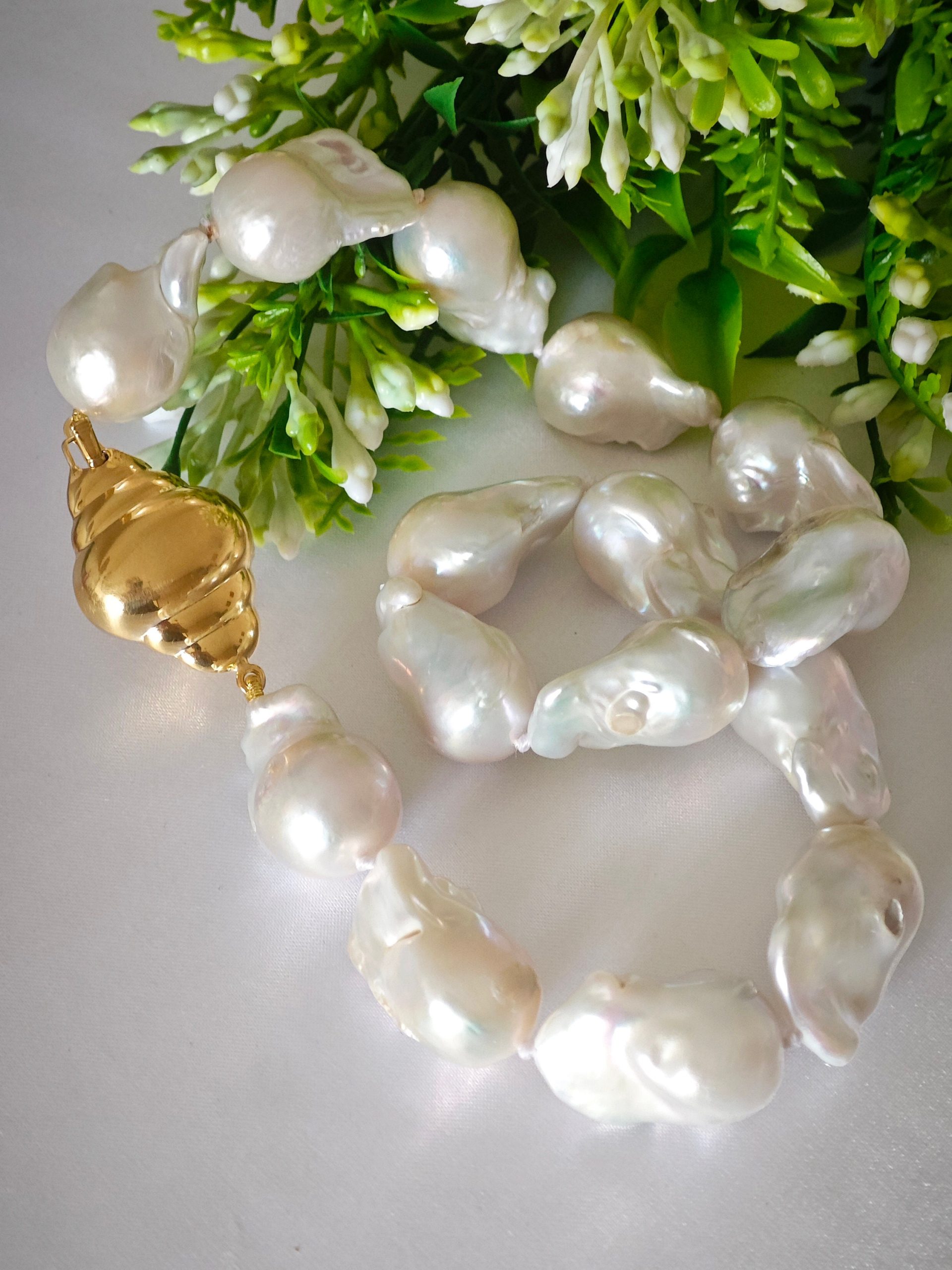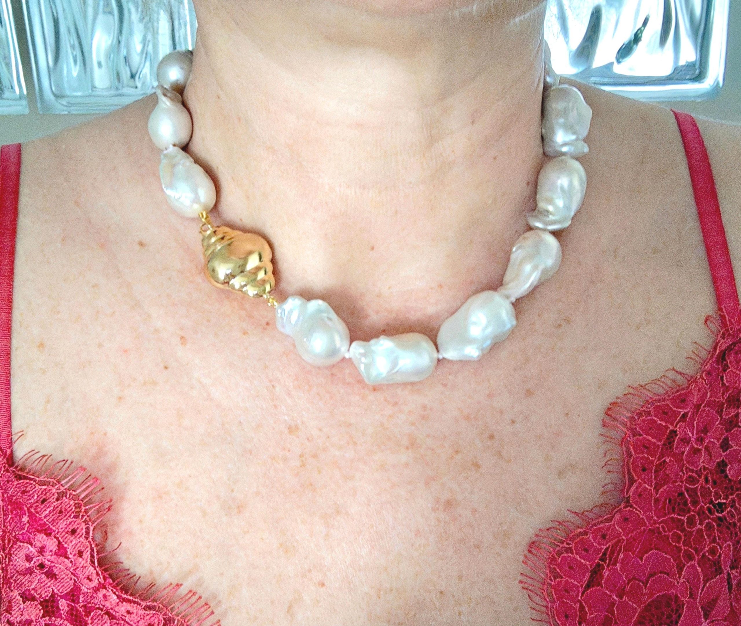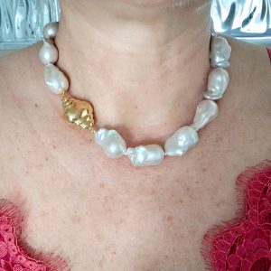 Collana girocollo perle barocche bianche con chiusura in argento 925 placcato oro,  gioielli italiani