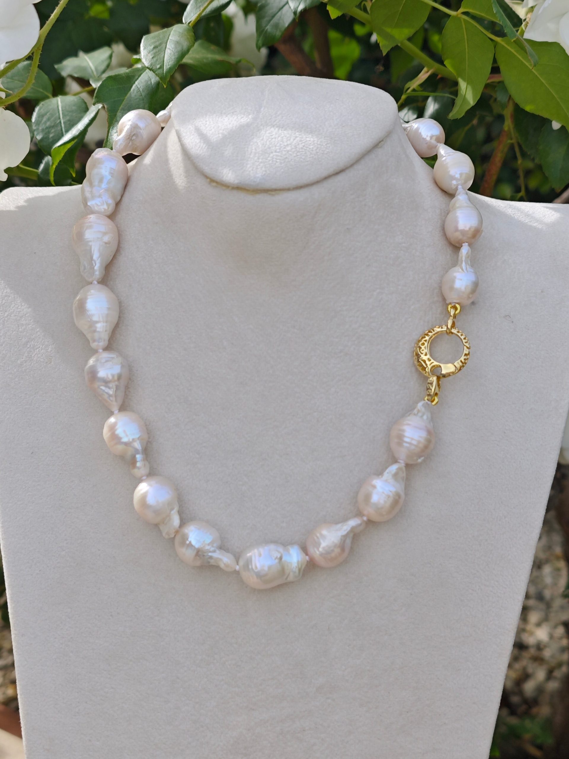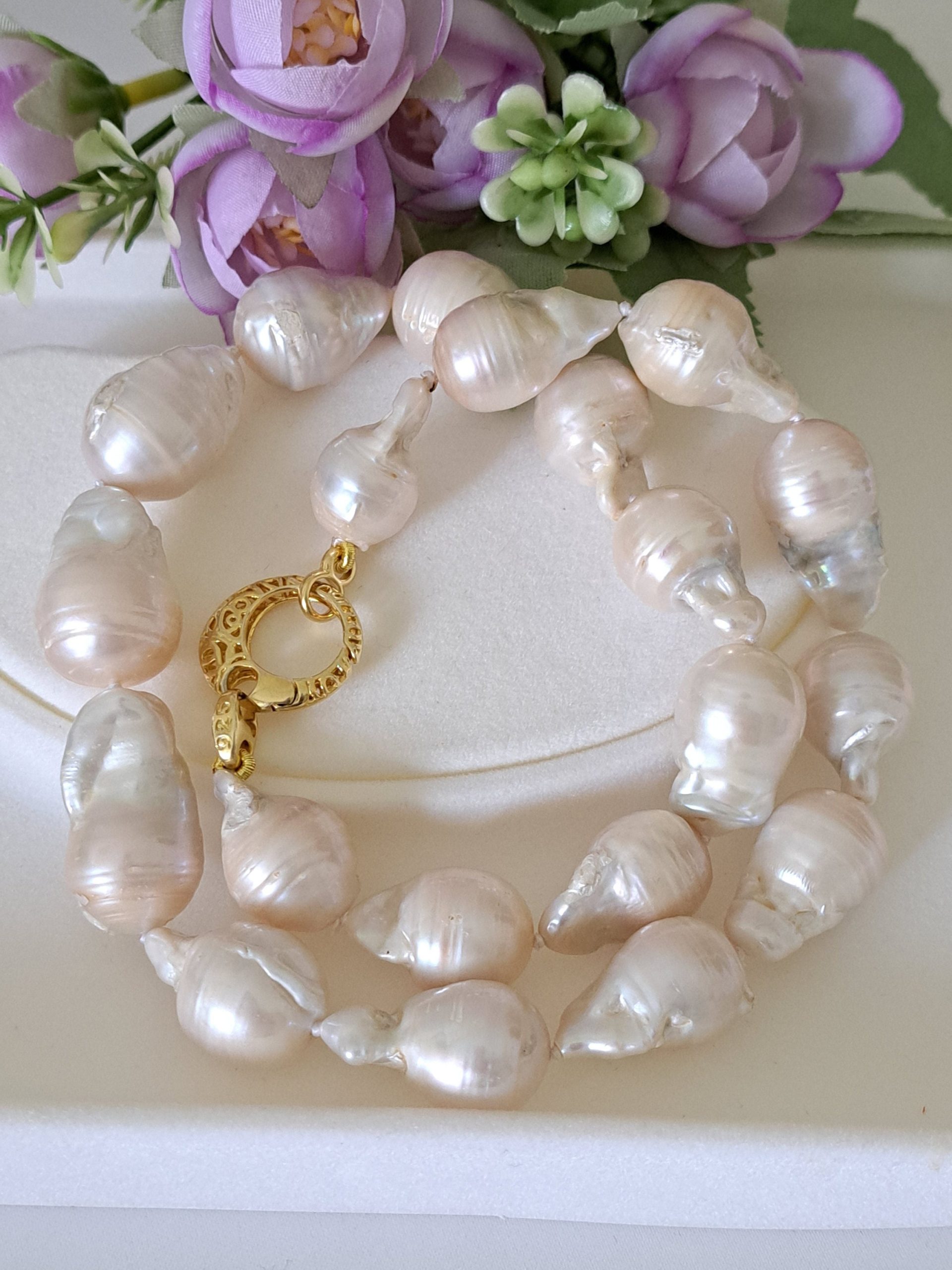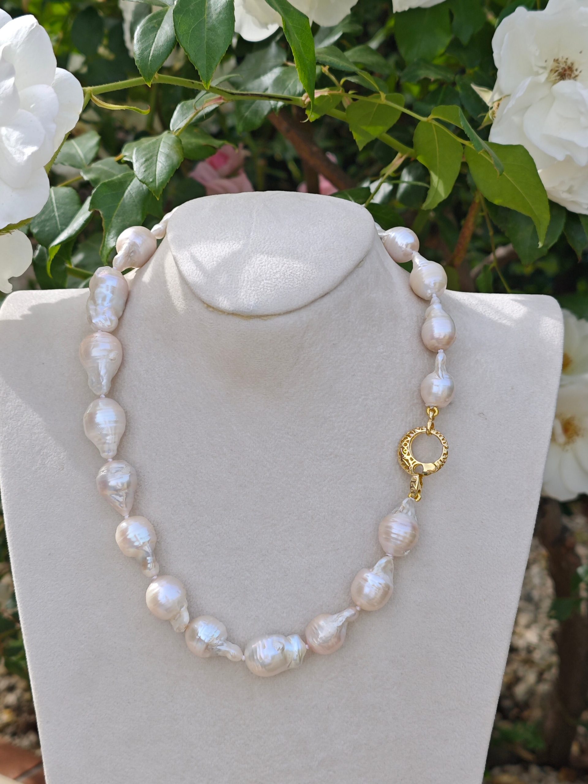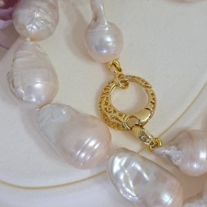 Collana girocollo perle barocche bianche con chiusura in argento 925 placcato oro, gioielli italiani