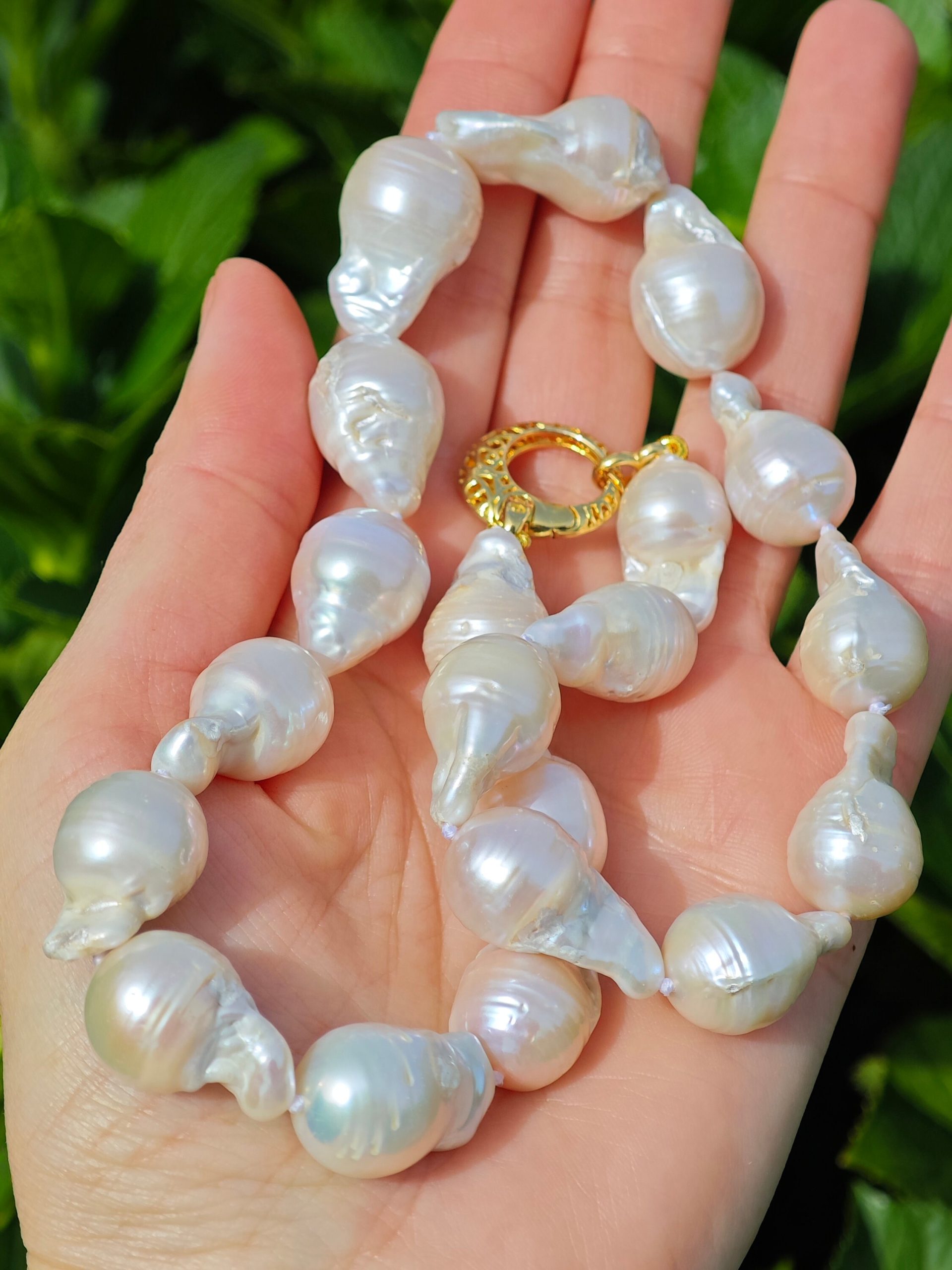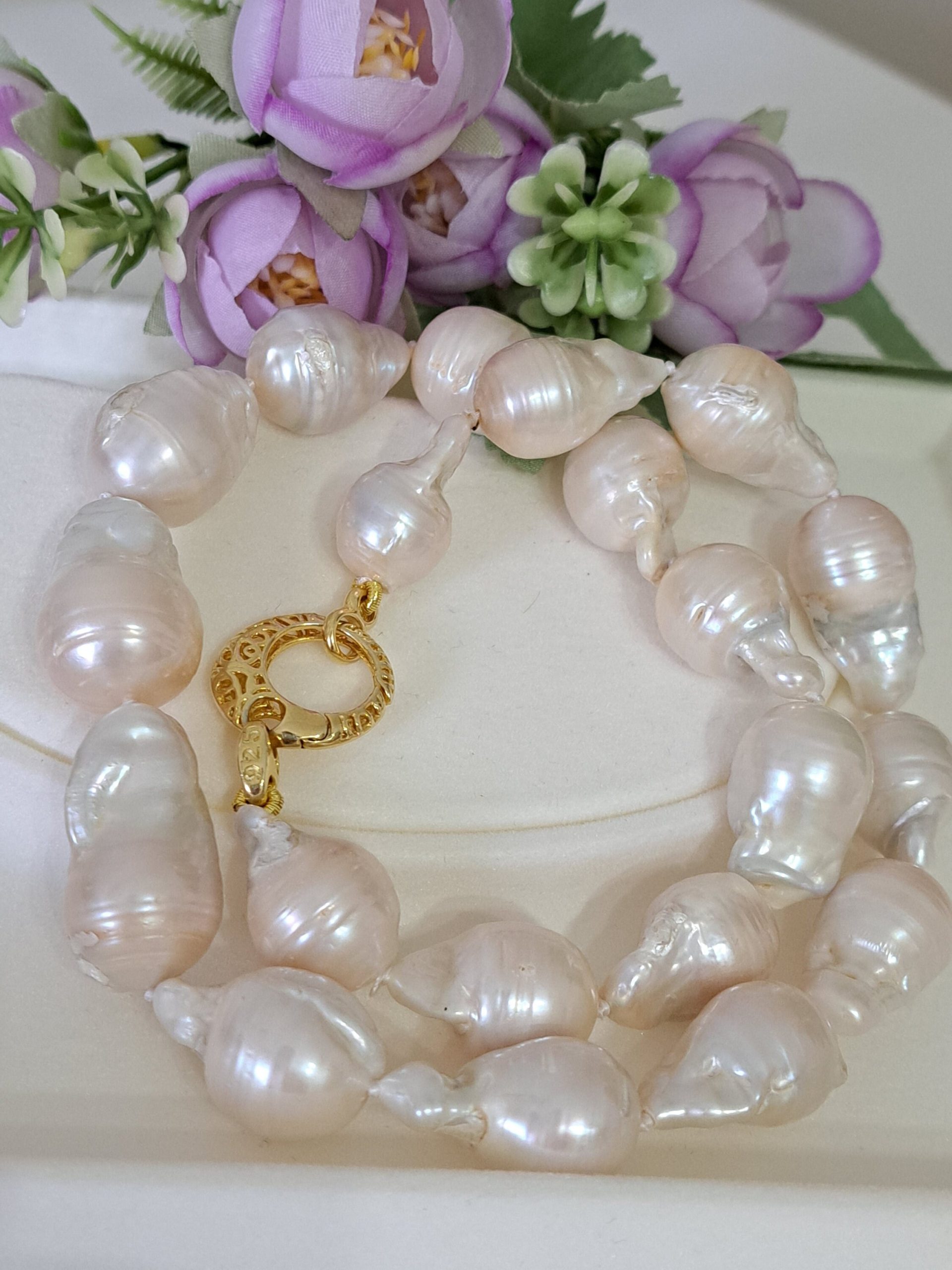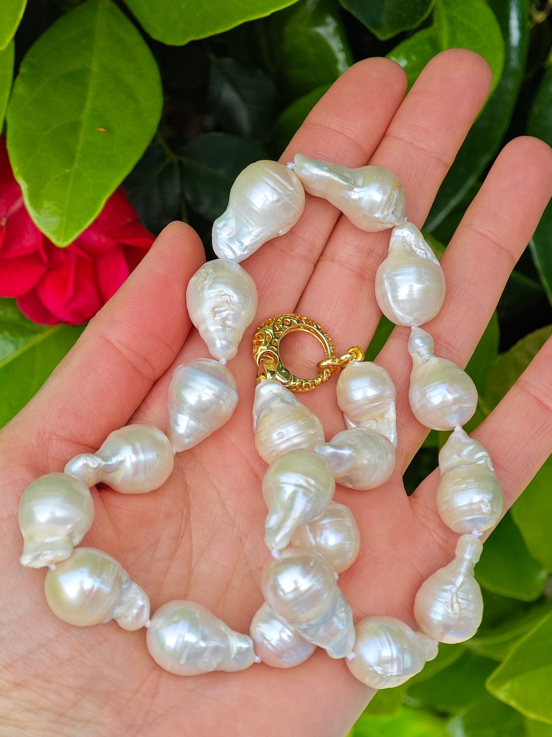 Collana girocollo perle barocche bianche con chiusura in argento 925 placcato oro, gioielli italiani