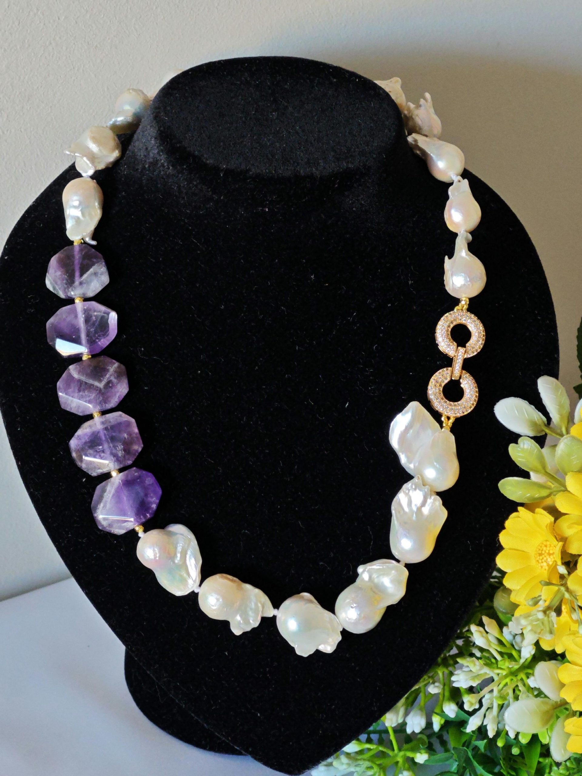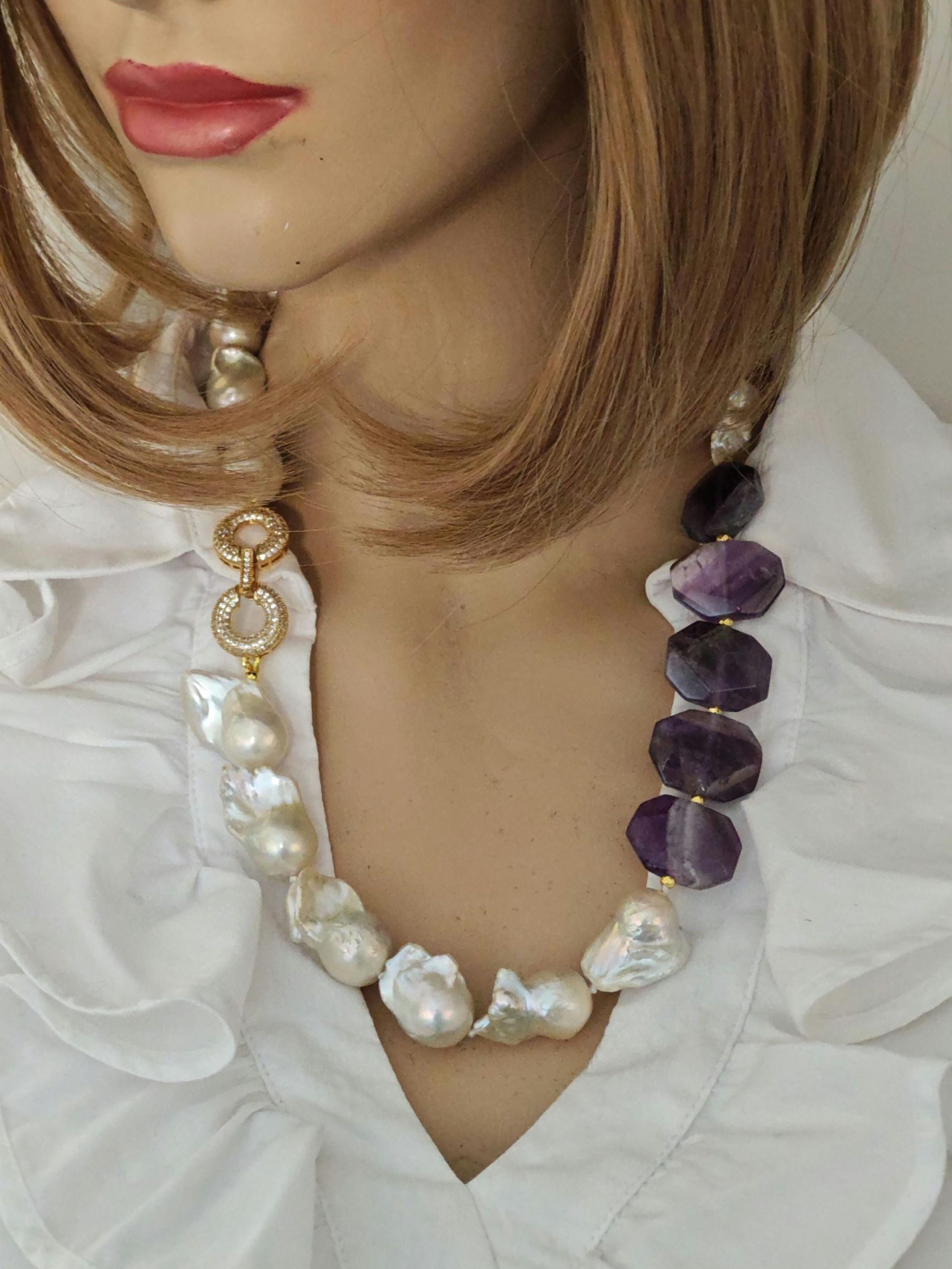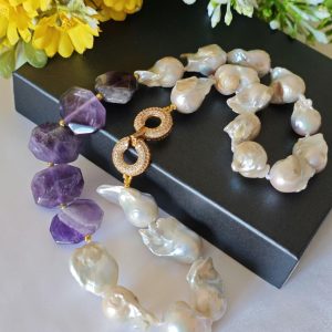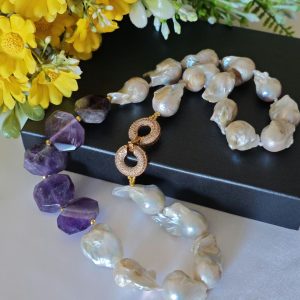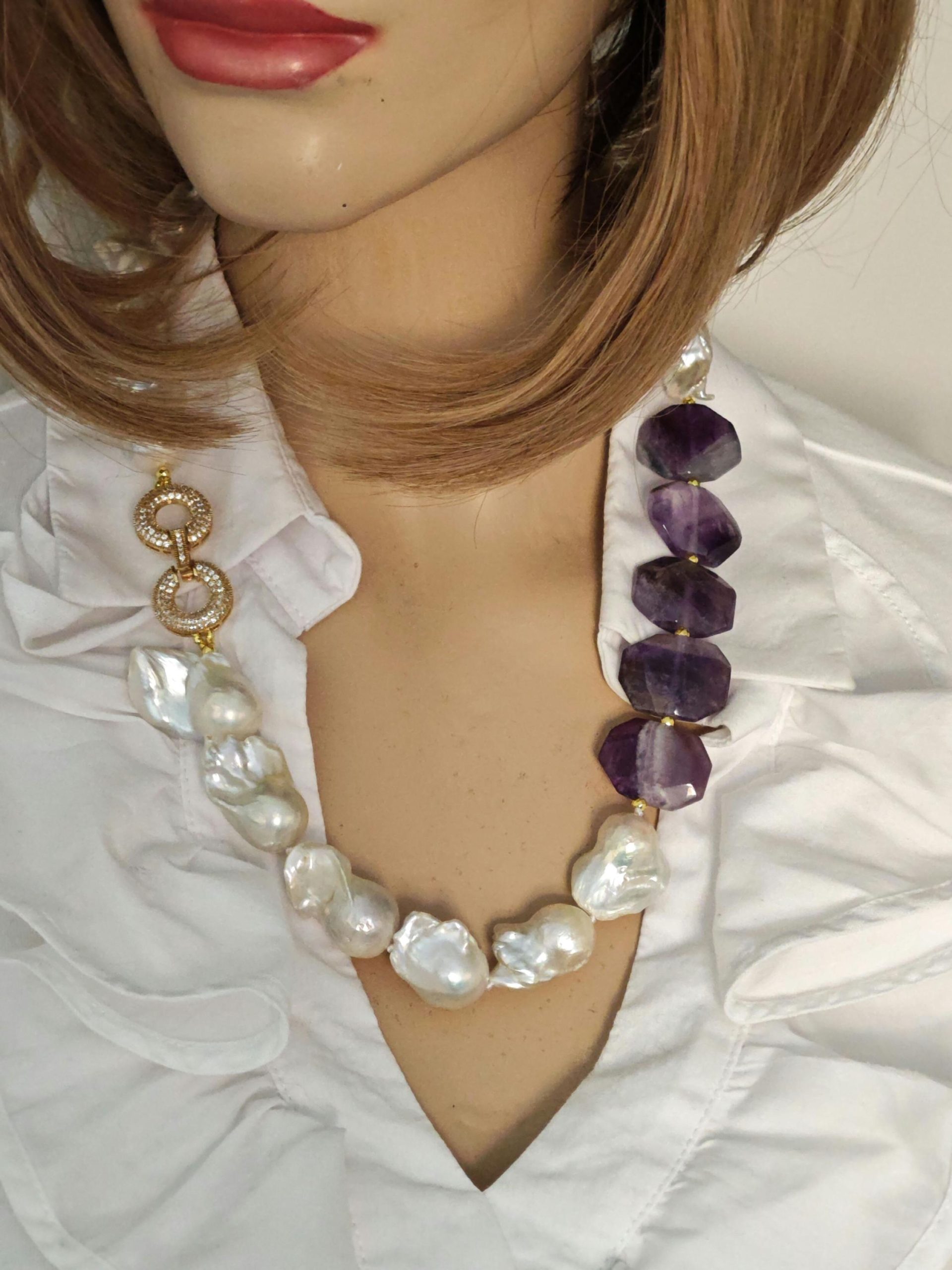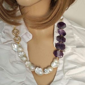 Collana girocollo perle barocche bianche con pietre dure ametista e chiusura gioiello con cristalli, gioielli italiani