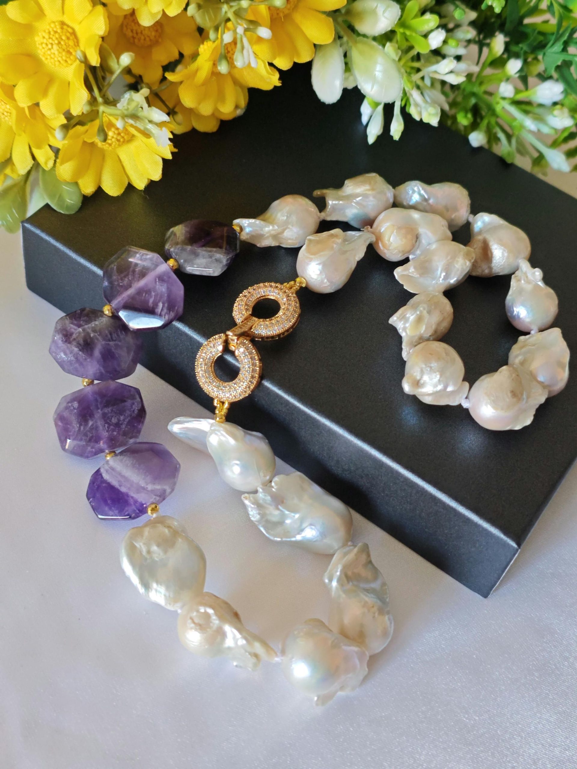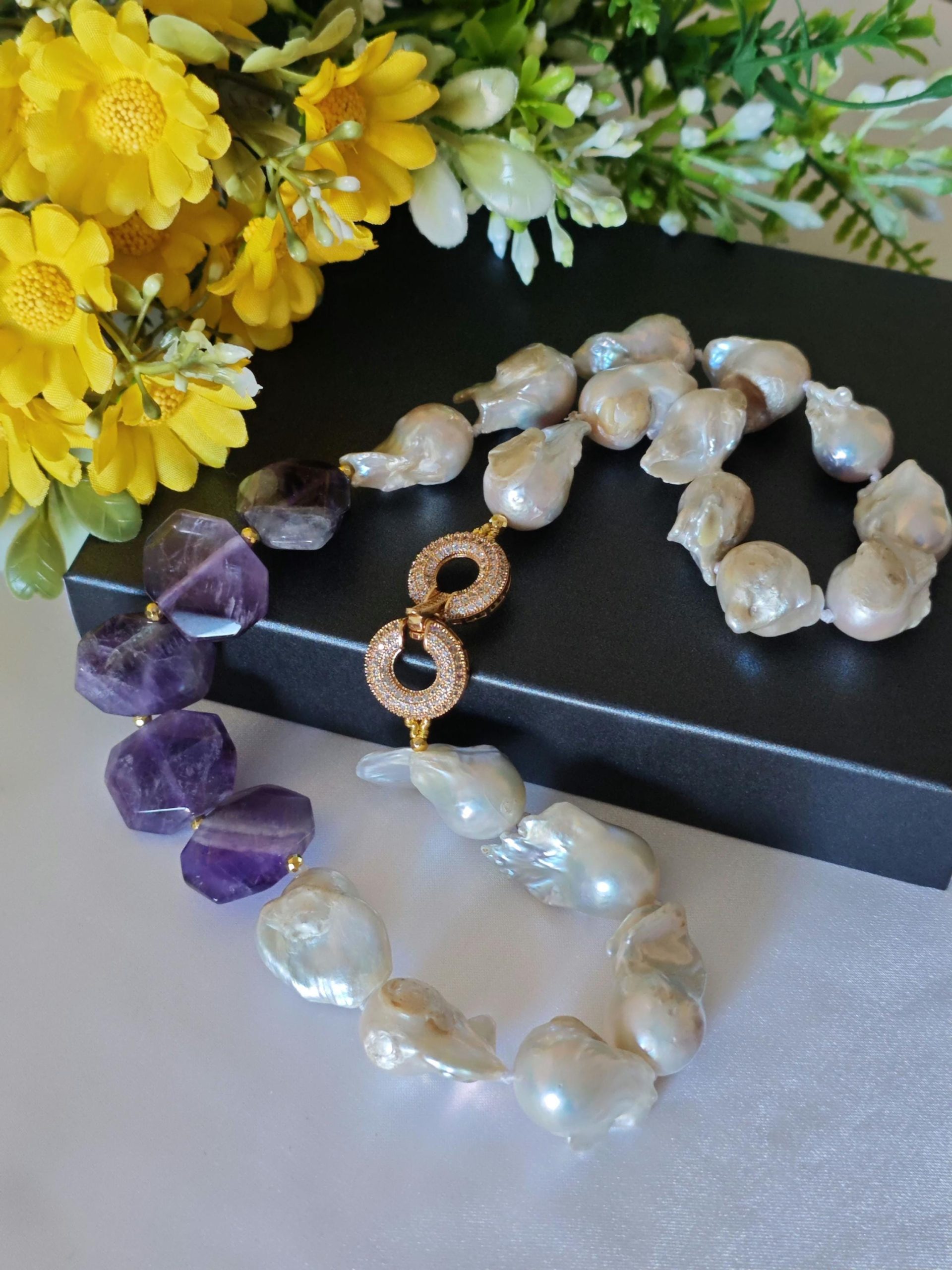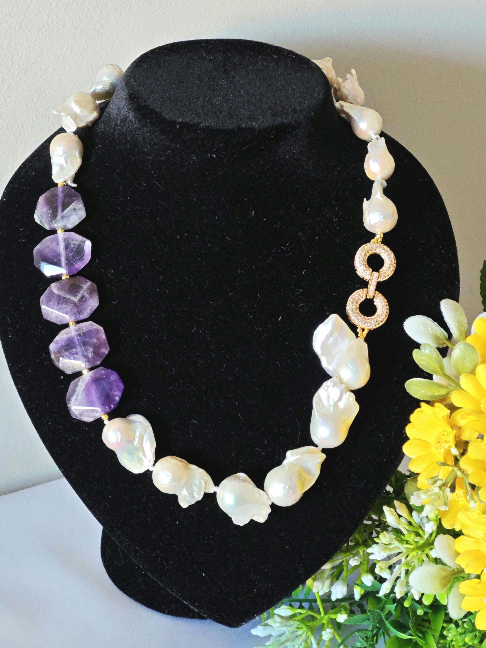 Collana girocollo perle barocche bianche con pietre dure ametista e chiusura gioiello con cristalli, gioielli italiani