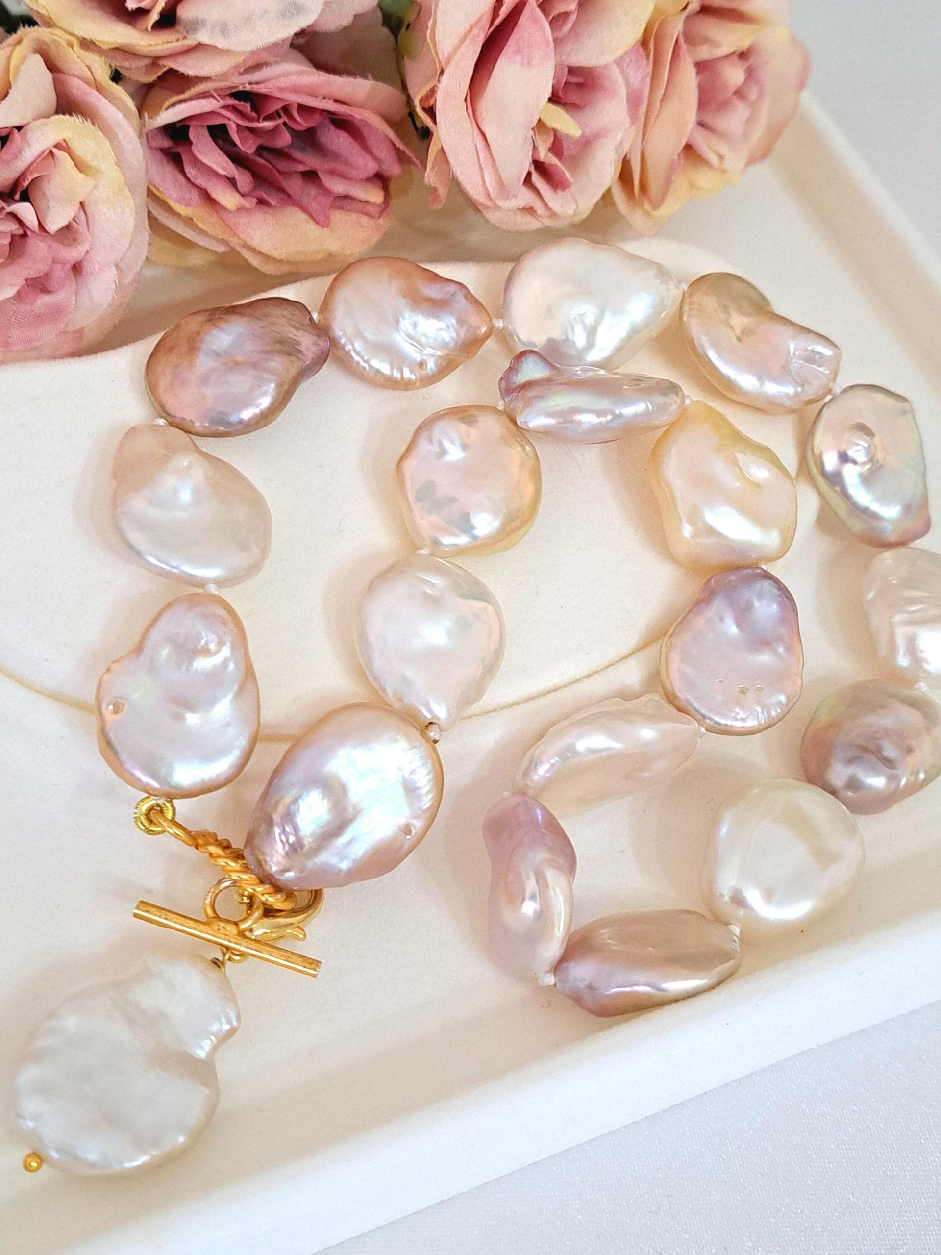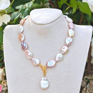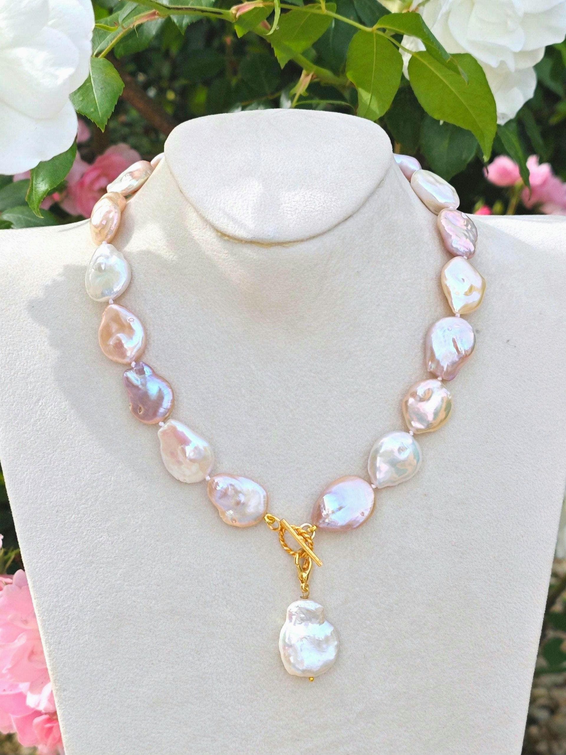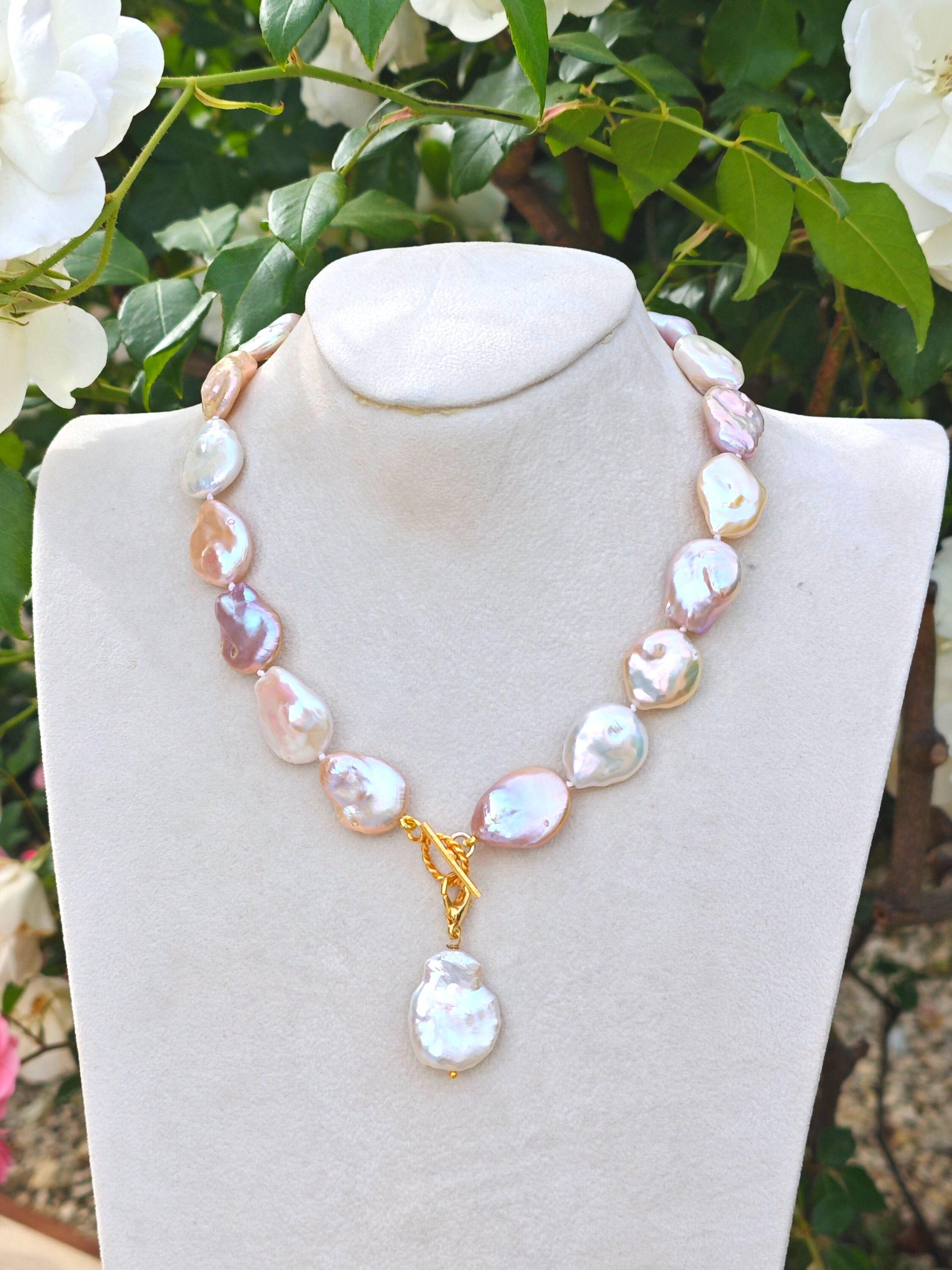 Collana girocollo annodata a mano con perle barocche bianche e rosa a goccia 2 cm dimensioni con pendente perla rimovibile.