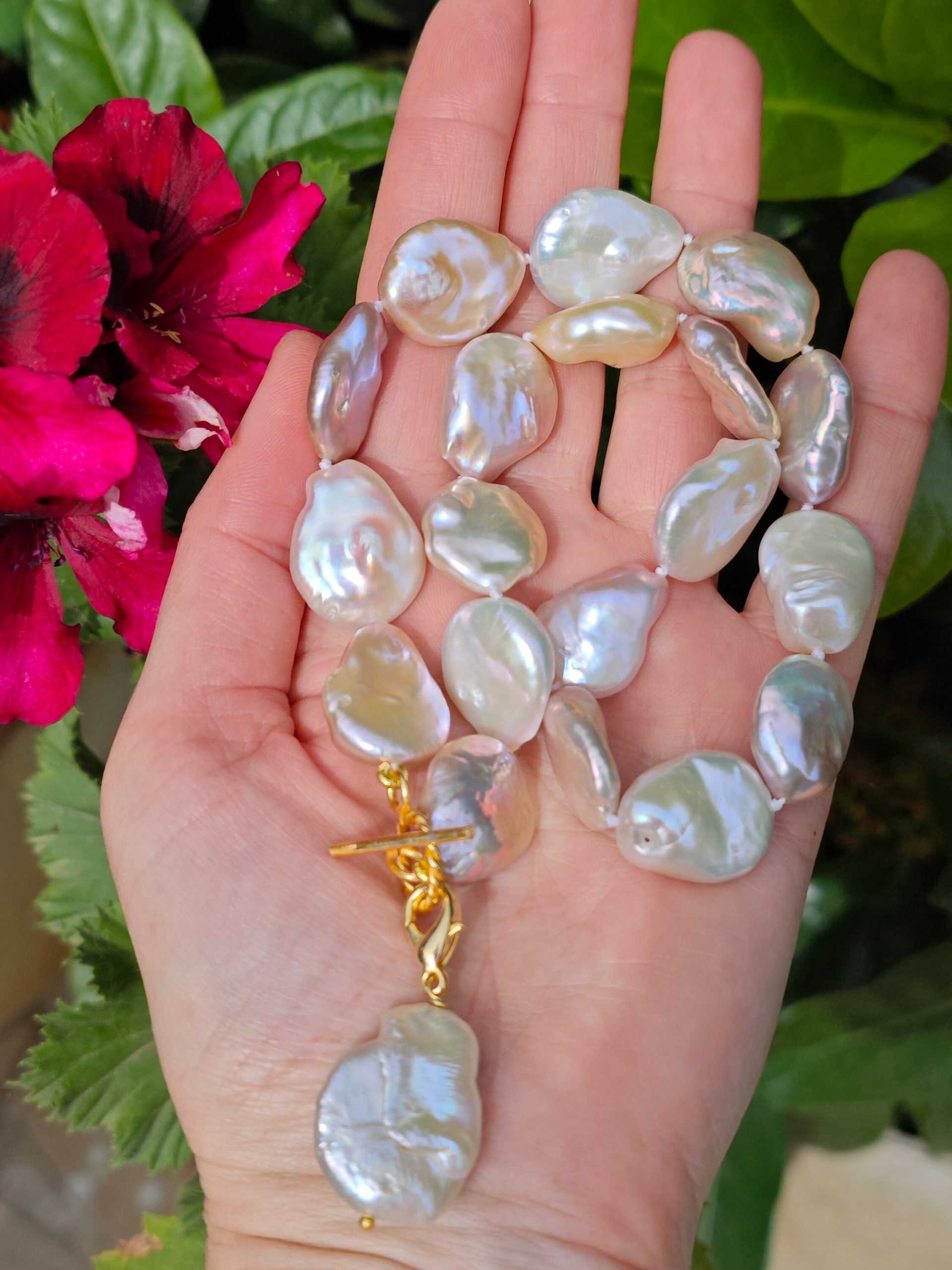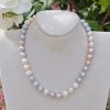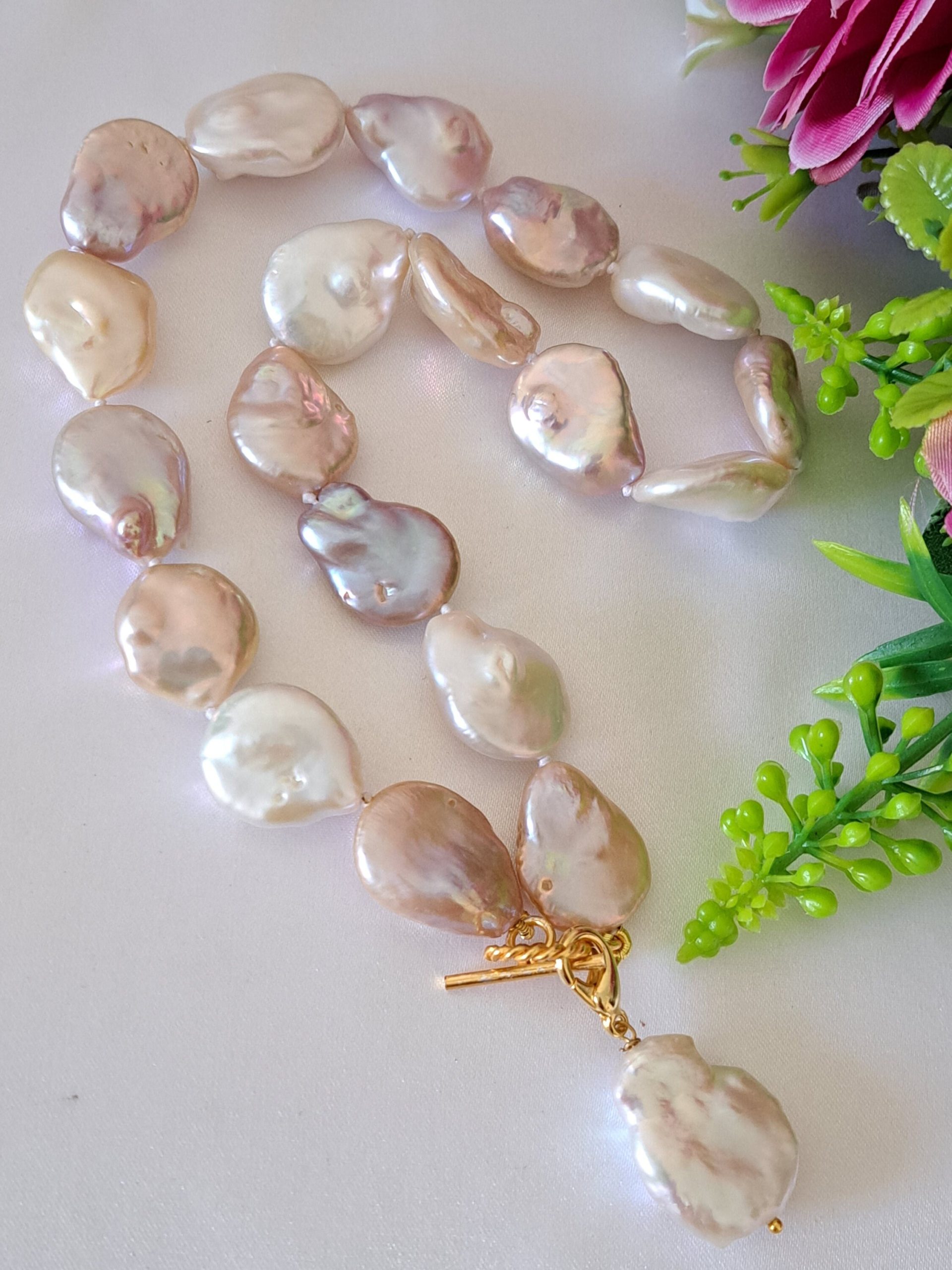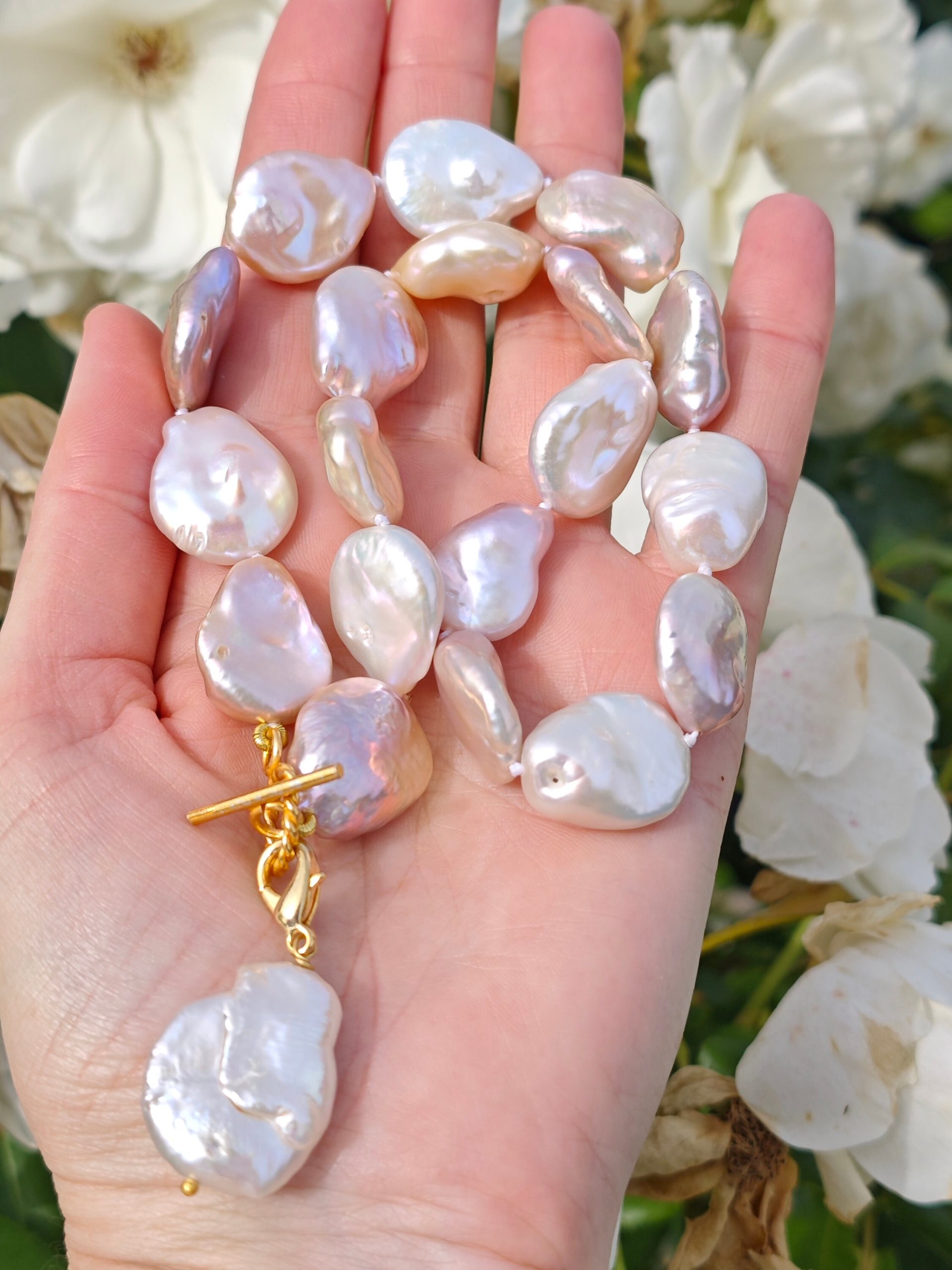 Collana girocollo annodata a mano con perle barocche bianche e rosa a goccia 2 cm dimensioni con pendente perla rimovibile.