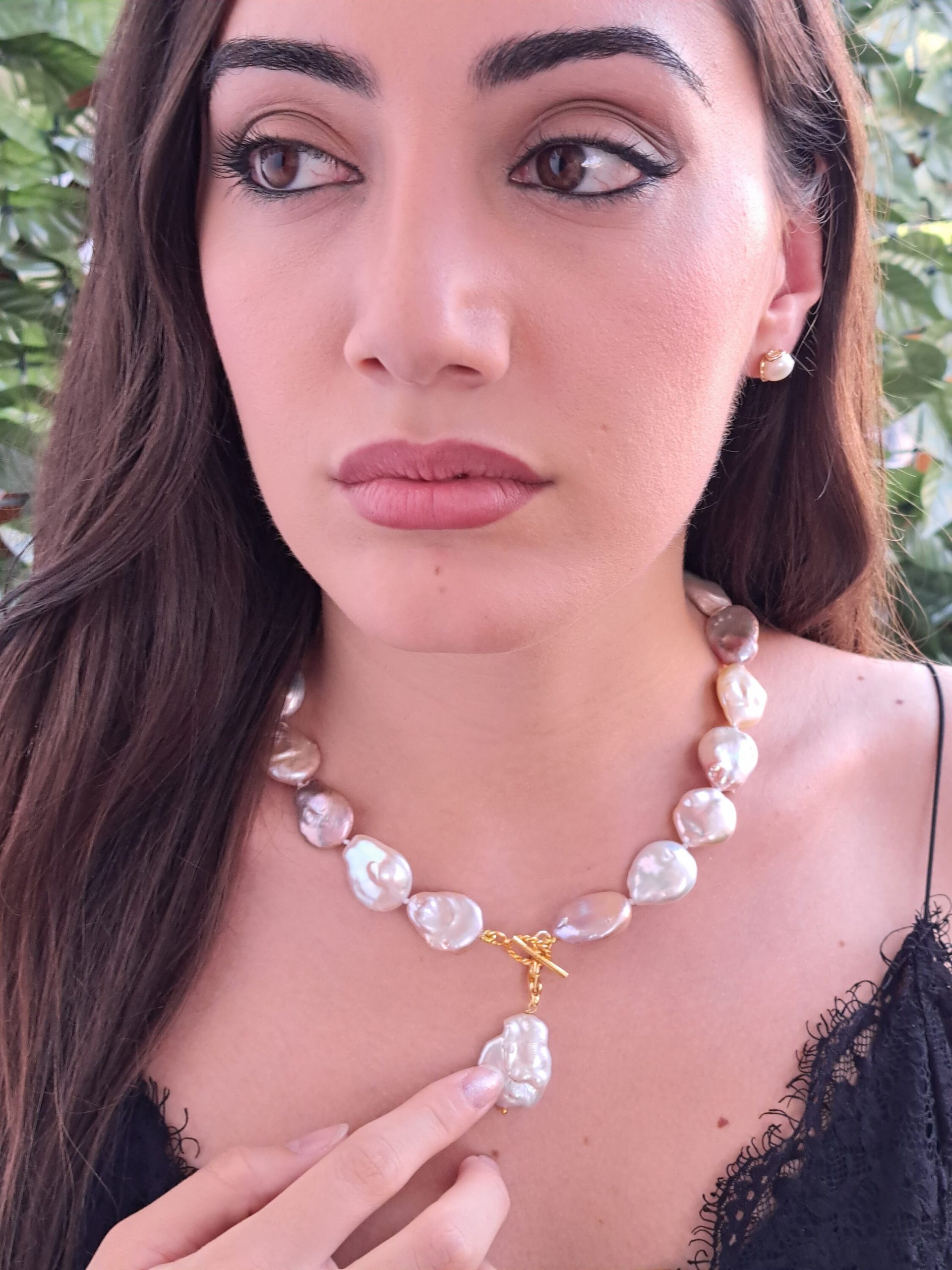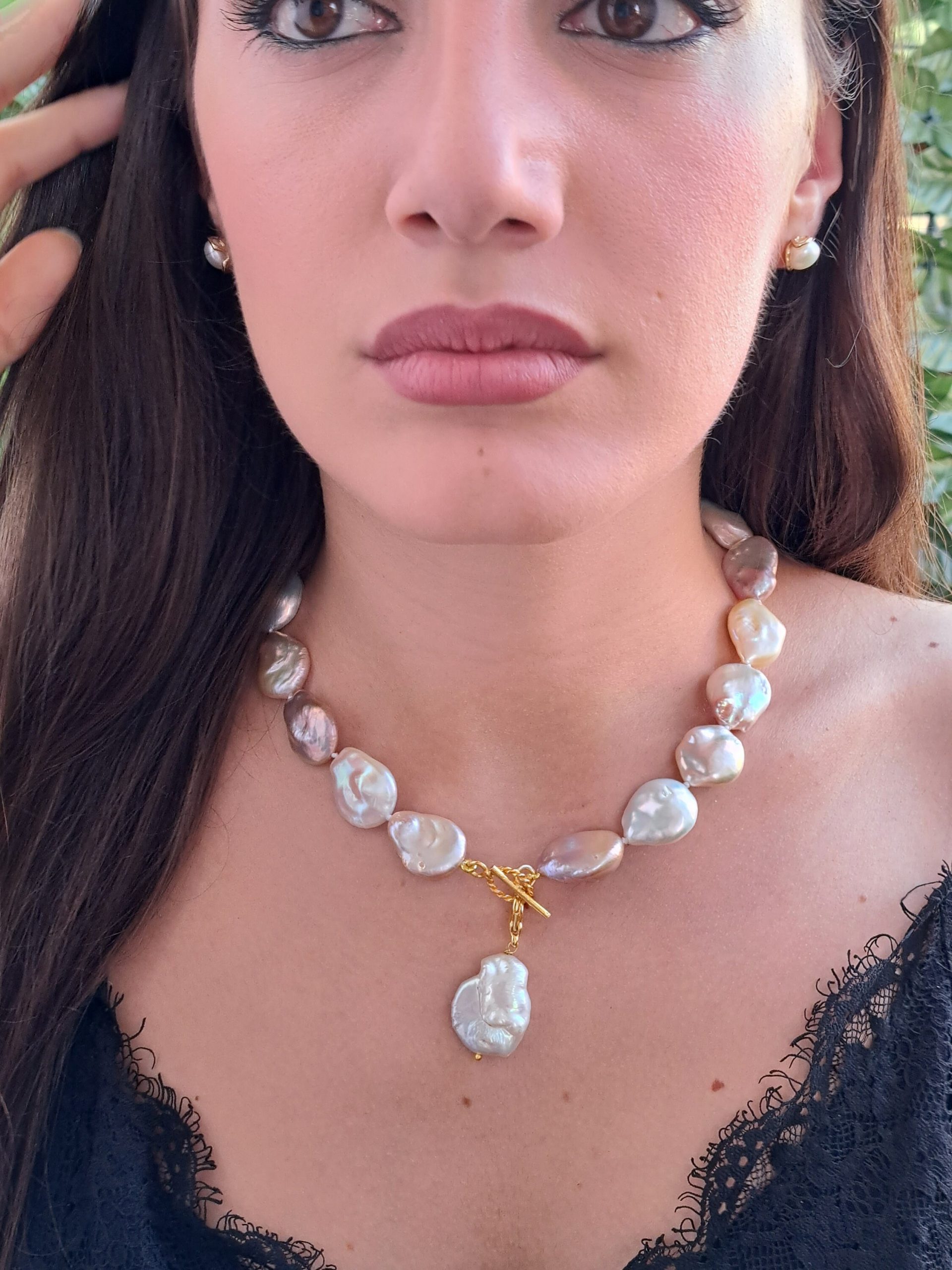 Set collana con orecchini  cammeo conchiglia con  perle barocche bianche in argento 925 placcato oro , gioielli italiani