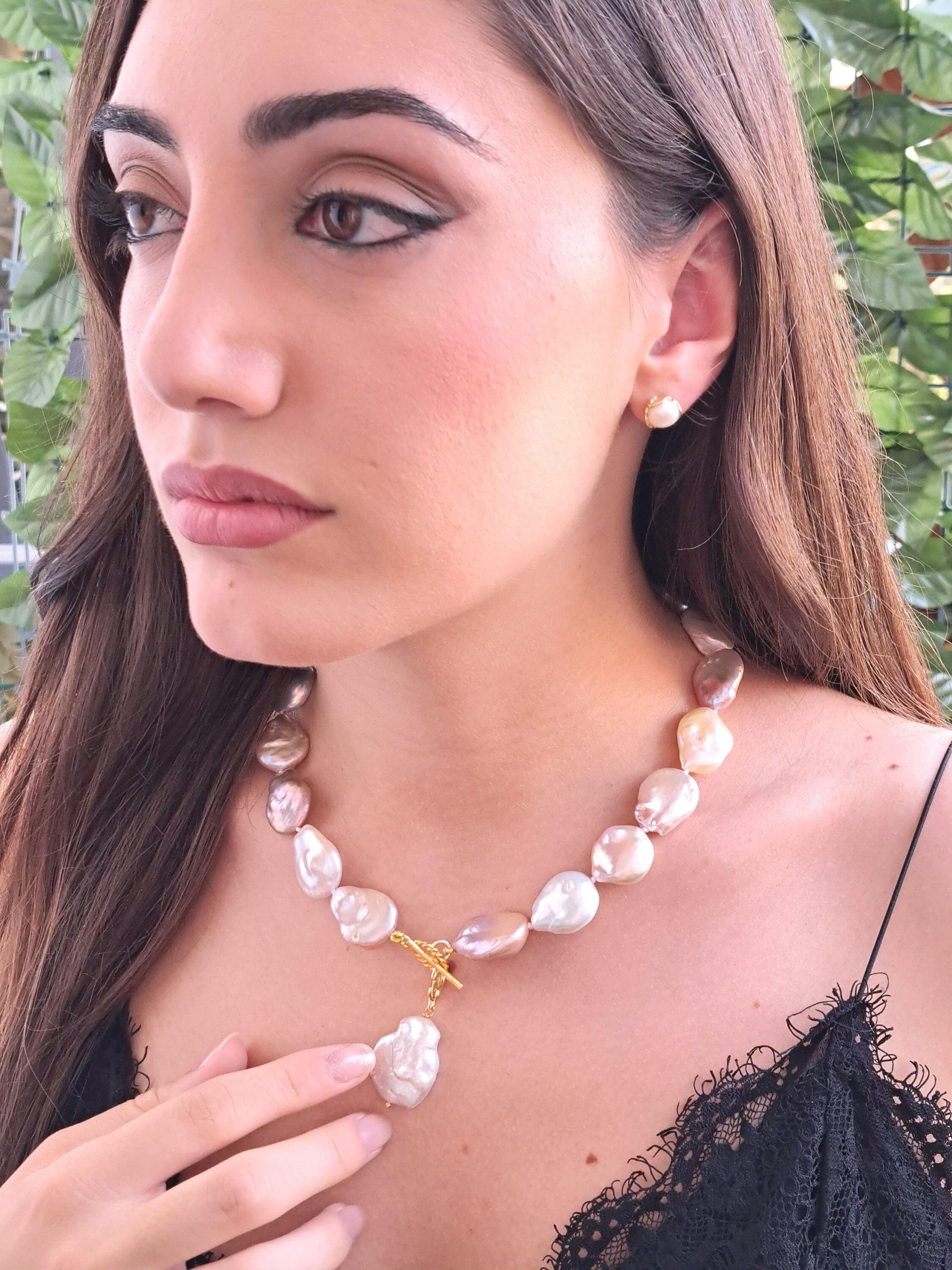Collana girocollo perle barocche bianche e rosa con argento 925 placcato oro, gioielli italiani