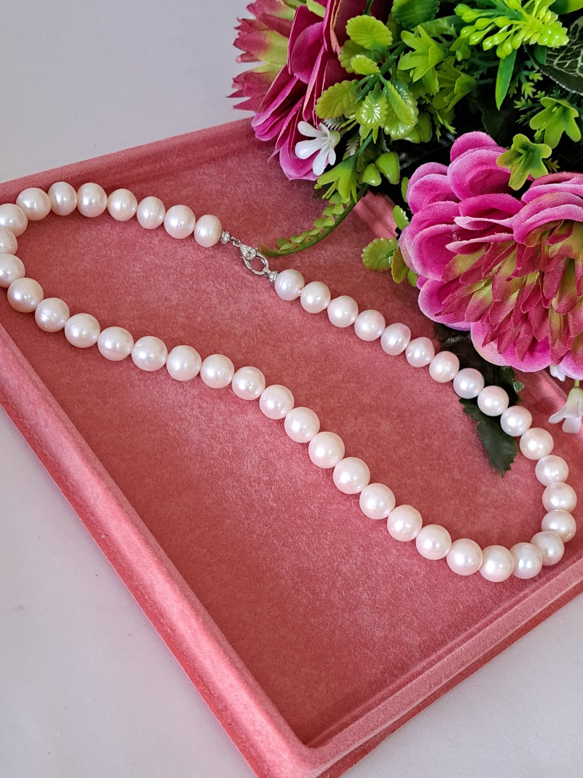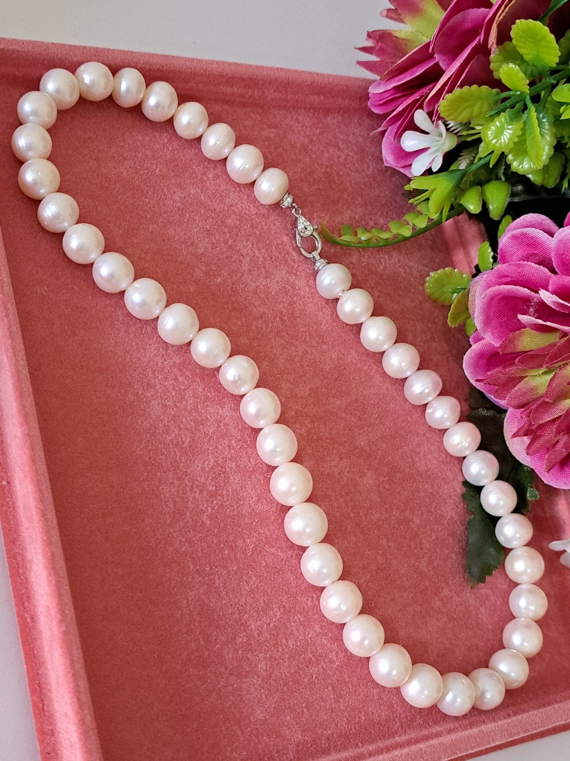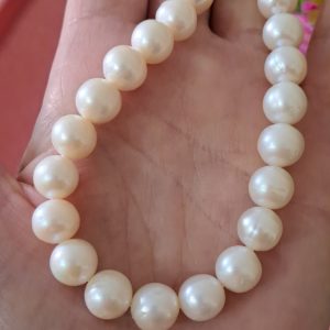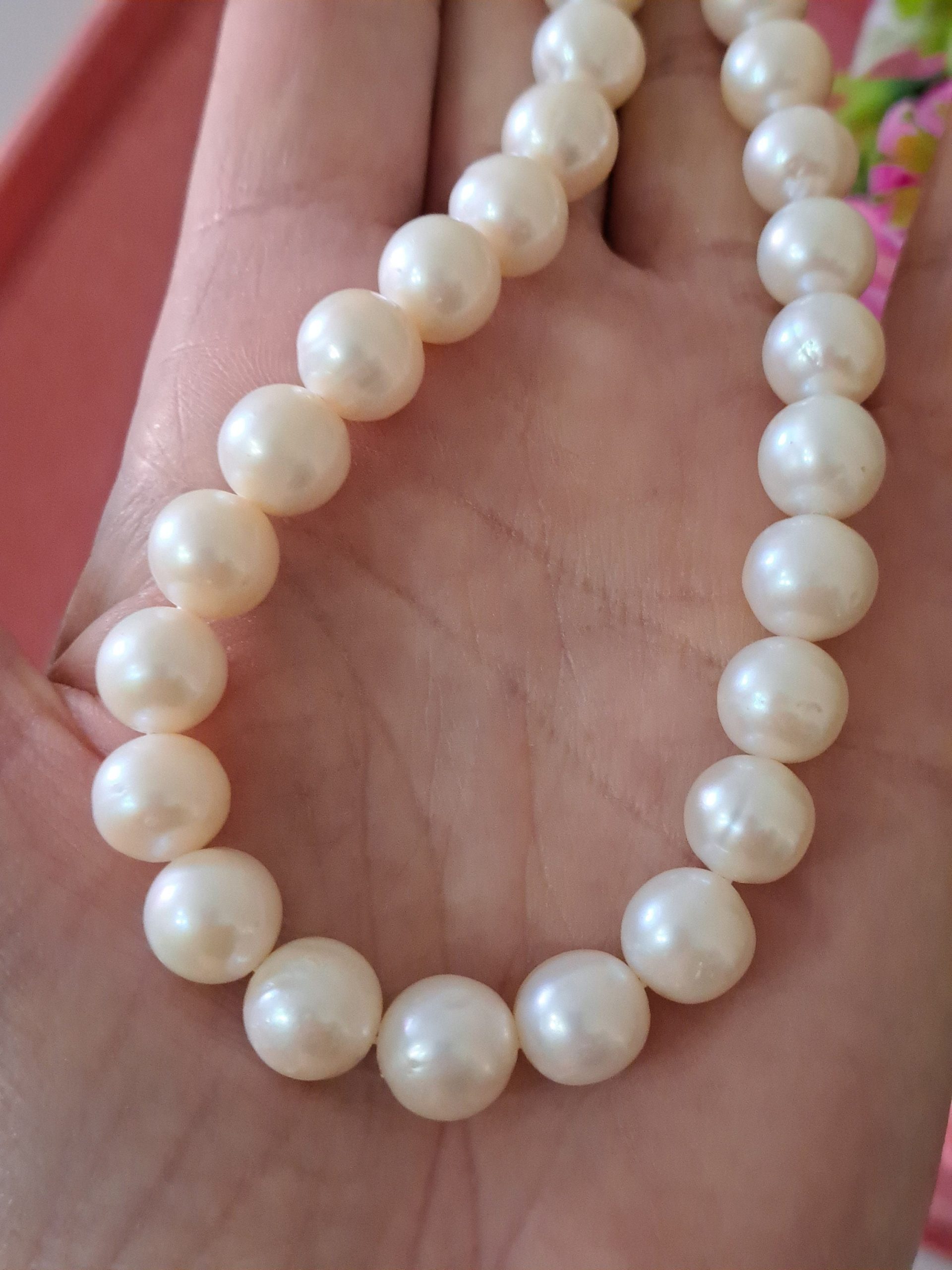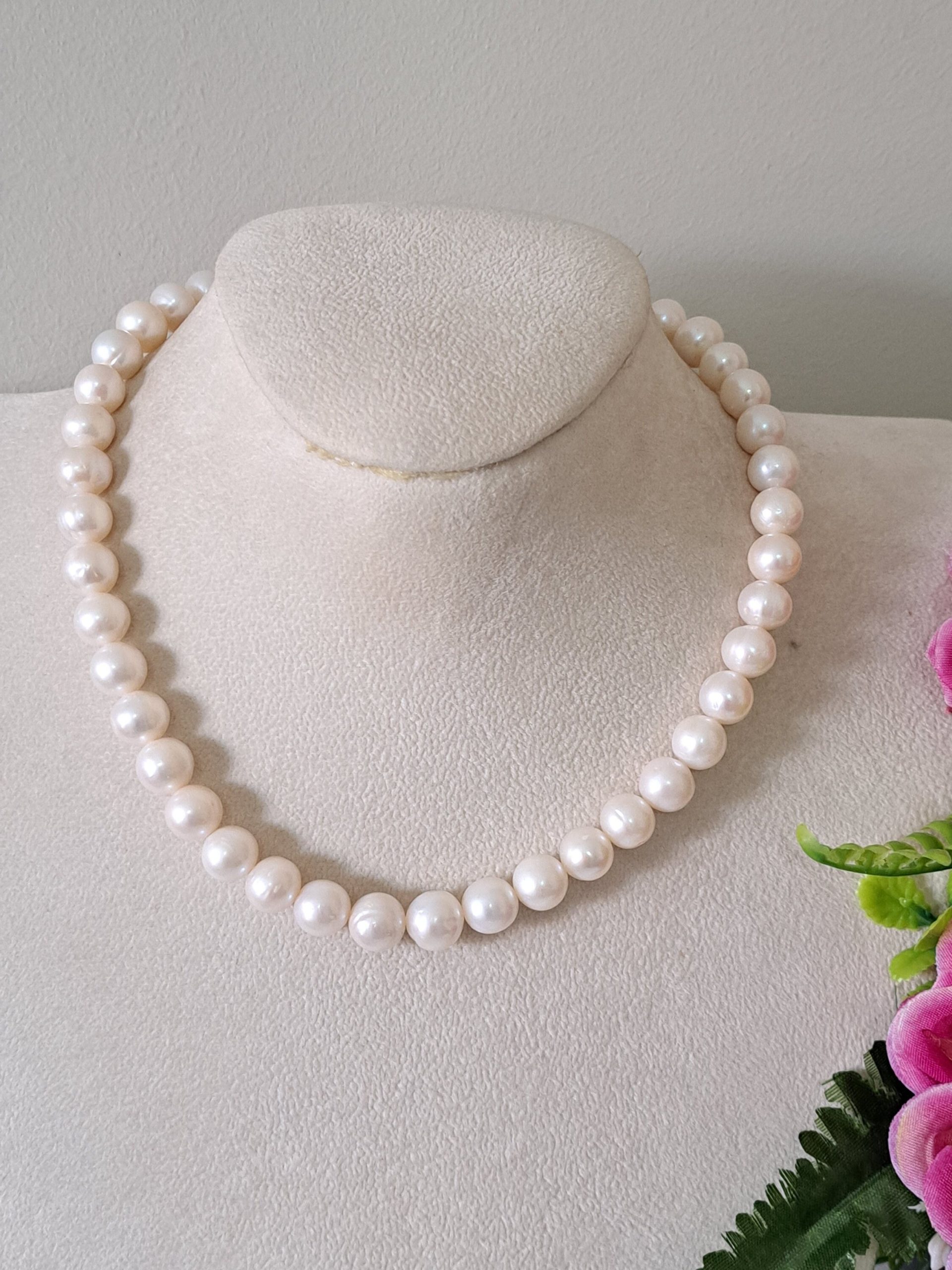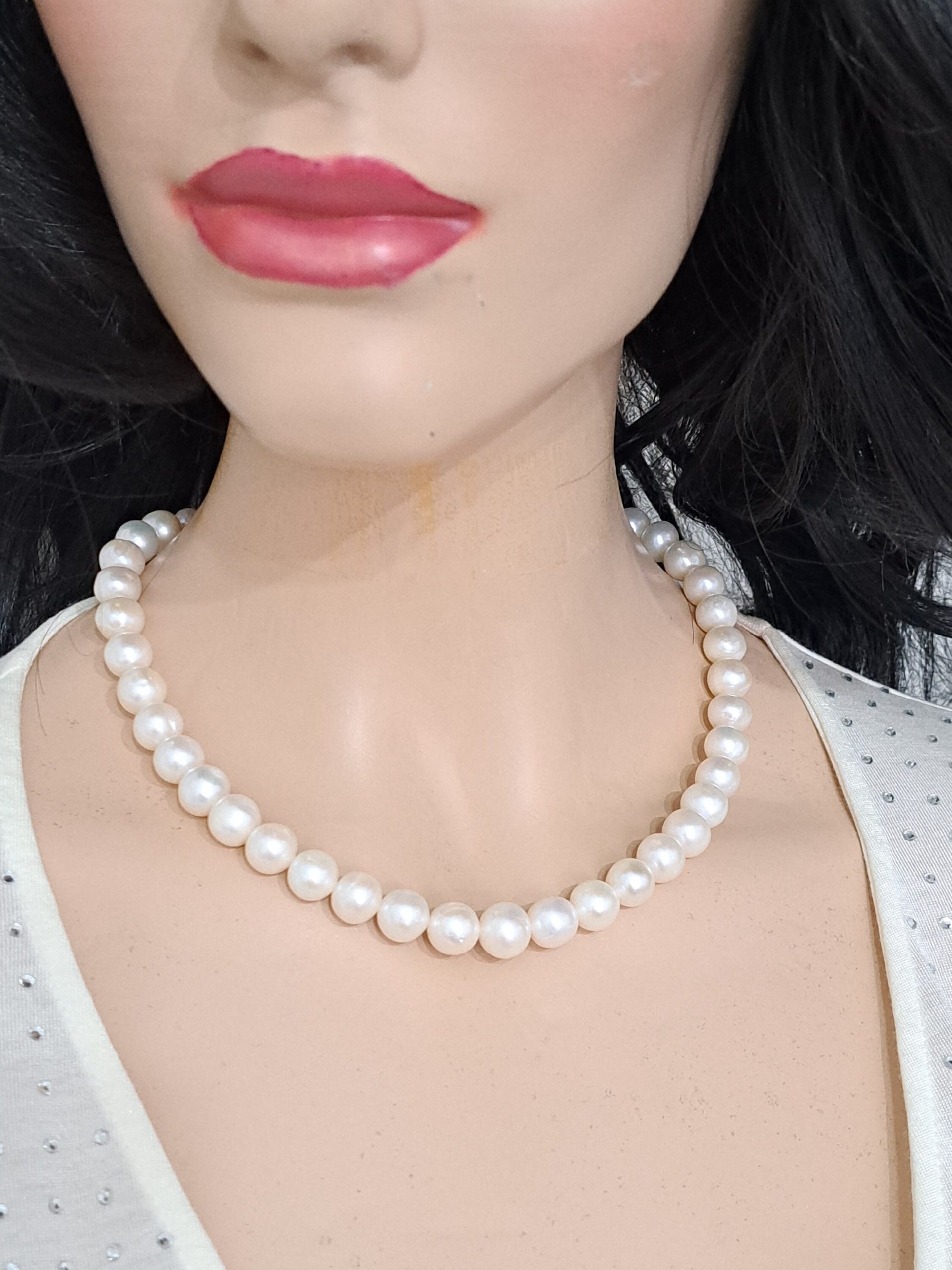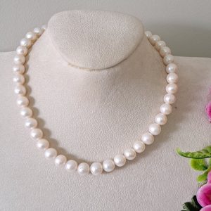 Collana girocollo annodata a mano con perle bianche 10 mm.