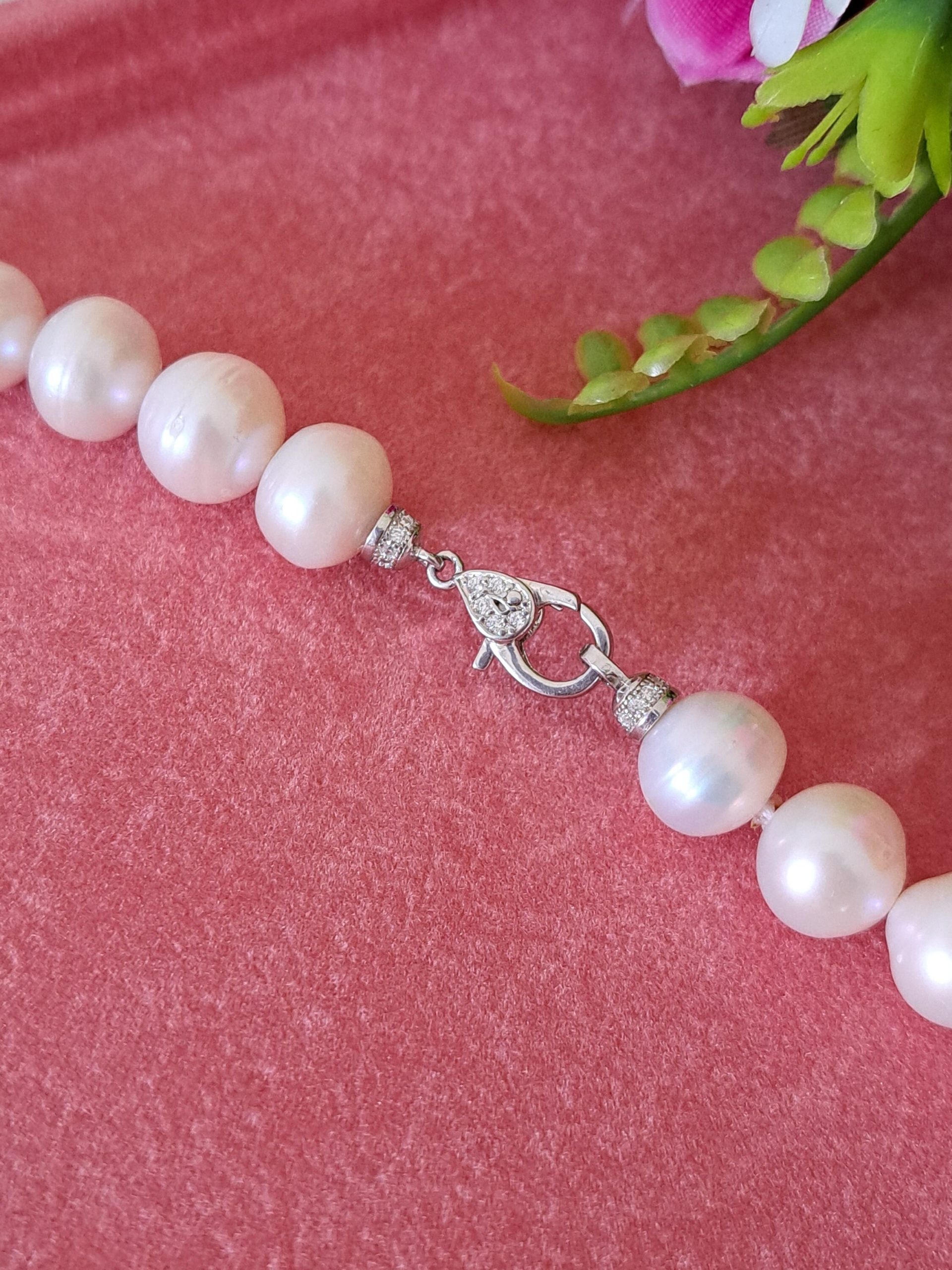 Collana girocollo perle bianche con argento 925 con zirconi, gioielli italiani