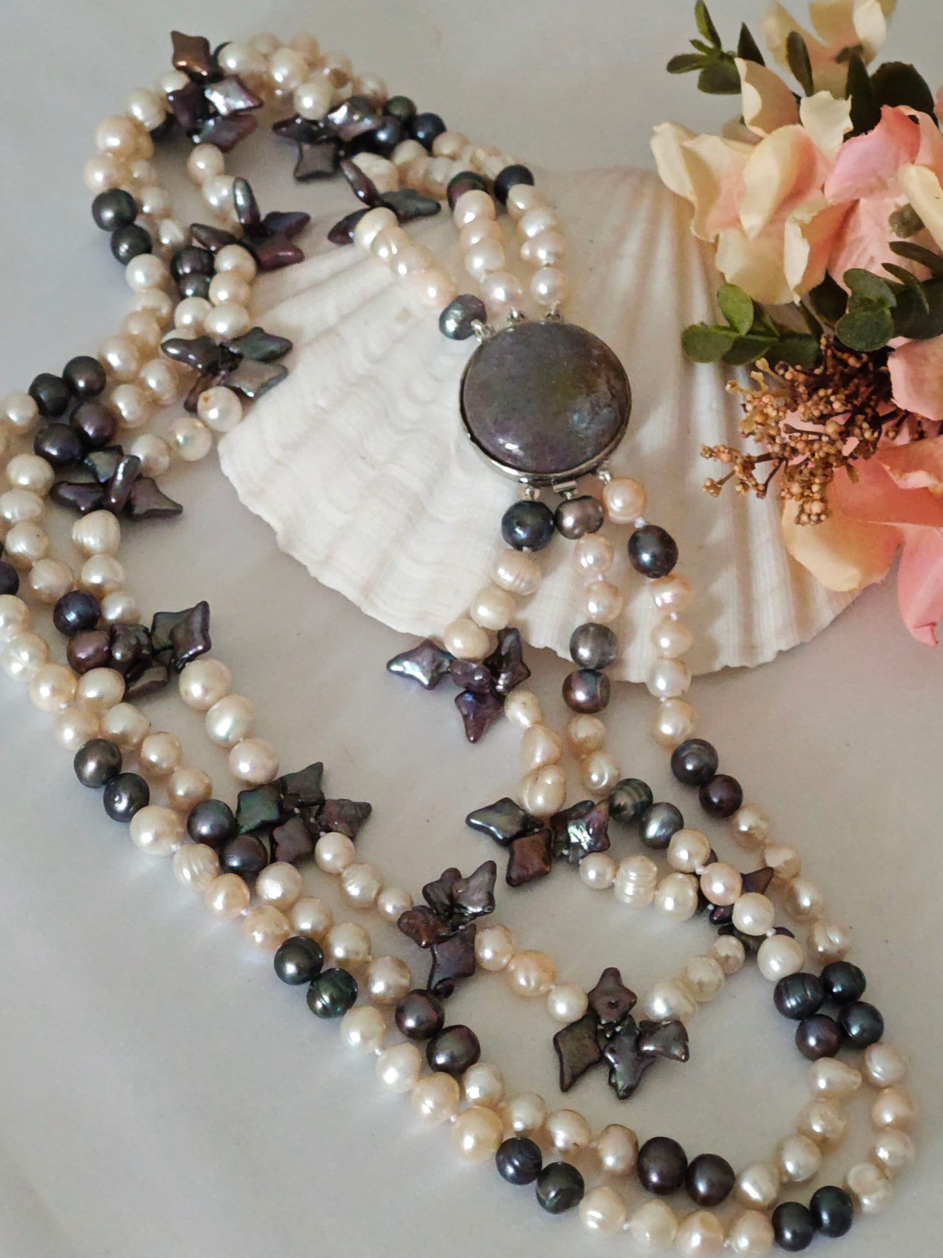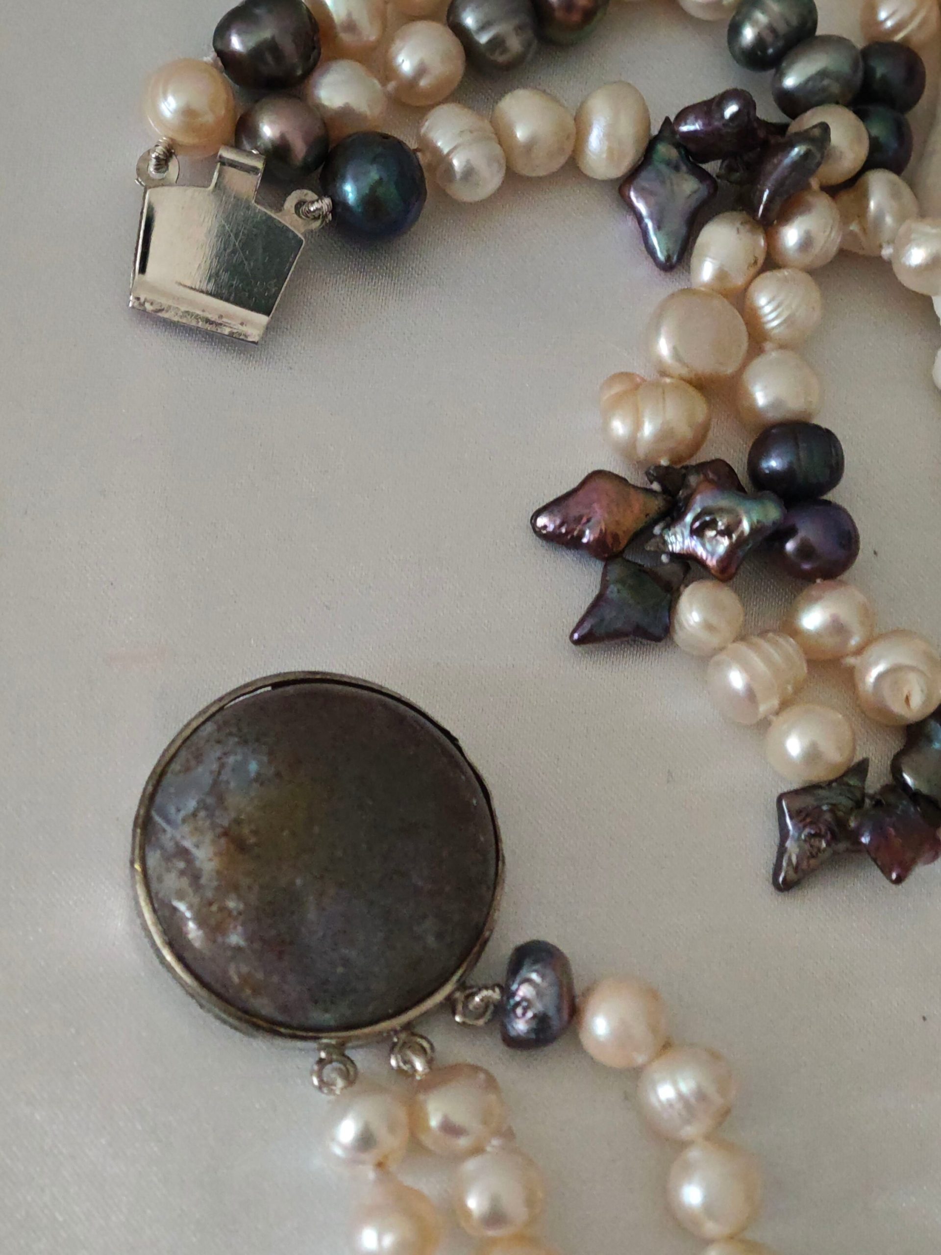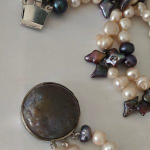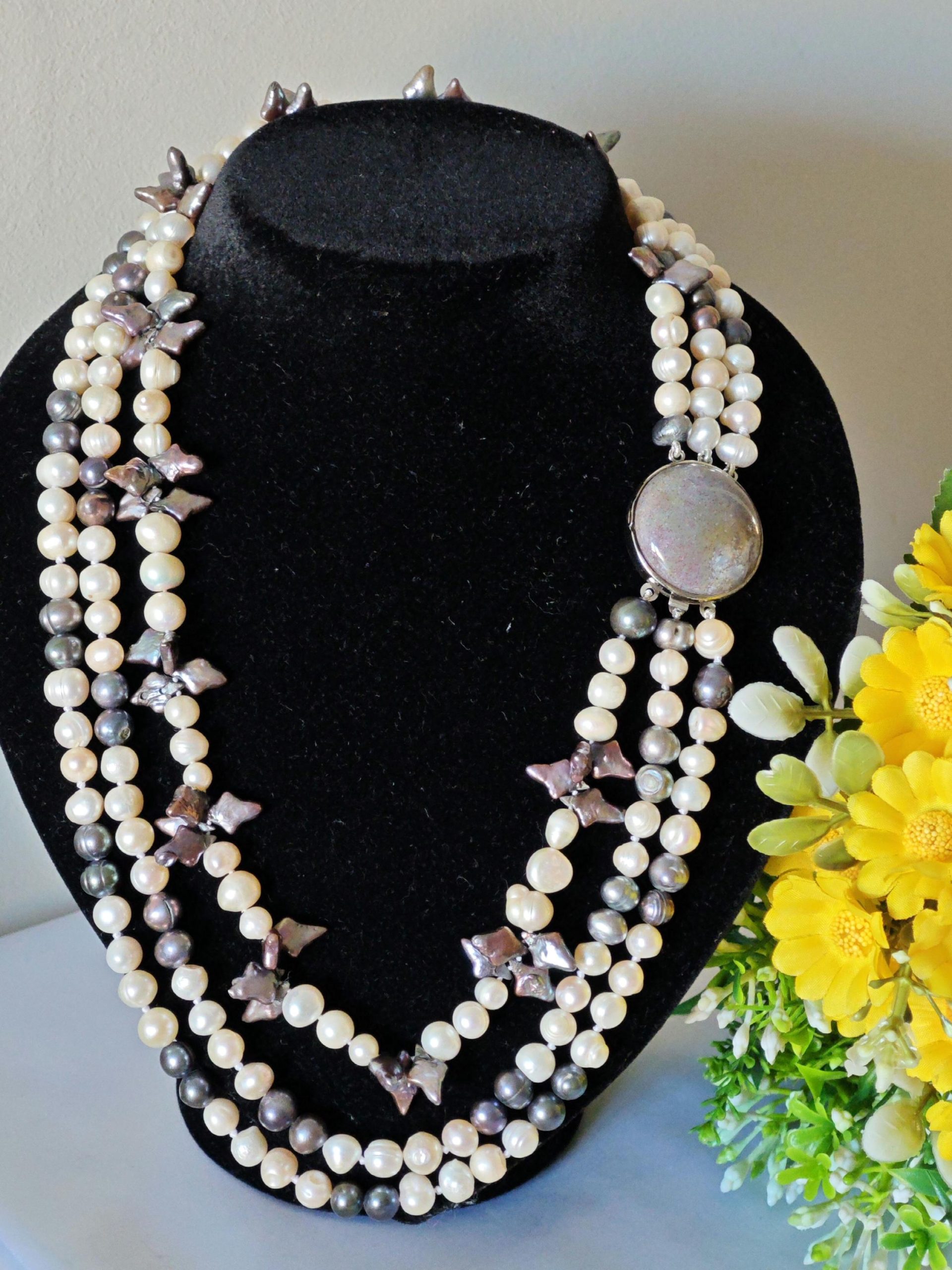 Collana a 3 fili annodata a mano con perle naturali di acqua dolce bianche 8 mm e grigie con chiusura gioiello stile vintage a clip .