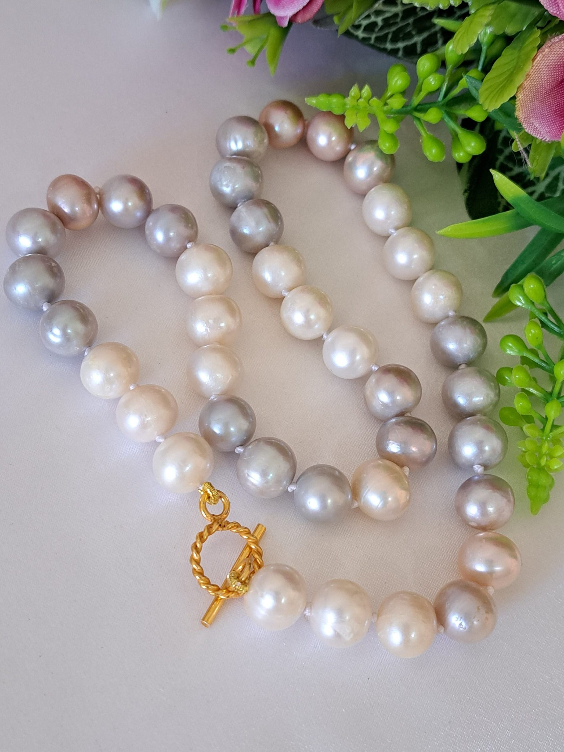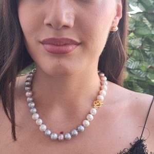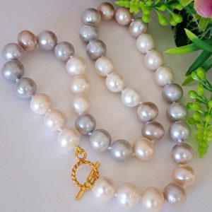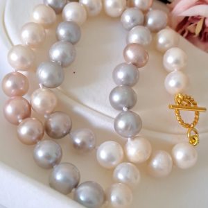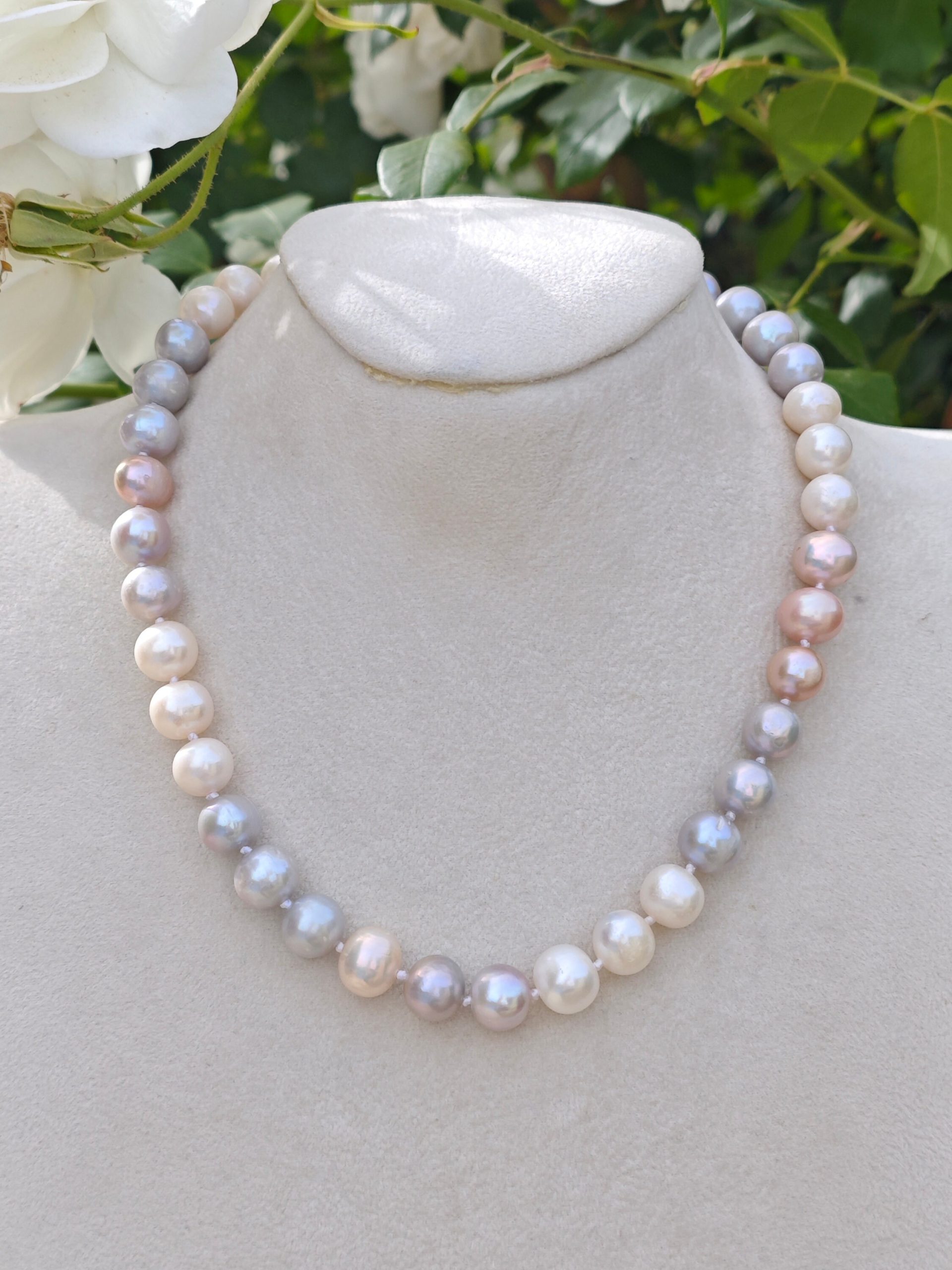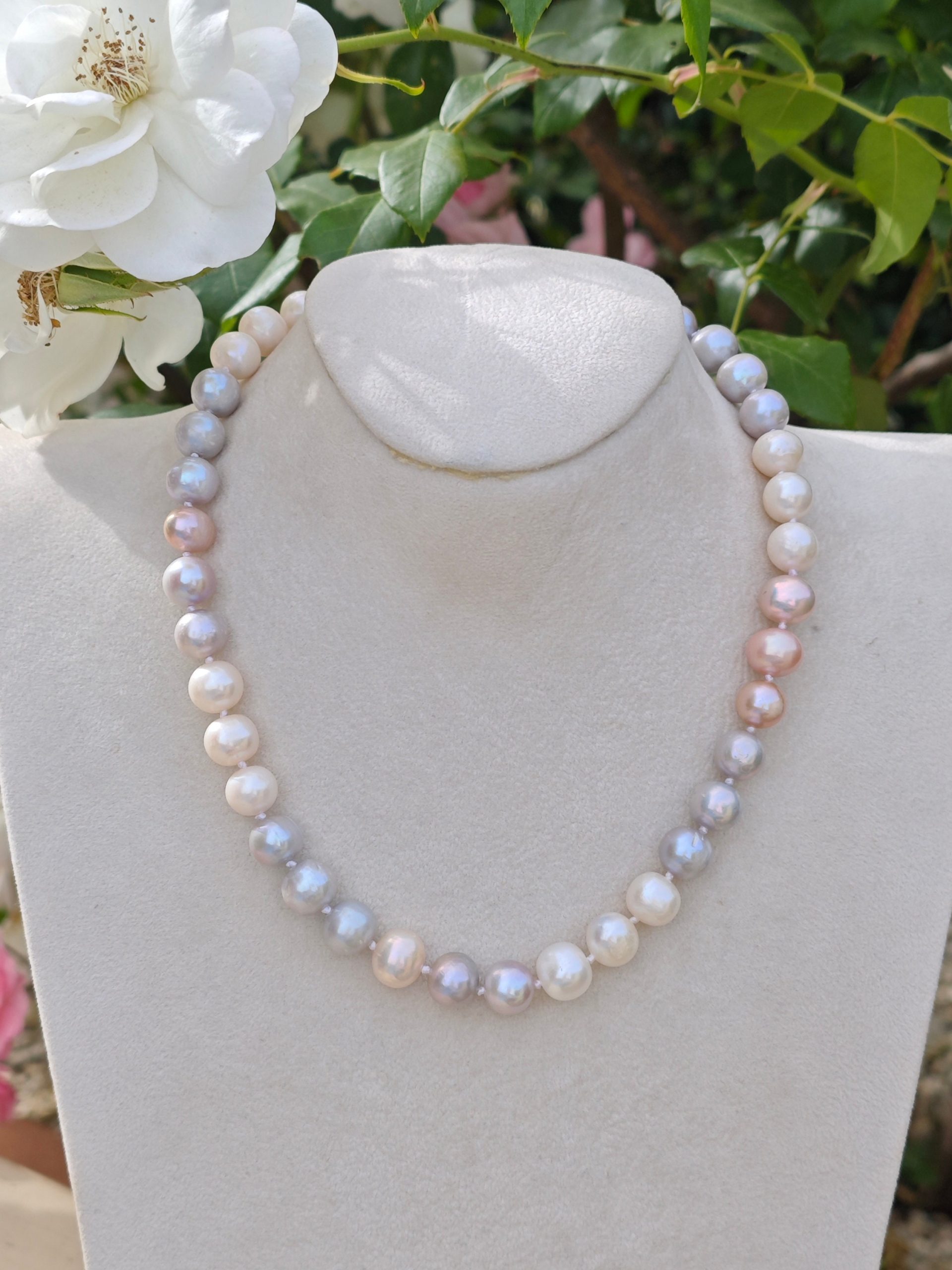 Collana girocollo annodata a mano con bellissime perle Edison bianche,grigio e rosa 10 mm .